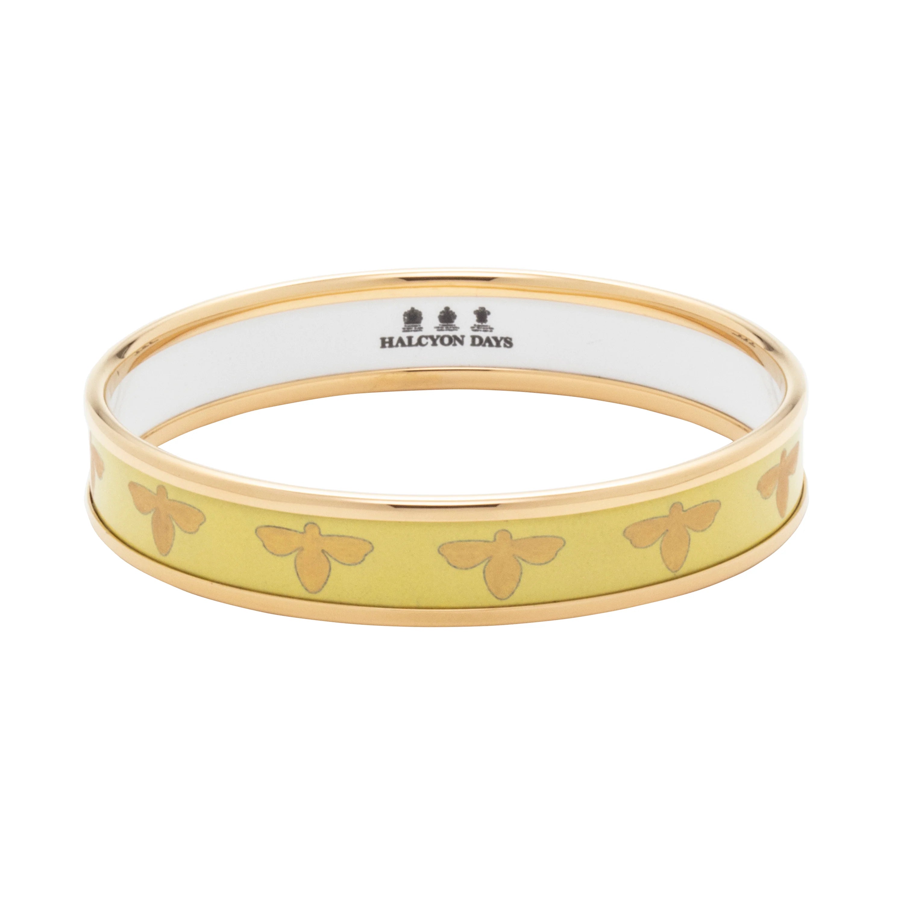 The Bee Bangle by Halcyon Days commands attention with its 1 cm width, crafted from brass and coated in 18ct gold plating. Featuring honey bee motifs set against a yellow enamel background, this bracelet slides smoothly onto the wrist. It can be styled solo or stacked for a layered look. A sophisticated piece that effortlessly shifts from daytime wear to evening elegance, it is ideal as a gift for nature lovers.
