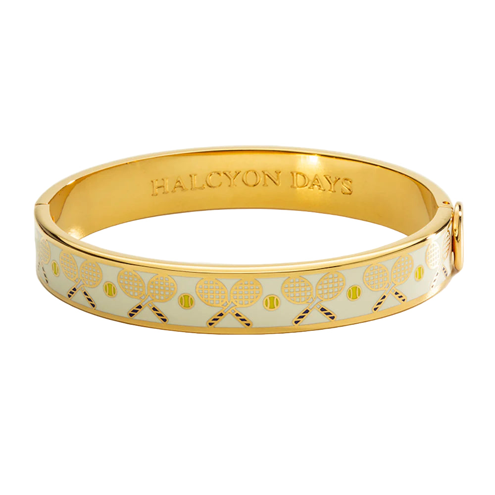 Our Tennis Racket and Ball bangle is 10mm wide and 18ct gold plated for an opulent finish. Featuring a hinge clasp and the Halcyon Days branding on the inside, this timeless design looks fabulous when stacked with other bangles or when worn individually.