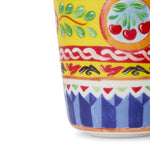 The beautifully crafted glass is made of exquisite porcelain and boasts a stunning decorative motif inspired by the Carretto Siciliano's folkloric traditions, landscapes, and vibrant colors. Reflecting the heart of Dolce&Gabbana's aesthetics, the intricate designs are carefully applied through a three-step firing process, resulting in a durable and uniform finish. This cup is highly resistant to scratches and abrasions, thanks to its expertly chosen production technique.