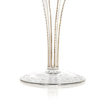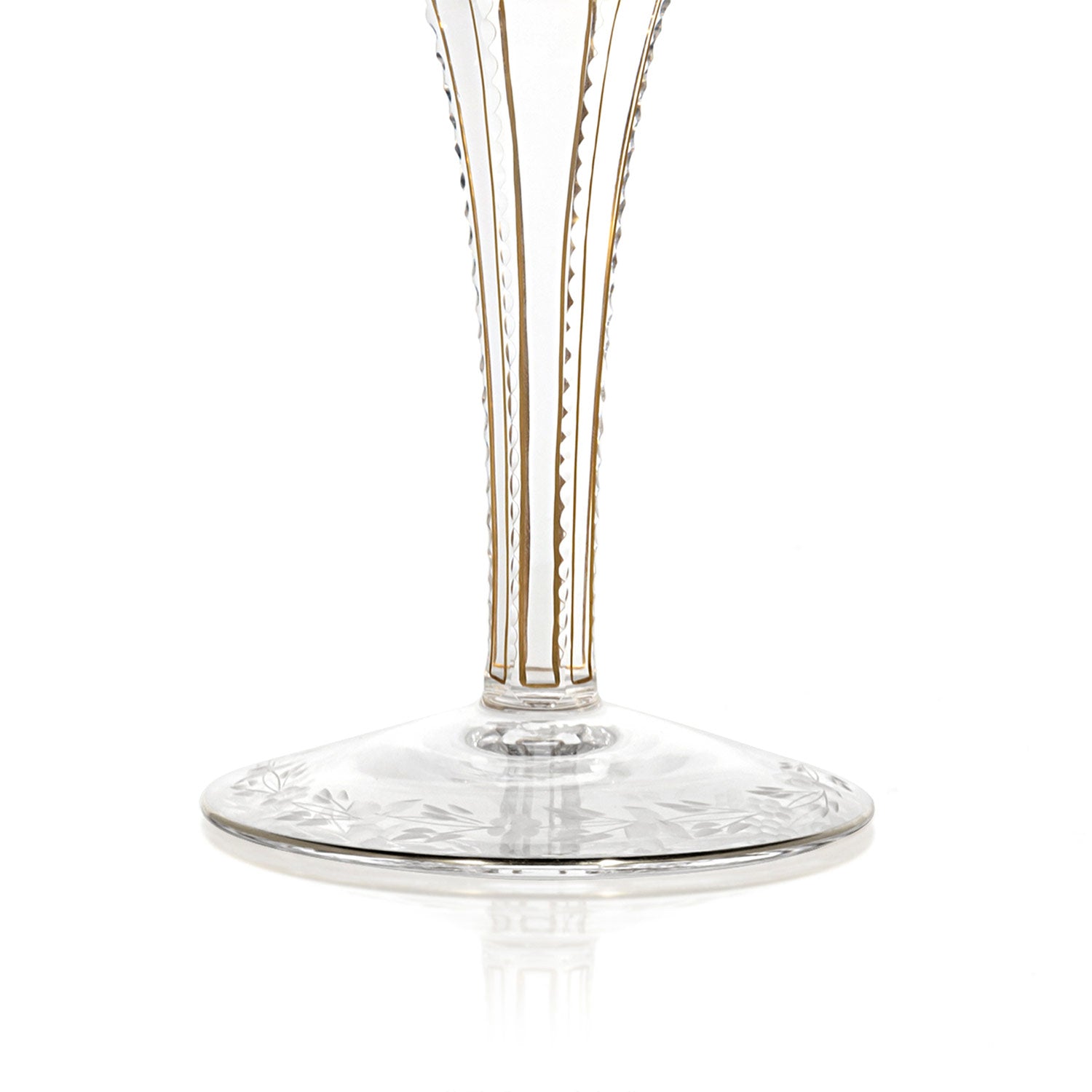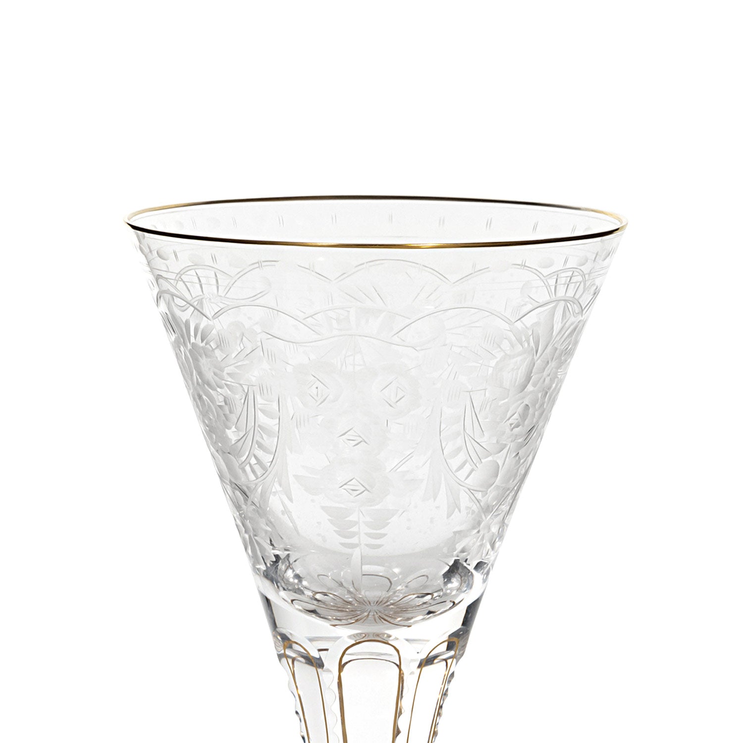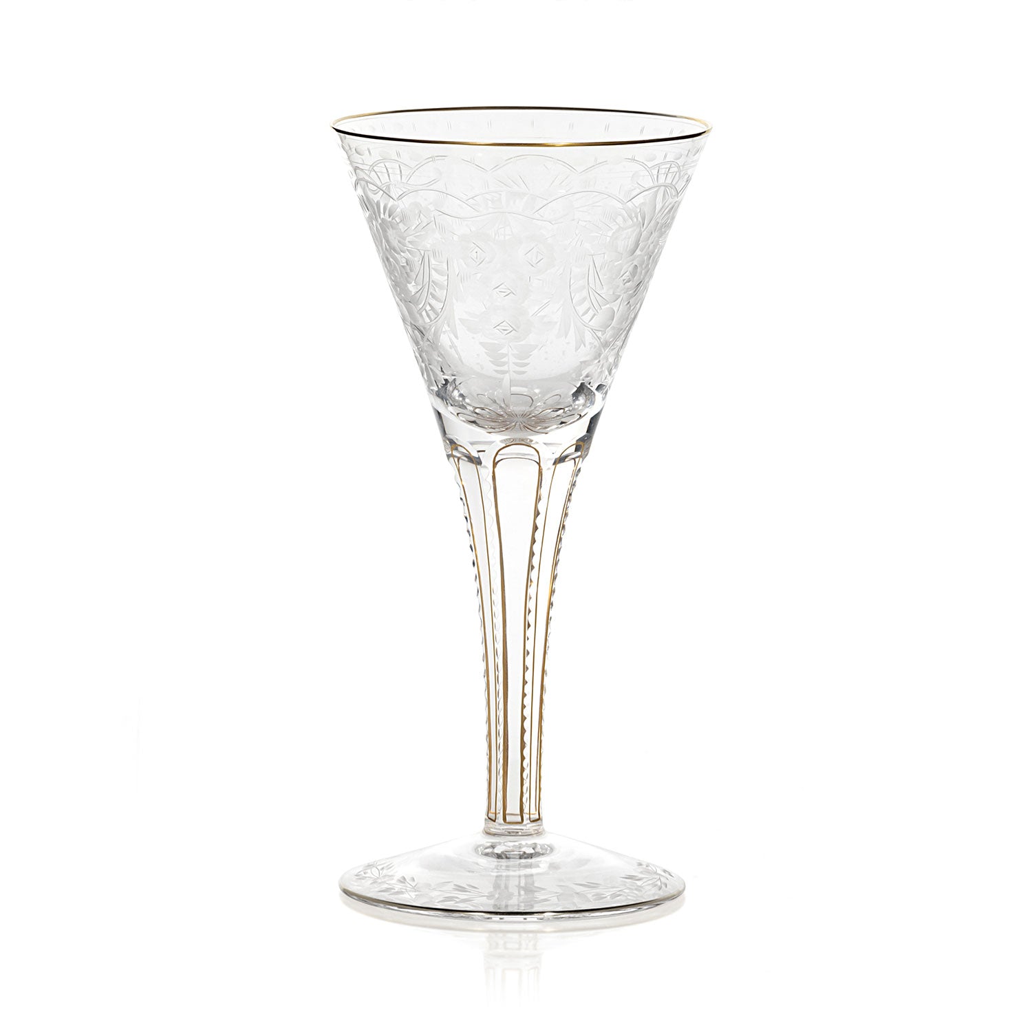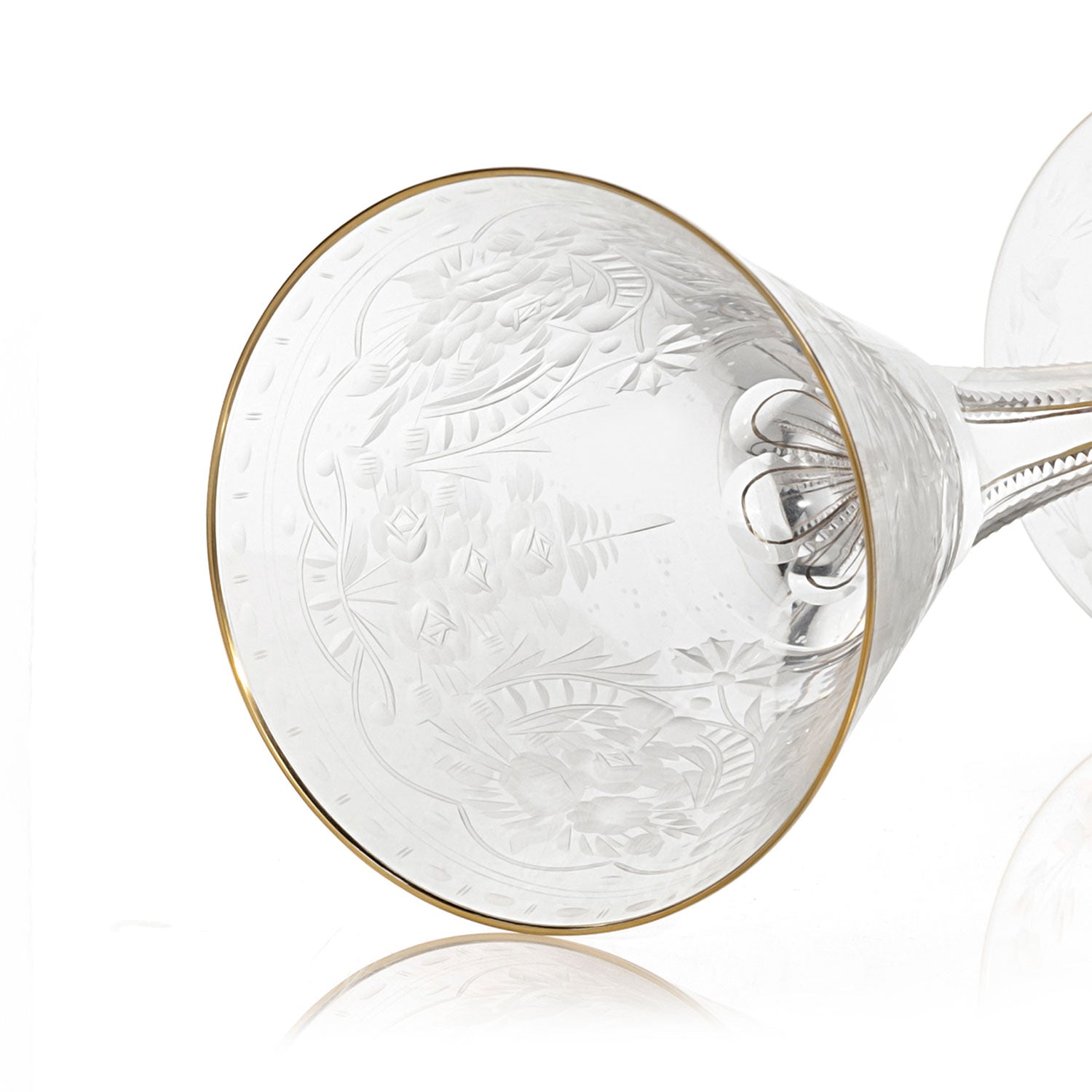 Moser's Maharani Goblet is a stunning lead-free crystal glass, designed in 1895 and popularized by the Maharaja of Navancore for his wife, the Maharani. This show-stopping pattern features cascading flora on a flute-shaped goblet, copper wheel engraved motifs, pearlized cut stems, and 24K gilding. Its beautiful and regal design leaves a lasting impression, making it a perfect addition to any elegant table setting.