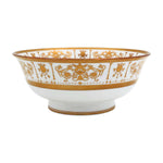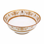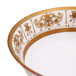 Handmade in Stoke-on-Trent, the Chalsea Bowl Florette is a fine bone china piece adorned with 24K gold. The bowl features intricate hand-painted designs with a bold stripe and golden accents, including the rim and stand ring. This ornate Regency-style bowl can serve as a decorative accent or a functional crockery article. The combination of luxurious materials and meticulous craftsmanship ensures that the Chalsea Bowl Florette adds a touch of elegance and sophistication to any table setting.