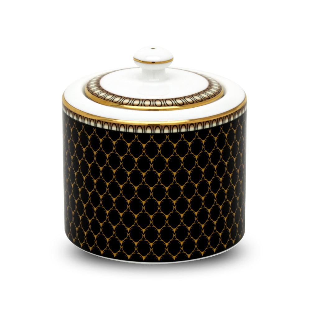 Indulge in timeless elegance with the Black covered sugar bowl from the Antler Trellis collection. Handcrafted from fine bone china, the deep black finish enhances the intricate antler trellis design for a striking, sophisticated look. Perfect for both everyday luxury and special occasions, this piece embodies heritage craftsmanship and refined style.