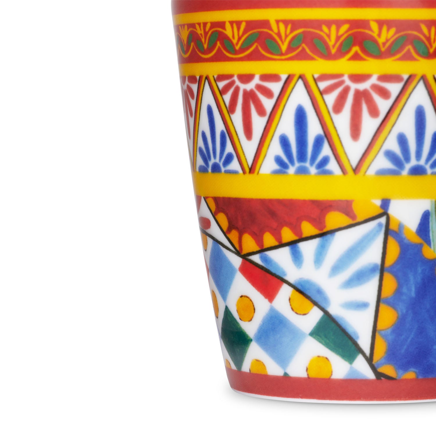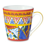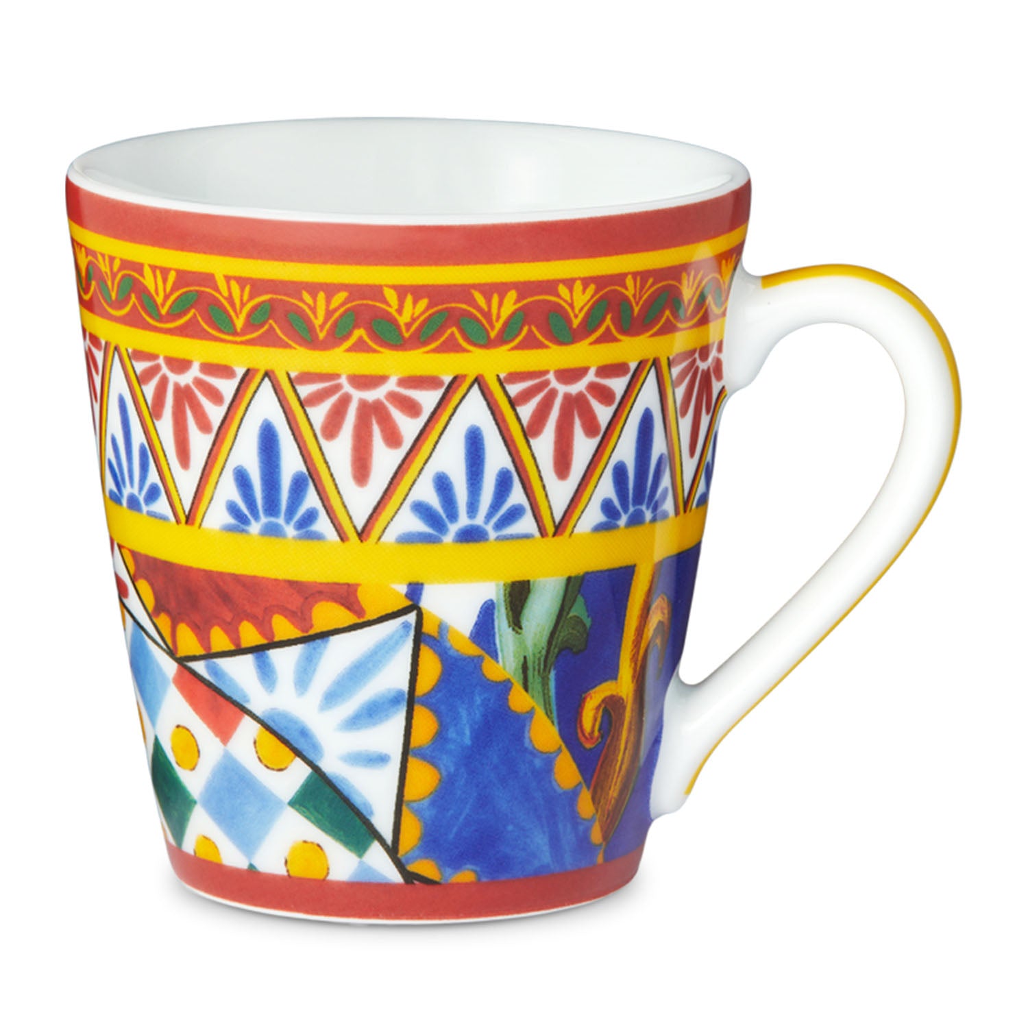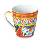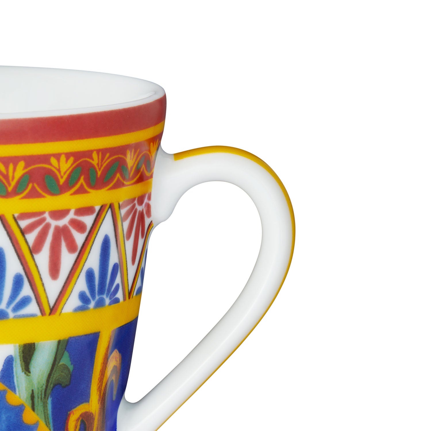 This exquisite porcelain mug is adorned with a beautiful pattern inspired by a traditional Italian folk art called the Carretto Siciliano. The design captures the essence of Sicily, with its rich history, vibrant colors, and skilled craftspeople. It's the perfect choice for those who want to add a touch of luxury to their daily routine and express their unique personality through a stunning table setting. The mug features the brand's logo on the bottom and intricate raised details created by skilled artisans using a brush and clear glaze. Crafted with the utmost care and precision, this mug is incredibly durable and resistant to scratches and wear.