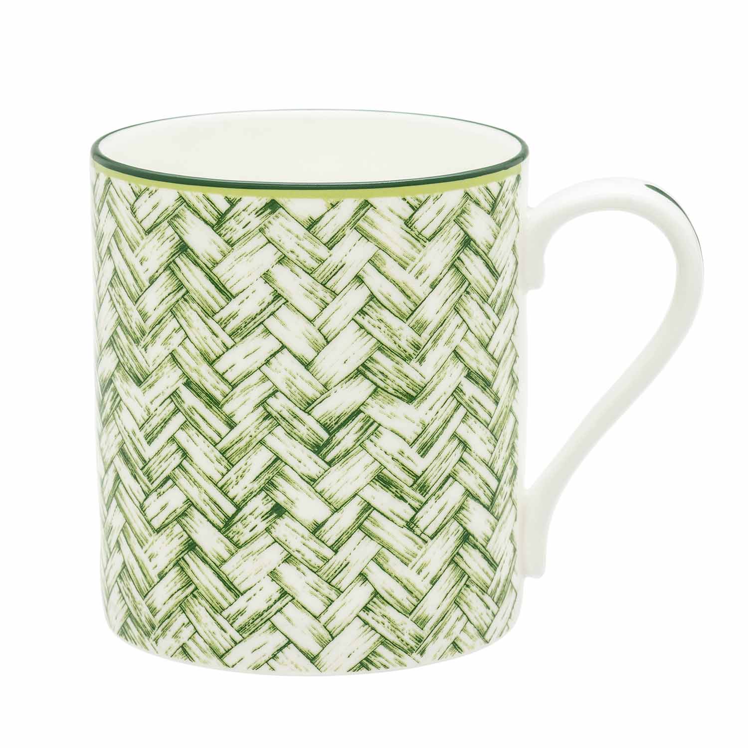 This Mug featuring the stylish Green Basket Weave design is the ultimate vessel for your afternoon hot beverages, perfect for gifting or for use in your own home. Luxurious and elegant, it has been crafted from the highest quality English fine bone china by our expert artisans in Stoke-on-Trent, England.