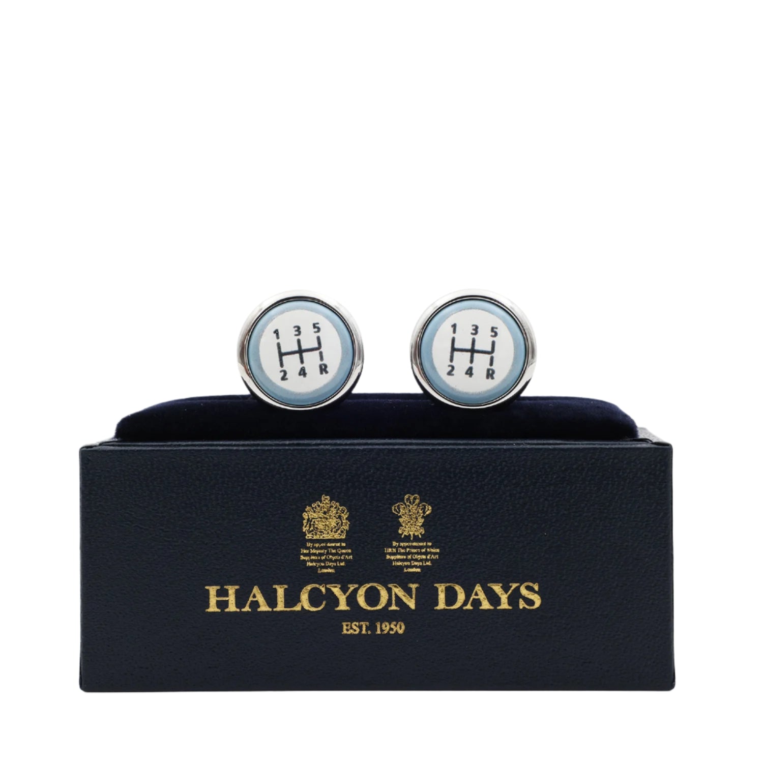 These cufflinks featuring a gear stick illustration are playful and quirky in their style and beautifully designed. A must for any gentleman's cufflink collection. With palladium plate and enamelled by hand, these cufflinks are a high quality piece of craftsmanship which represent the best of an artisan British craft.