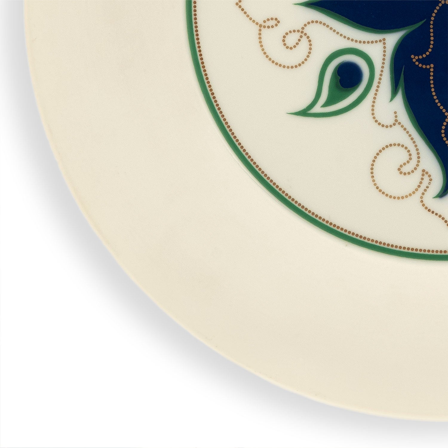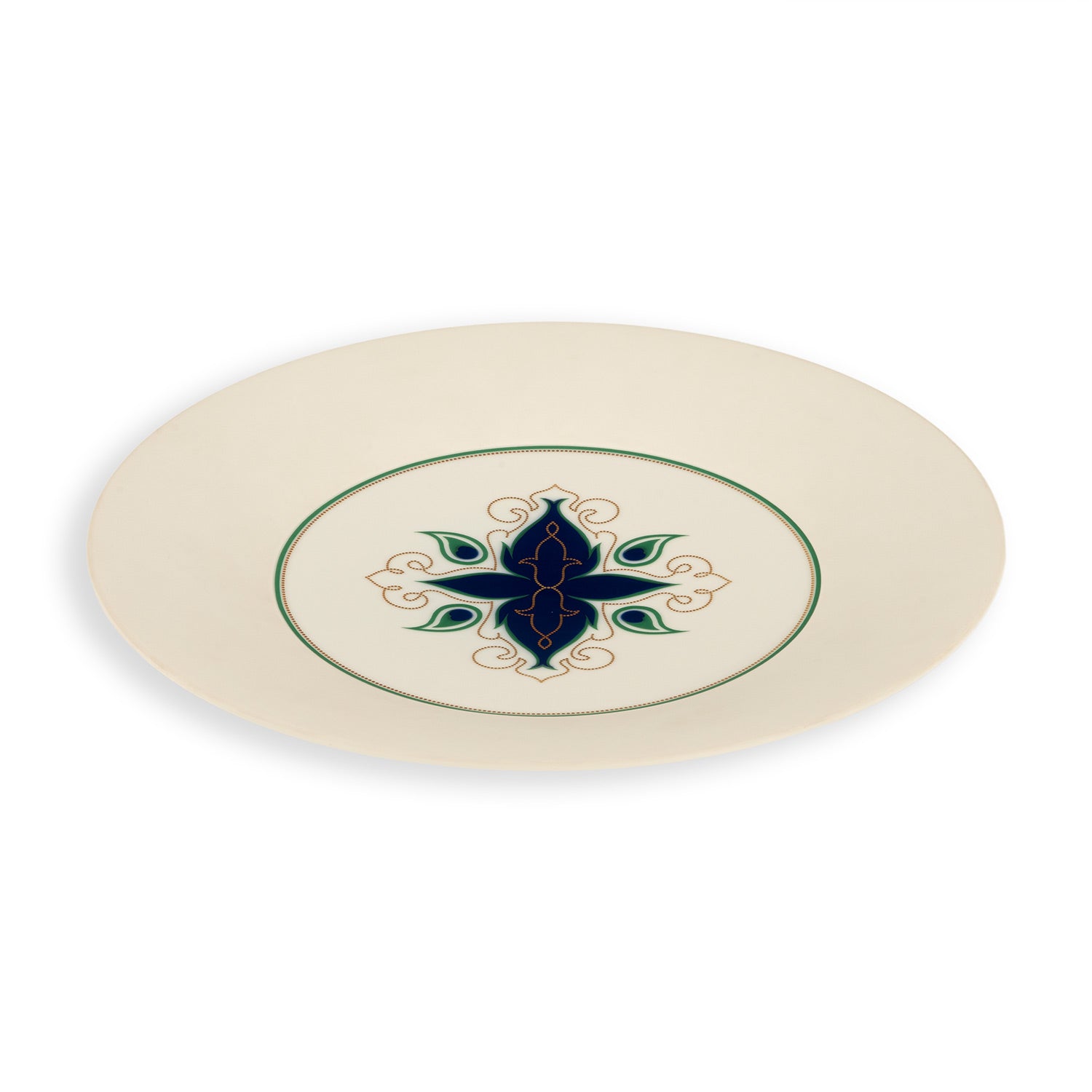Presenting the Alif Blue-Gold Dinner Plate, a masterpiece in bisque porcelain. This finely polished plate features exquisite cobalt and gold details, enhancing its luxurious appeal. The traditional pattern in the center, adorned with 24k gold paint accents, adds a touch of elegance. While ideal as a presentation plate, it doubles as a stunning showpiece when displayed on a stand near your crockery cabinet. Perfect for impressing guests and receiving compliments, this plate combines beauty with functionality, elevating your dining experience with timeless sophistication.