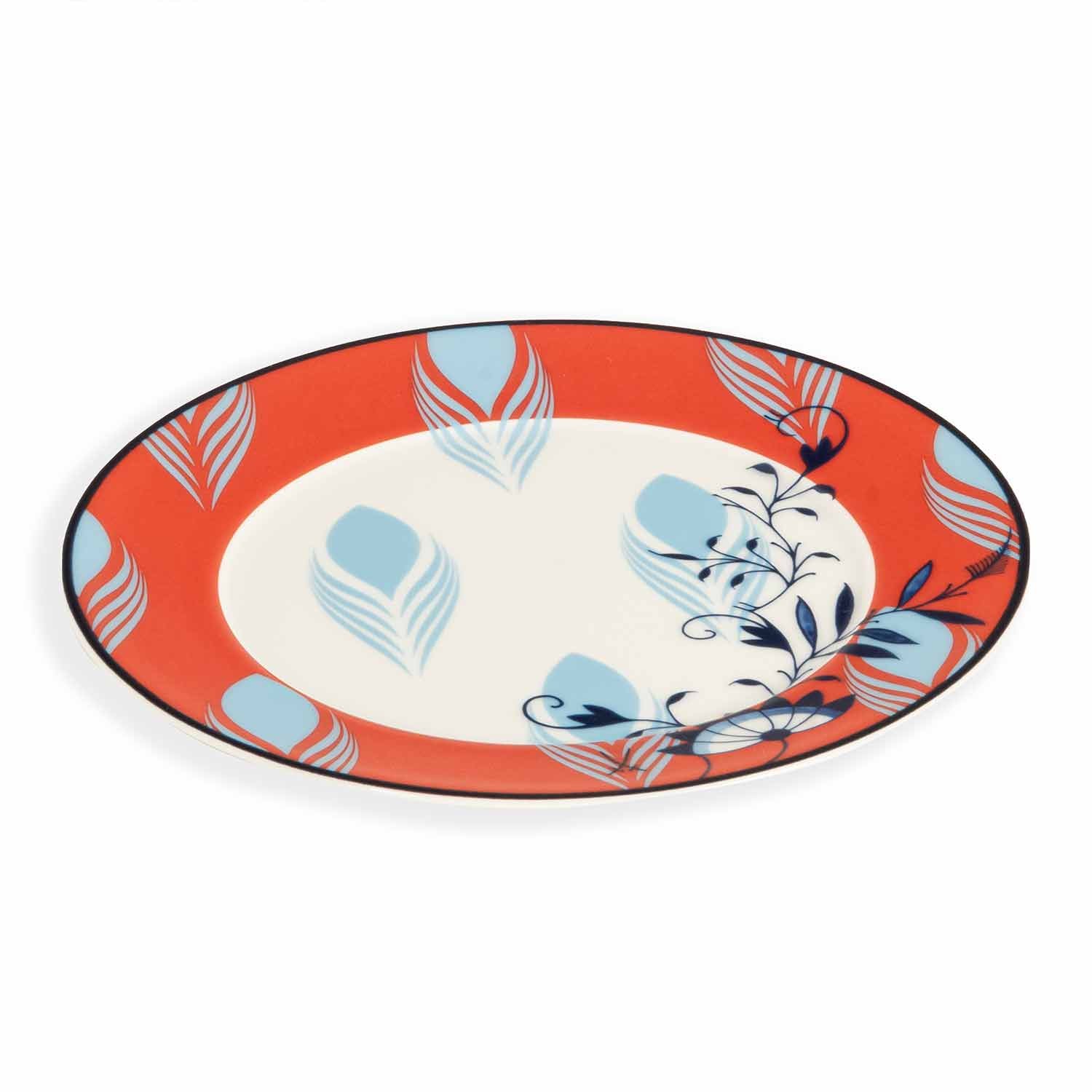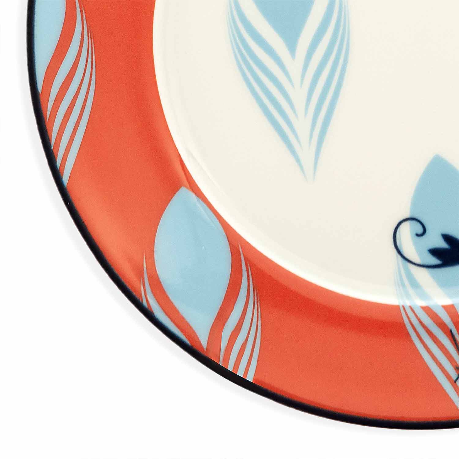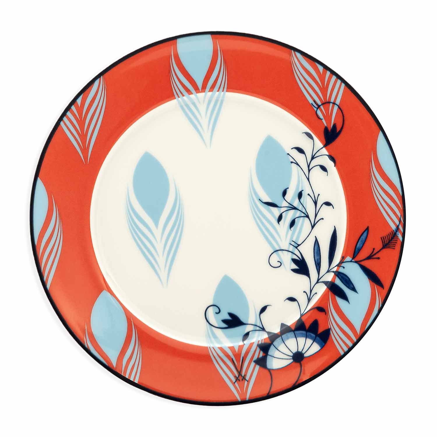 The Bloomy Red Feathers Plate measures 17 cm, handcrafted from premium materials, showcasing vibrant red and blue accents that evoke a rustic, natural charm. Its intricate design is Ideal for formal dining settings and relaxed picnics, and it adds an elegant touch to any table. Perfectly suited for serving main courses, this plate blends artistic flair with practical functionality, enhancing dining experiences with its unique blend of colors and nature-inspired motifs.