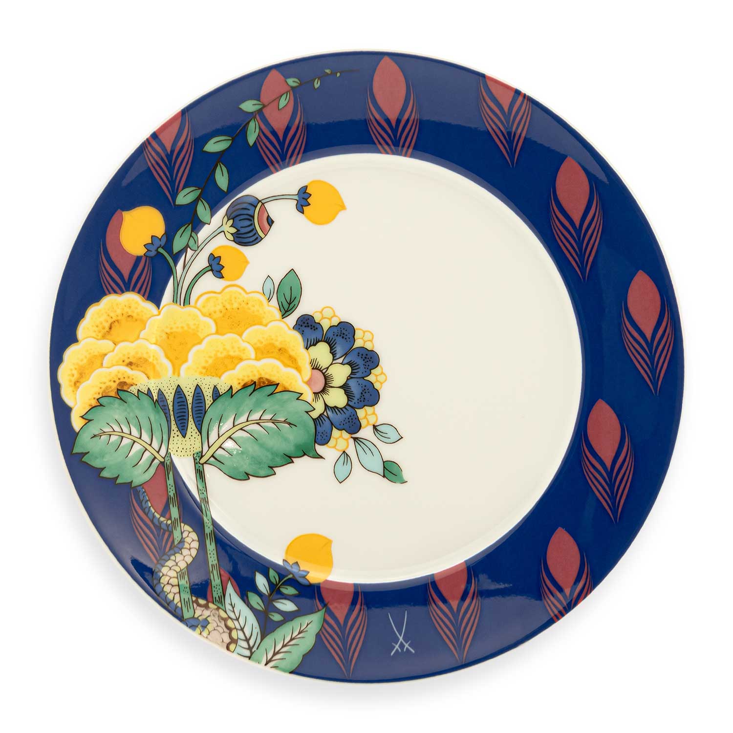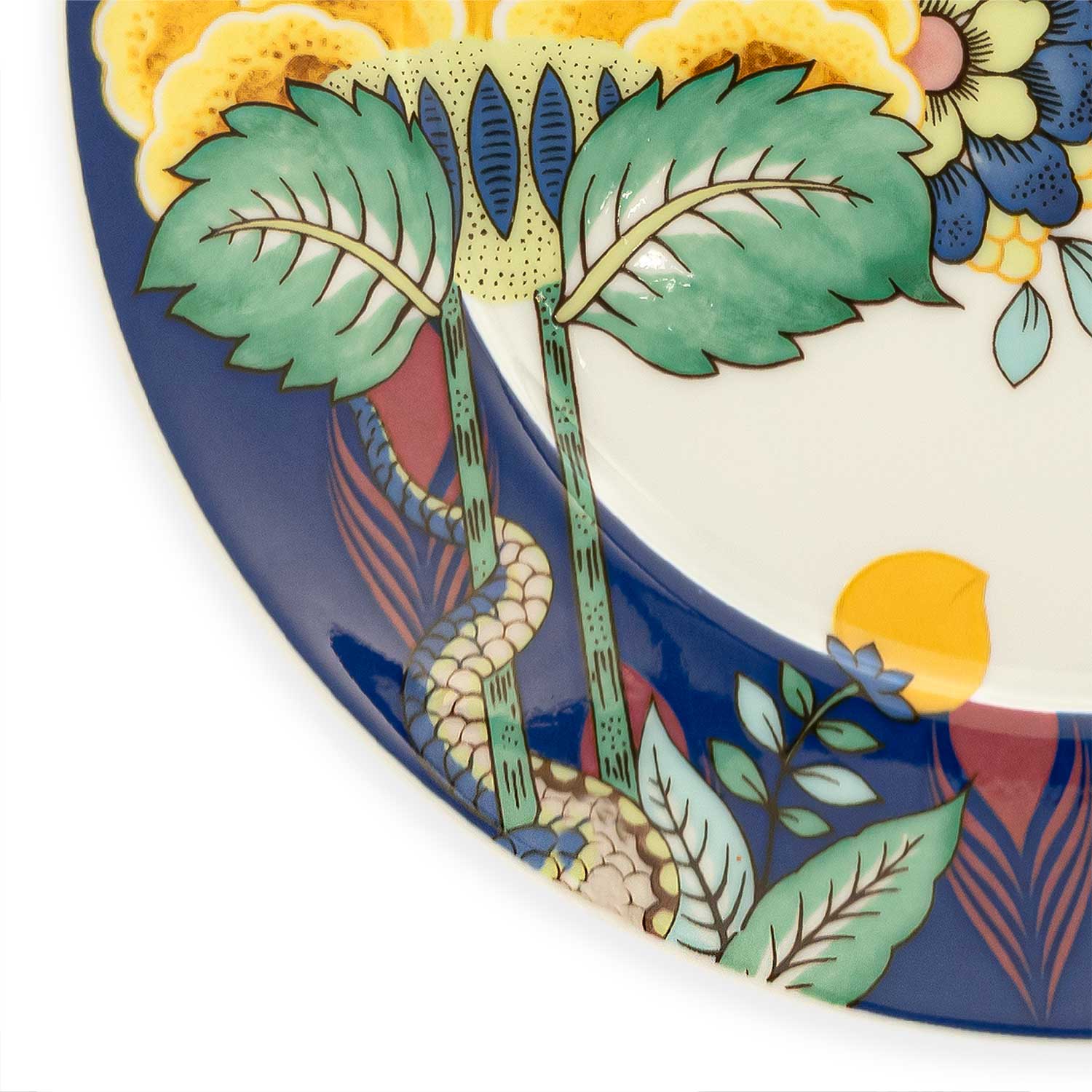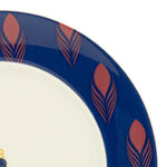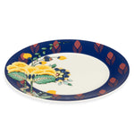 The Mystic Garden Side Plate is adorned with a blue border and red patch design, featuring a striking yellow flower in one corner. Made from high-quality materials, this plate combines artistic flair with practical use. Perfect for serving appetizers or desserts, its vibrant colors and detailed patterns add a touch of elegance to any dining experience.