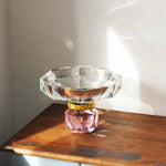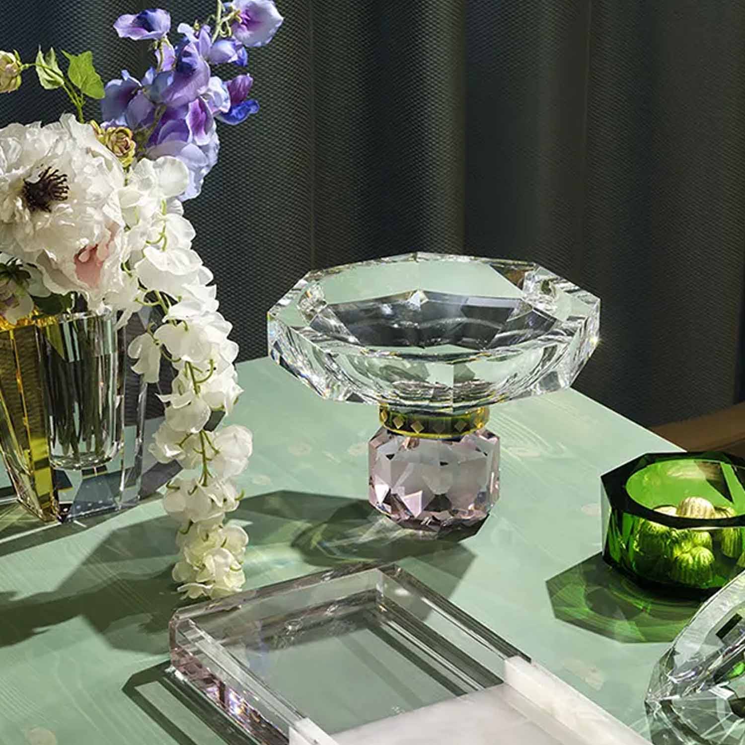 The Arizona Bowl captivates with its sculptural silhouette and unexpected contrasts. A clear crystal bowl appears elevated by a faceted rose base, with a band of yellow crystal—etched in diamond-shaped facets—introducing texture and light. Just beneath, a precise line of cobalt crystal cuts through the softness, adding a dynamic tension that enhances the design’s visual rhythm. Both functional and expressive, it brings a refined boldness to any setting.