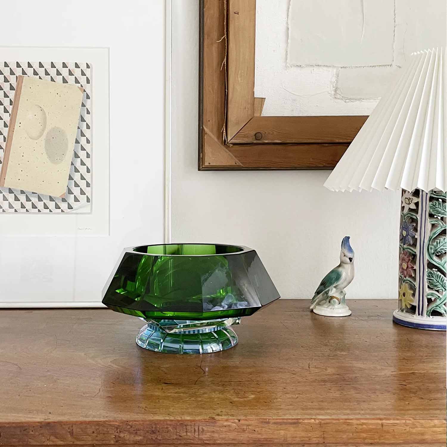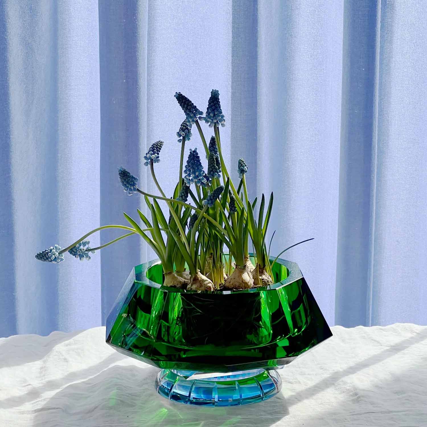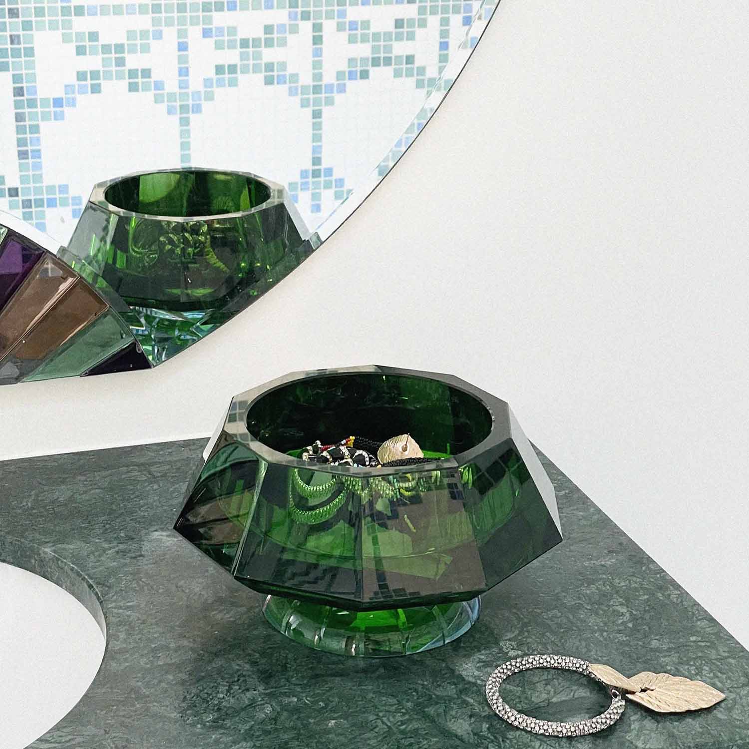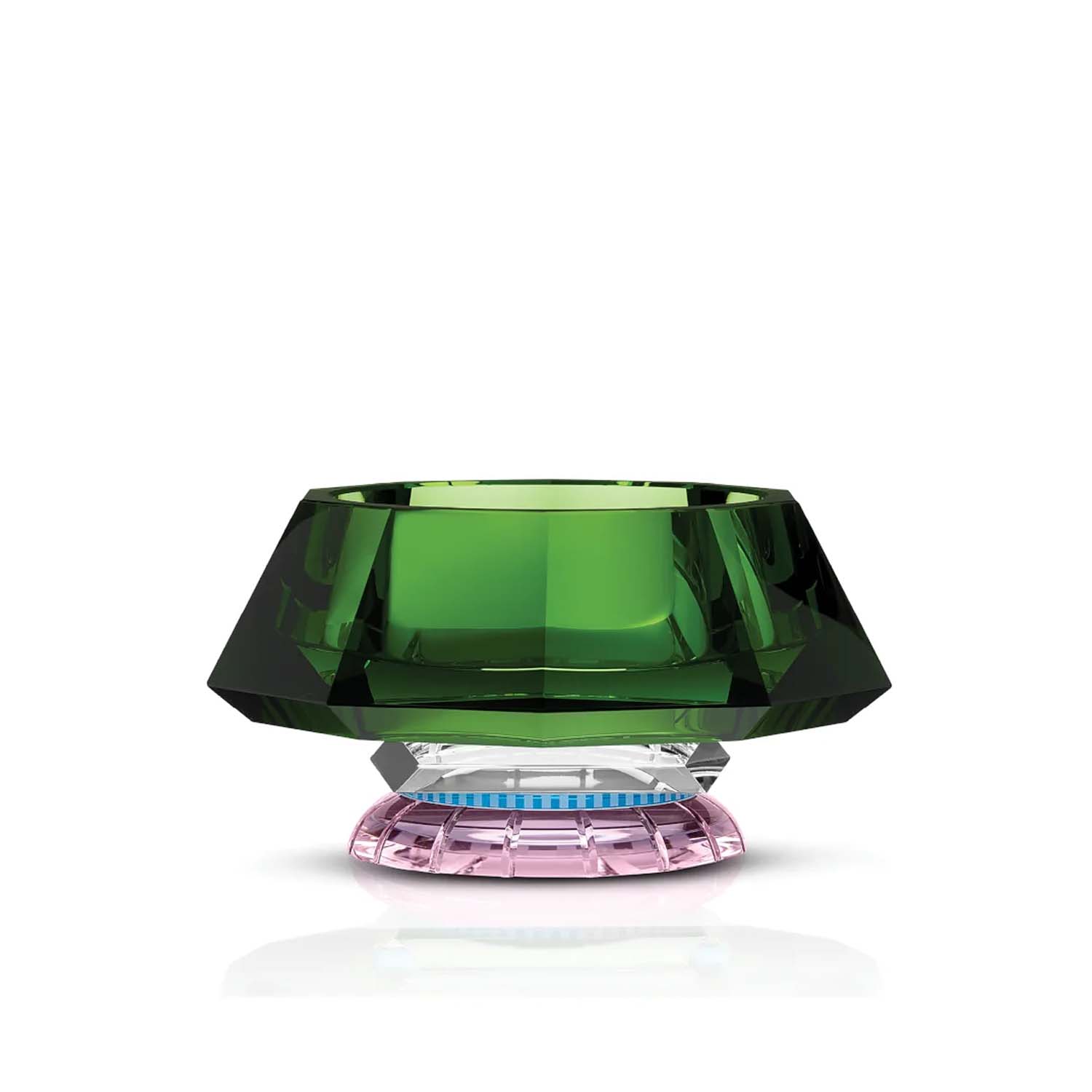 The Lizzi Bowl is a study in contrast and balance. Deep green crystal meets a delicate rose crystal base, connected by clear crystal with a fine azure accent. This subtle detail enhances the sense of weightlessness, making the bowl appear almost suspended in air. A refined interplay of color and form, the Lizzie Bowl is both a functional piece and a striking visual statement.