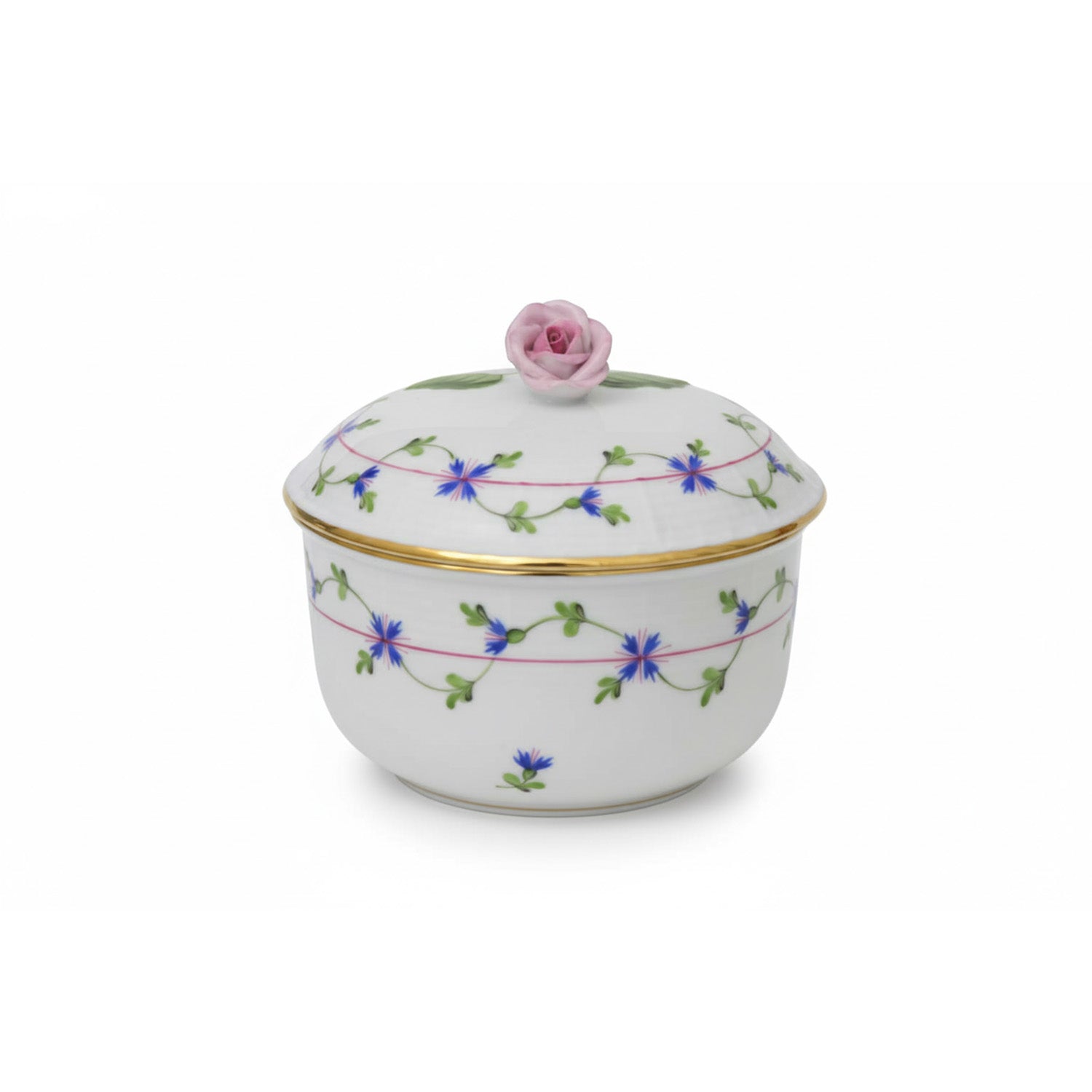 The Purple Garland Cornflowers Sugar Pot is expertly hand-painted and enhanced with 24K gold gilding, serving as a delightful and practical addition to Herend tea sets. Crafted from porcelain, the Petits Bleuets en Guirlande pattern draws inspiration from the cherished blue cornflower found in fields. Originating in 18th-century European porcelain factories and favored by Queen Marie Antoinette, this design holds a special place at Herend, where local painters connected deeply with the surrounding natural blooms. The pristine white porcelain features a scalloped gold border accented by a fine red line, from which stylized cornflowers with blue petals, red stamens, and green leaves gracefully form a continuous garland. The balanced contrast of cool and warm hues enhances the decor’s harmonious and refined appeal.