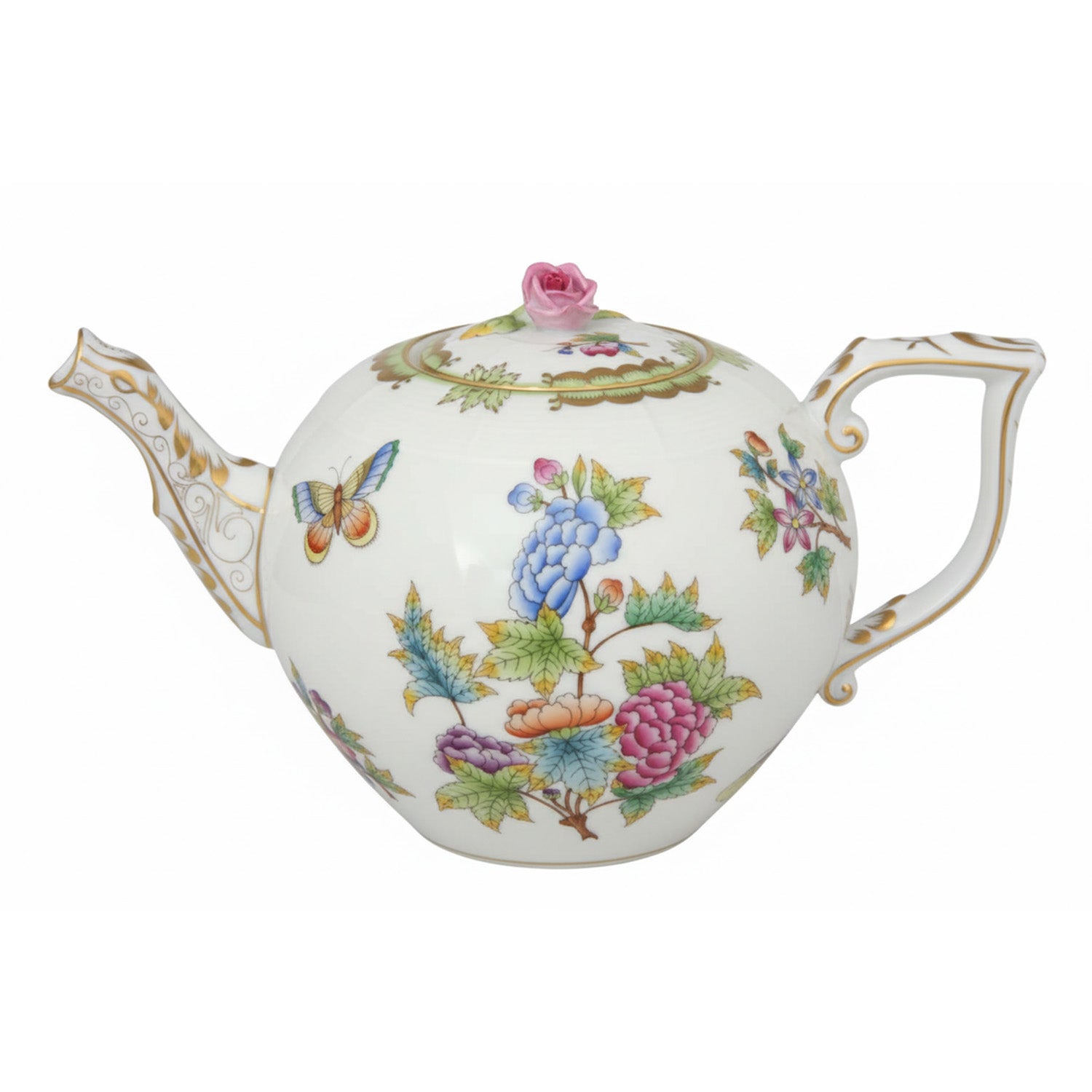 The Queen Victoria Tea Pot combines functional design with Herend’s artistic excellence. Carefully hand-painted and embellished with 24K gold accents, it serves as an elegant focal point for sophisticated occasions. With a capacity of 1.25 liters, this piece features the renowned Victoria pattern, one of Herend Porcelain Manufactory’s most enduring and iconic designs. Inspired by Far Eastern motifs, it showcases nearly a hundred vivid butterflies and flowering twigs on a gleaming white porcelain surface, framed by a richly gilded border reminiscent of meadow greens. This exquisite decoration earned Herend its first major international acclaim by winning first prize at the 1851 London World Exhibition and was famously commissioned by Queen Victoria herself for her royal tableware collection.