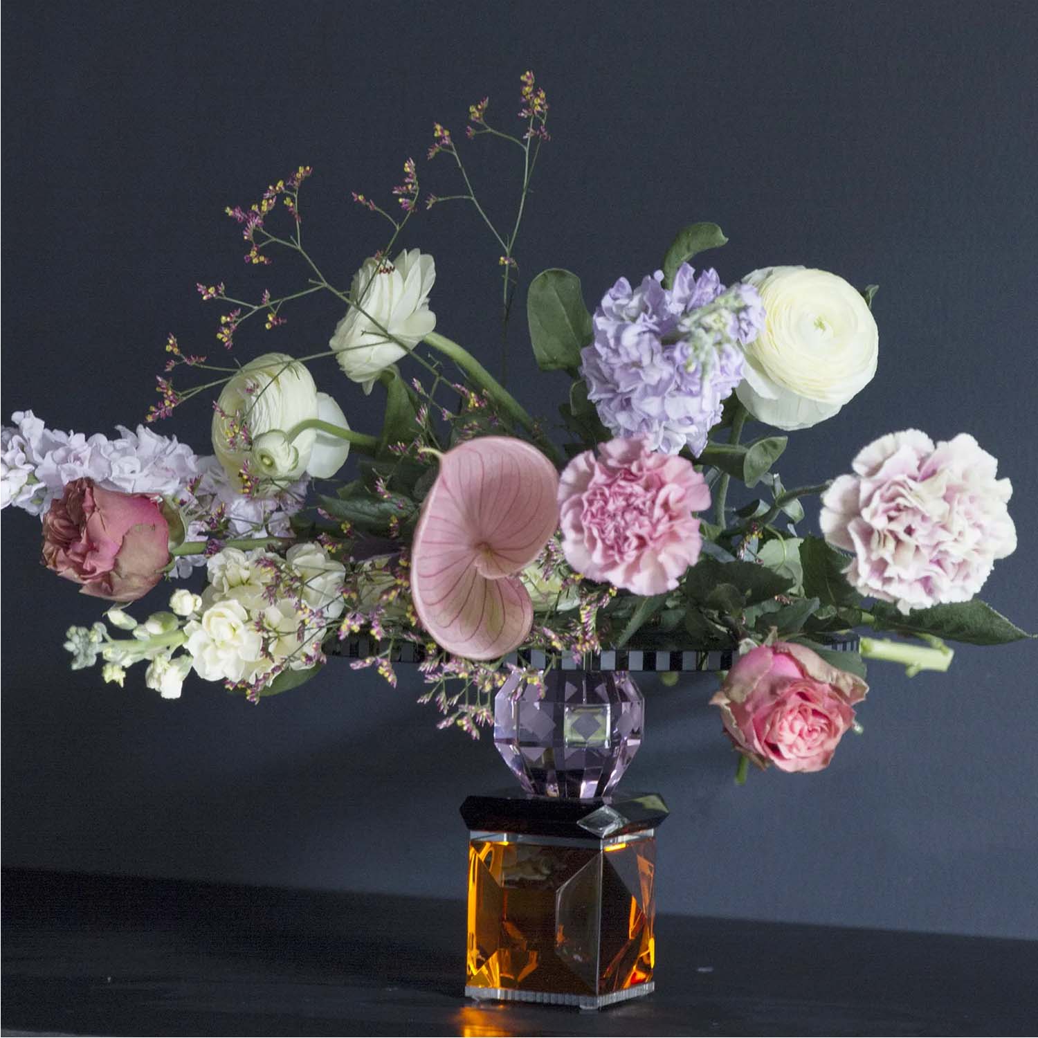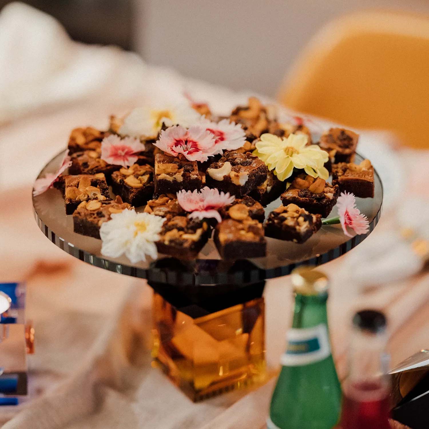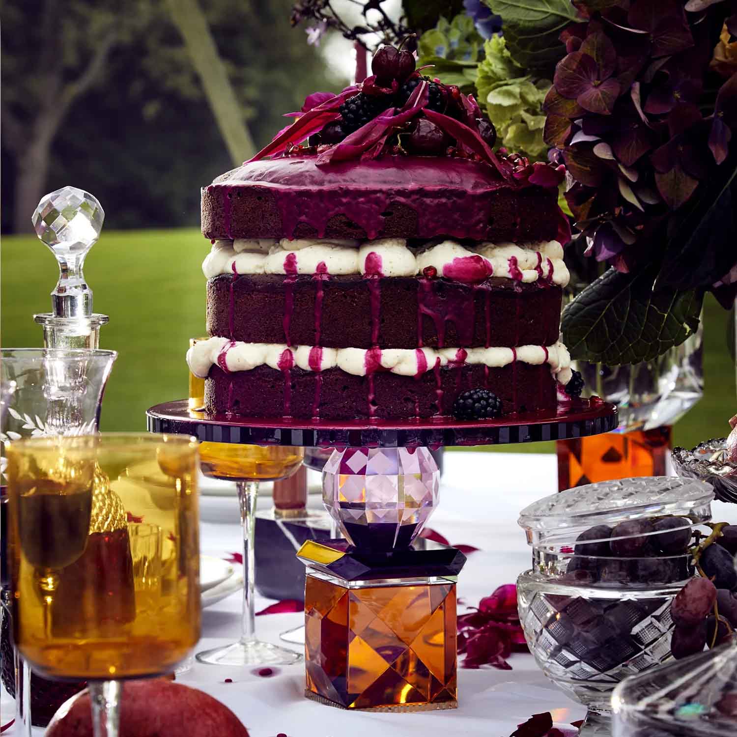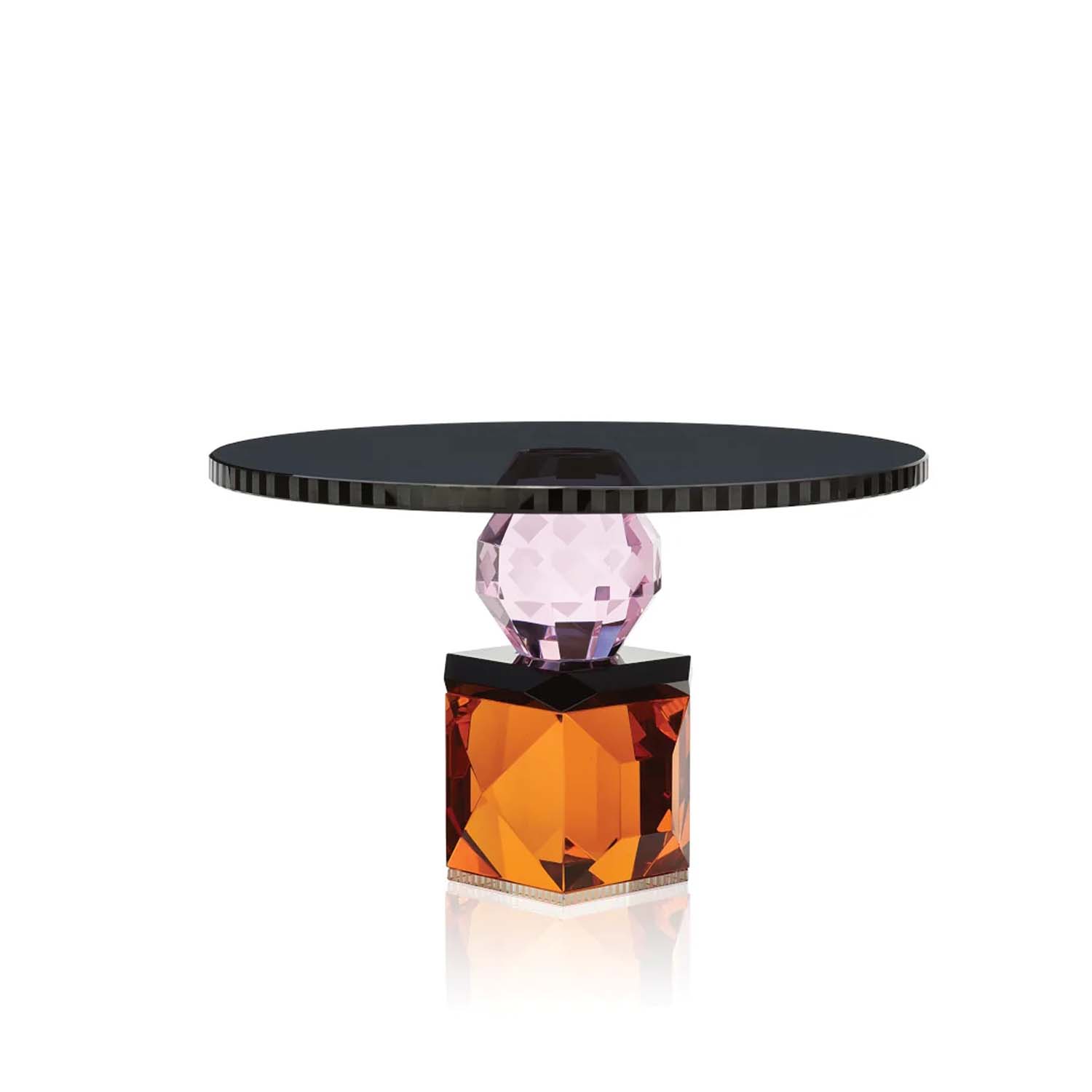 The Savannah Tray brings together crisp geometry and refined detail in a striking single-tier composition. Its black crystal plate is subtly embellished with mirrored engravings and intricate inlays, while the base layers faceted amber, a sleek black band, and a rose-toned faceted crystal oval to radiant effect. The interplay of cuts and colours allows light to dance across the surface, transforming any treat it holds into a visual delight.