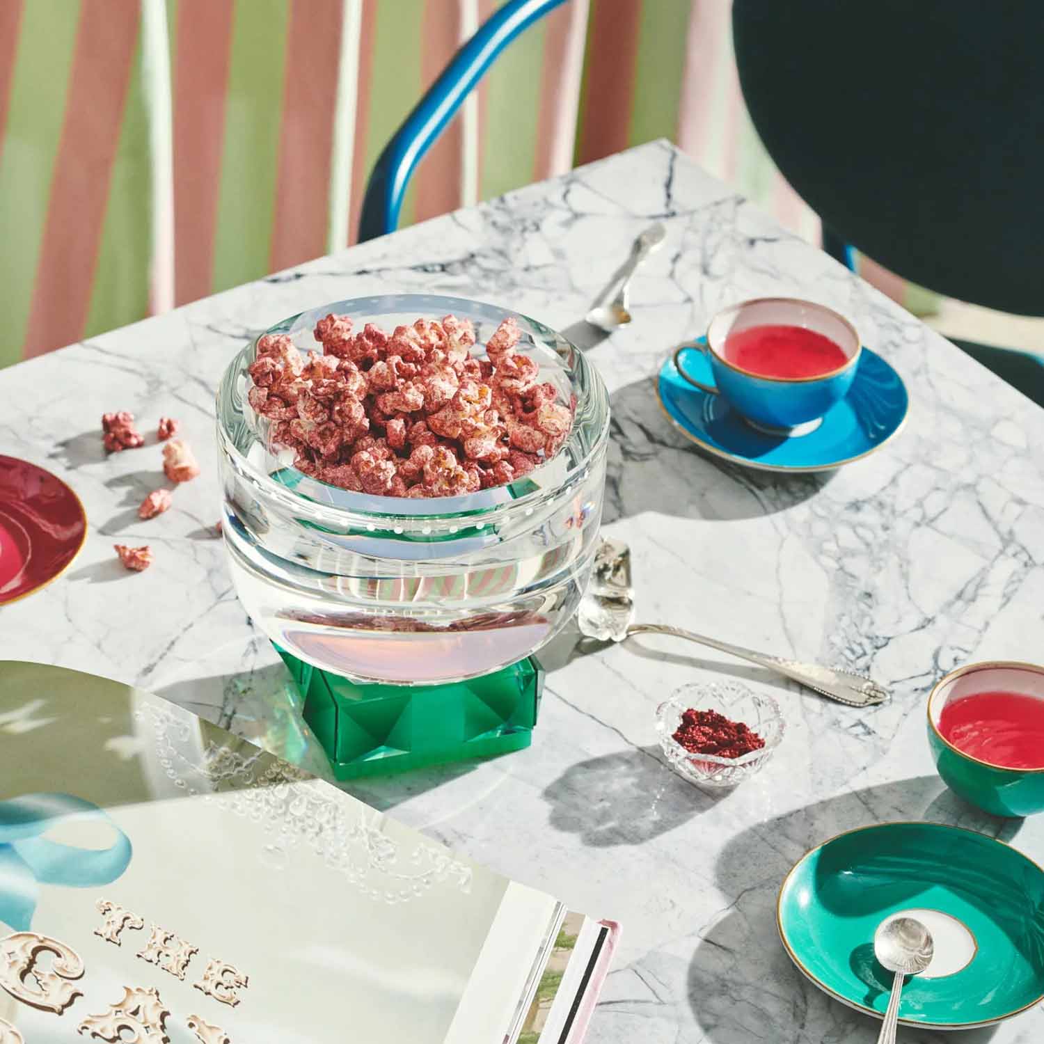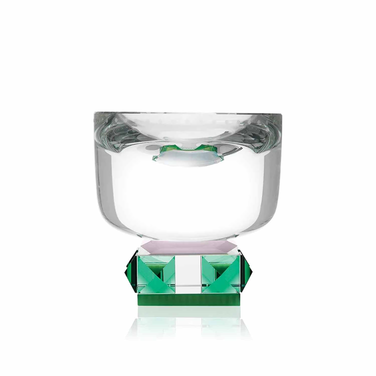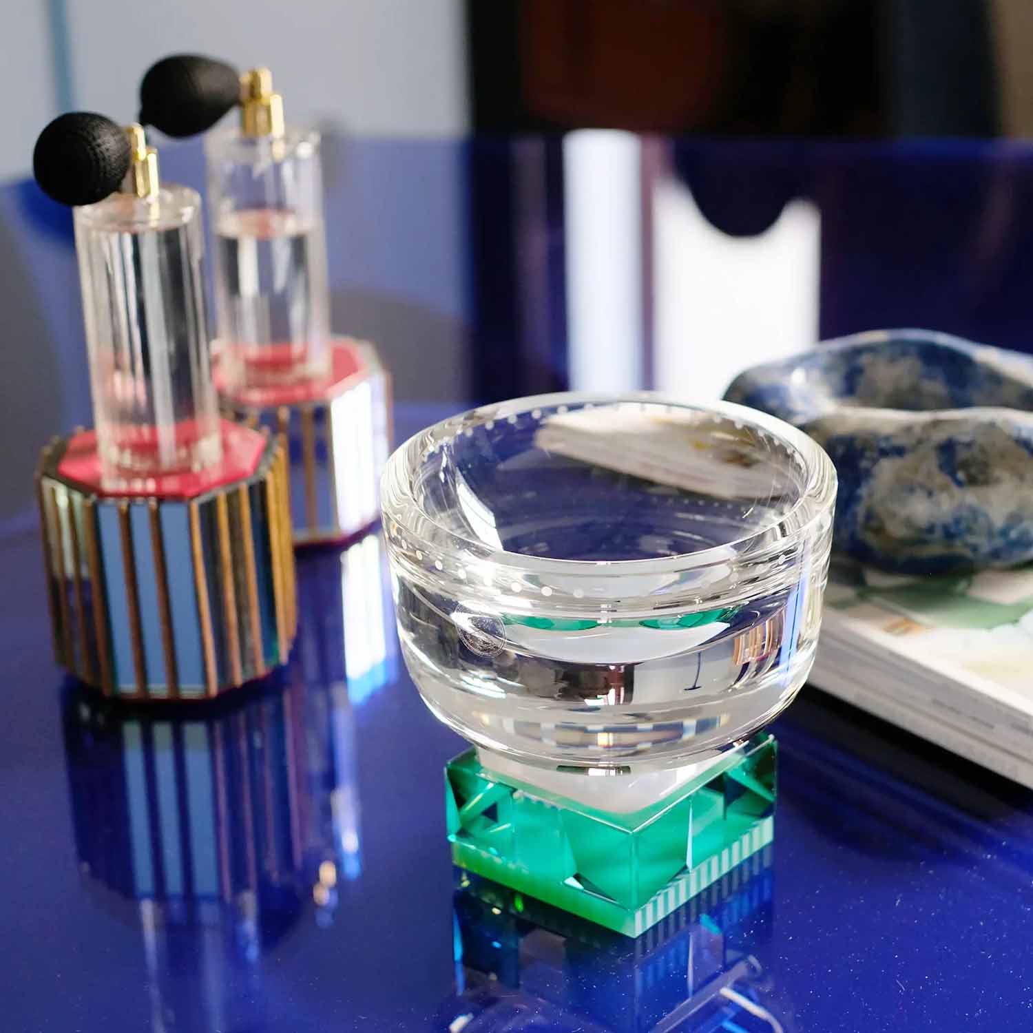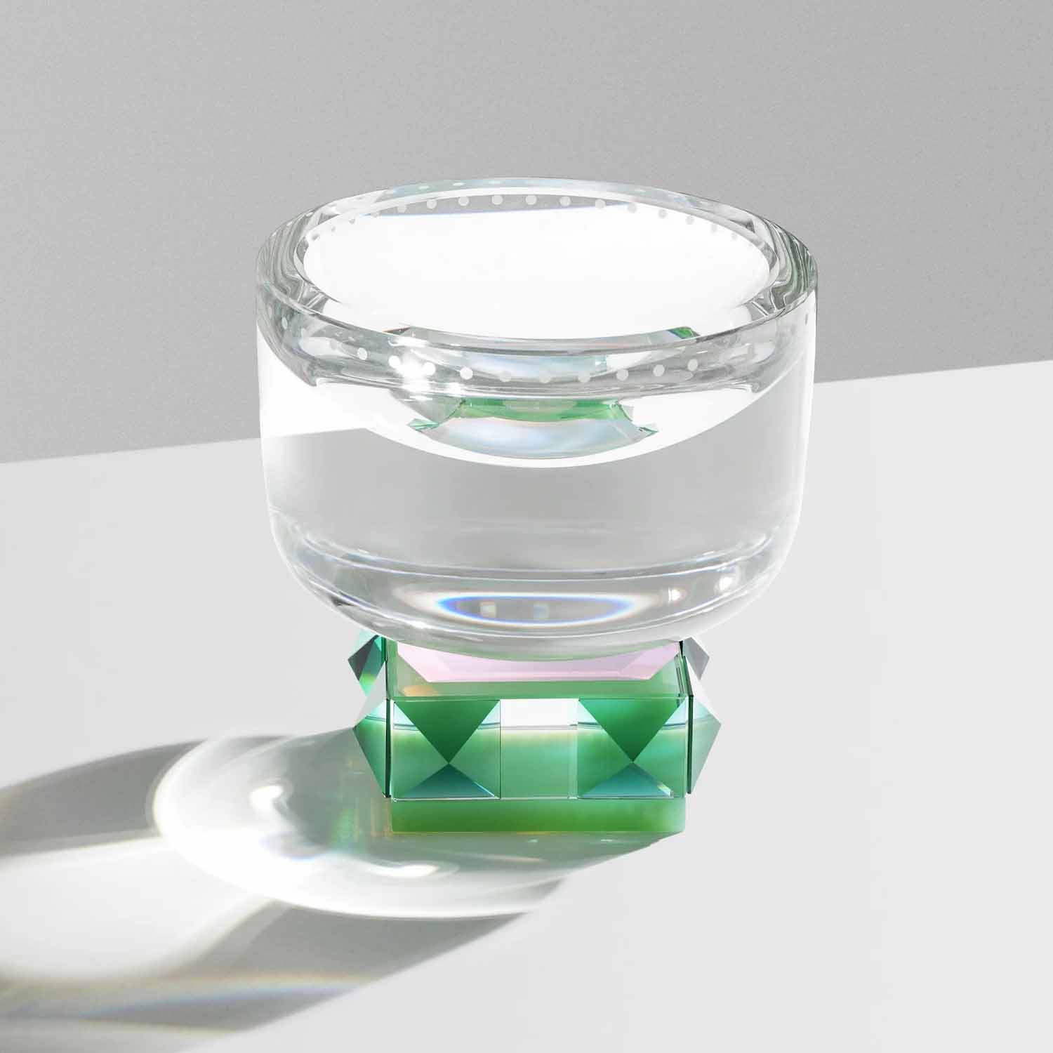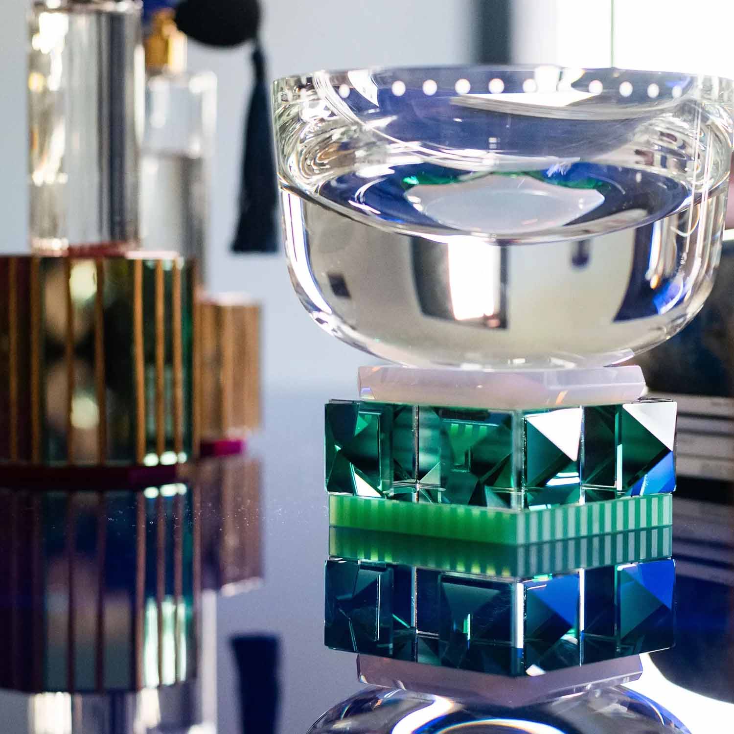 The Virginia bowl is an invitation to celebrate that Spring has finally arrived and symbolises the awakening and renewal of a fresh start. This bowl has the appearance of a solid slab of ice that has carefully been placed on a facetted and diamond shaped green square. The sunlight refracts remarkably through the crystal and creates an infinity of patterns