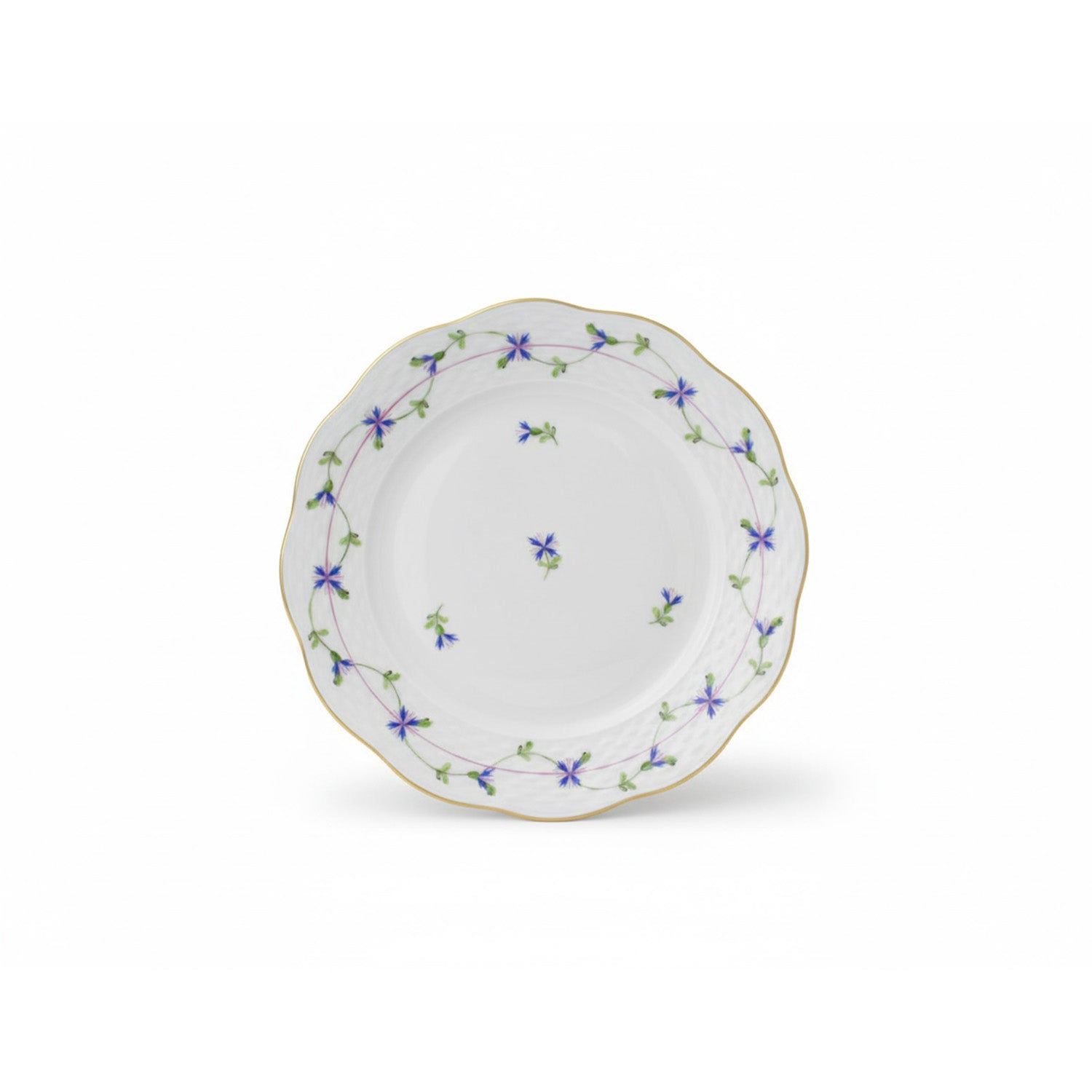 The Purple Garland Cornflowers Side Plate is intricately hand-decorated by Herend craftsmen and accented with refined 24K gold detailing, making it perfect for serving salads or bread. Measuring 19 cm in diameter, this porcelain plate features the Petits Bleuets en Guirlande design, inspired by the cherished blue cornflower of the fields. Originating in 18th-century European porcelain workshops and favored by Queen Marie Antoinette, the motif holds a distinguished place at Herend, reflecting the local painters’ connection to the surrounding flora. The pristine white porcelain is bordered by a scalloped gold rim with a delicate red line, from which stylized cornflowers with blue petals, red stamens, and green leaves form an elegant garland. The interplay of cool and warm tones brings vibrancy and harmony to the design.