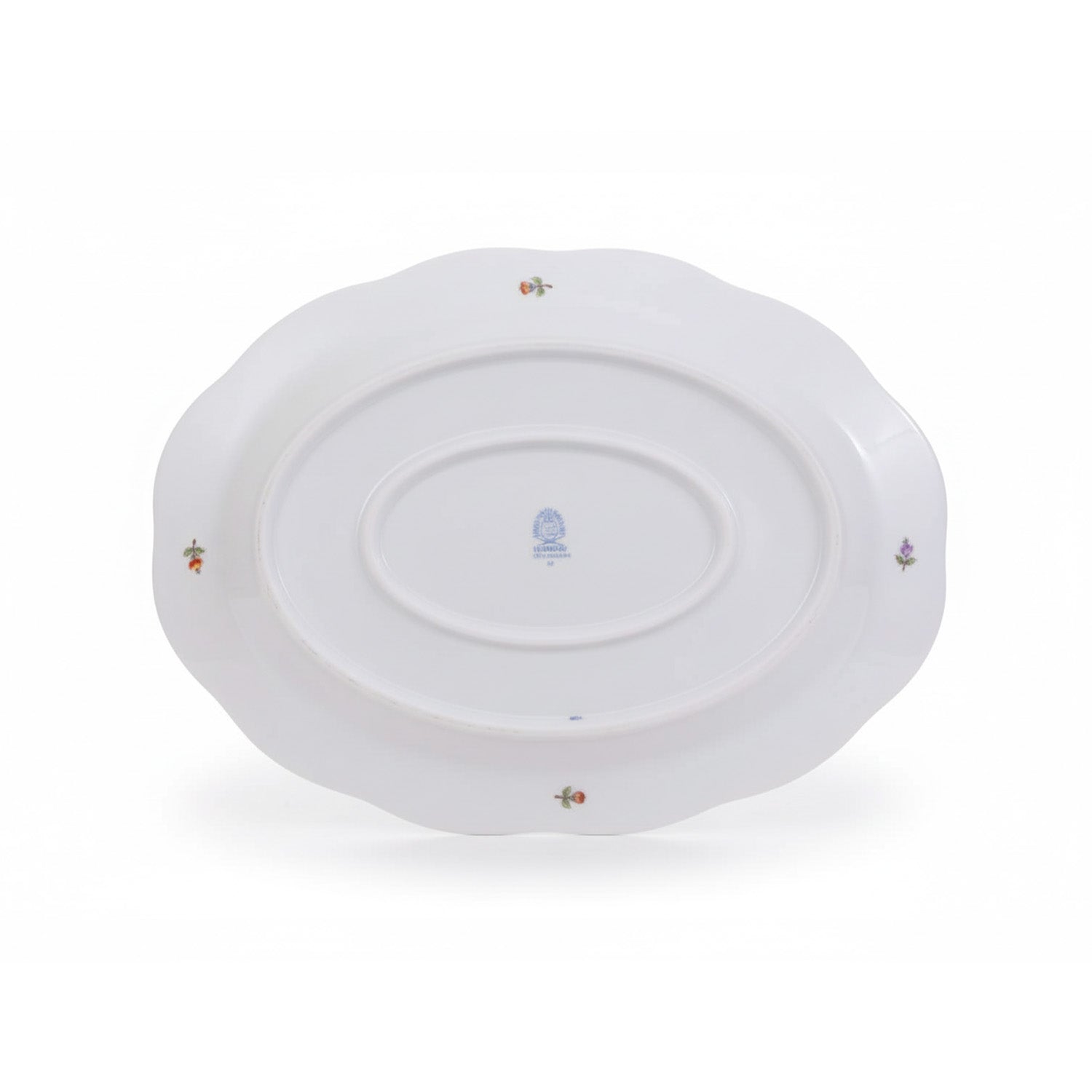 The Queen Victoria Oval Platter, measuring 35 cm in diameter, is masterfully hand-painted and accented with a luminous 24K gold rim, blending artistic elegance with practical serving functionality. This piece features the renowned Victoria design, one of the Herend Porcelain Manufactory’s oldest and most iconic patterns. Drawing inspiration from Far Eastern motifs, it showcases nearly a hundred brightly colored butterflies and flowering twigs on a pristine white porcelain background, bordered by a richly gilded frame reminiscent of lush meadow greens. This intricate decoration brought Herend its first major international accolade, winning first prize at the 1851 London World Exhibition, and was famously commissioned by Queen Victoria for her royal tableware collection.