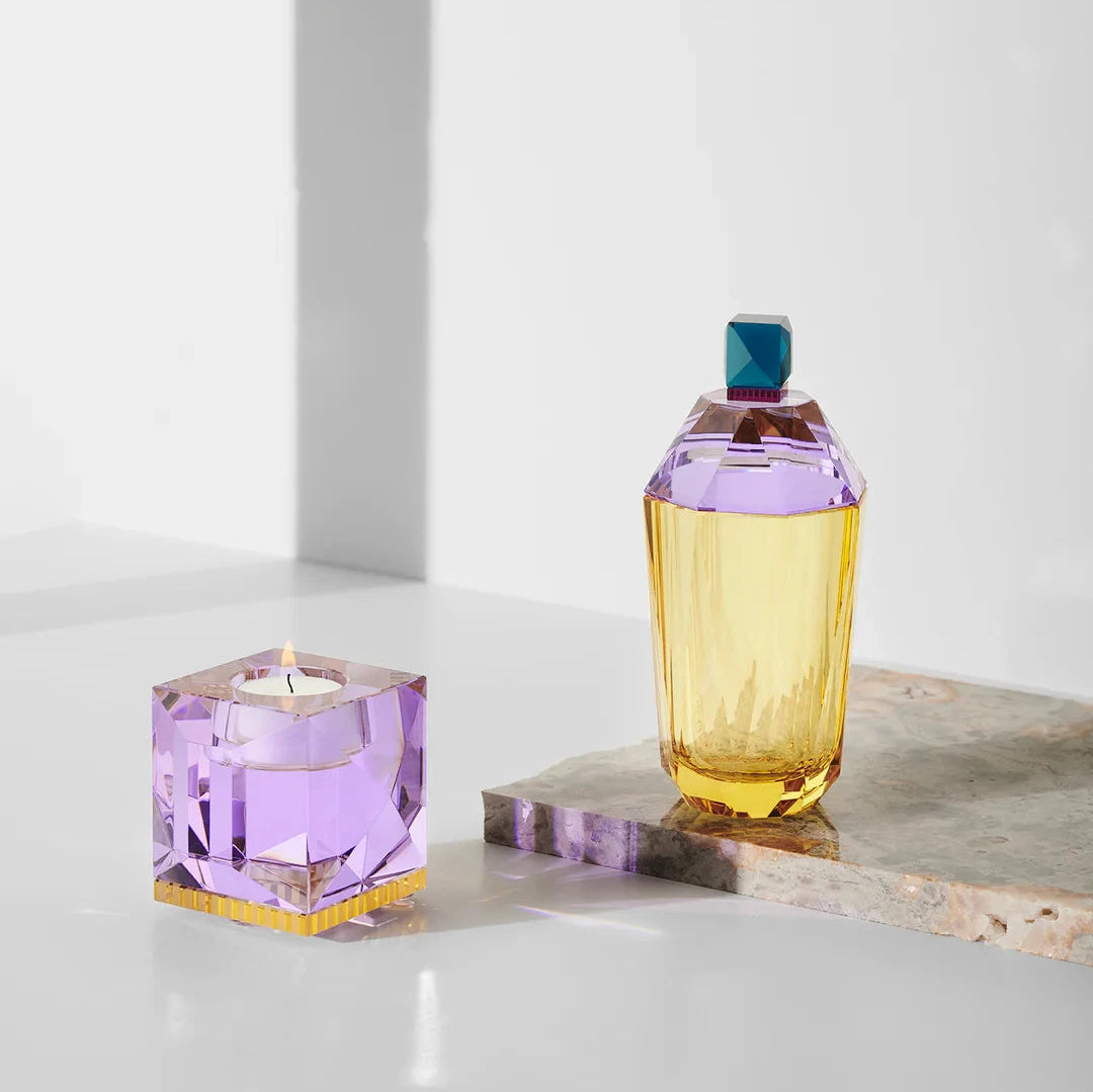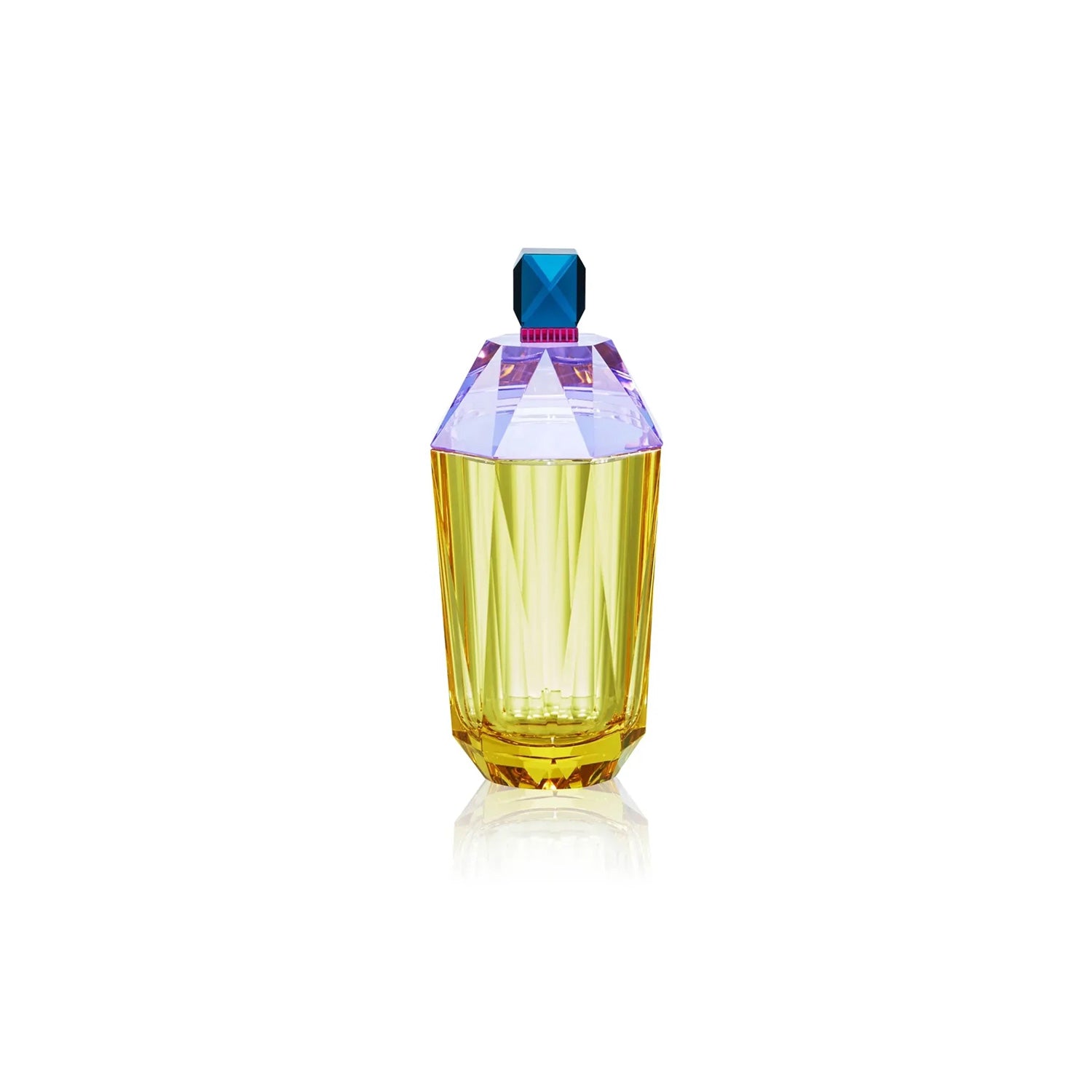 Reflections Copenhagen's luxurious Long Island bonbonniere in vibrant yellow is reminiscent of the lavish interiors of French Boudoirs and the modern elegance of The Hamptons. Made from exquisite hand-cut crystal, this piece features a detachable stopper and a rim with eight ridges leading to a slim base. Add a touch of sophistication to your dressing table or showcase it on one of Reflections Copenhagen's stylish trays.
