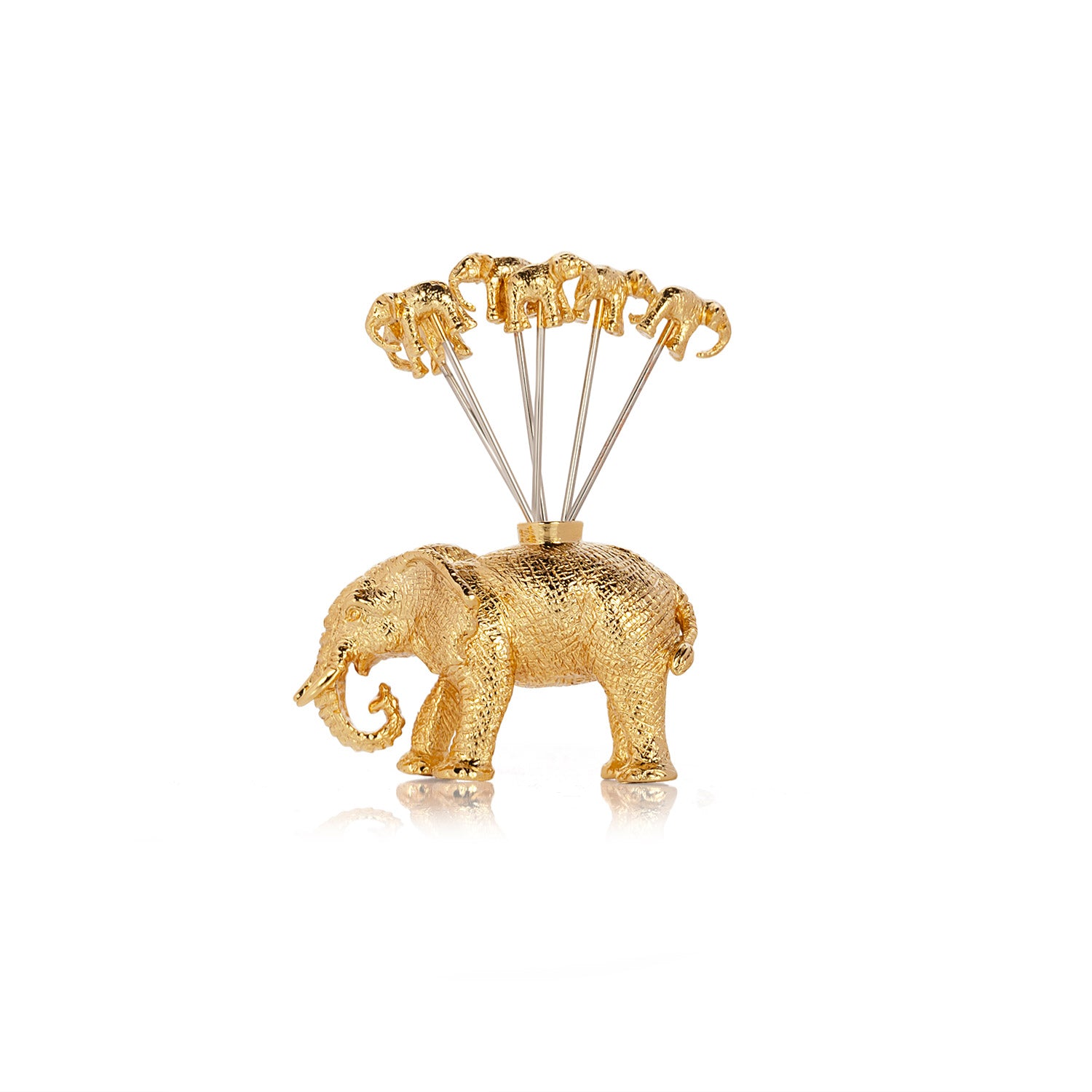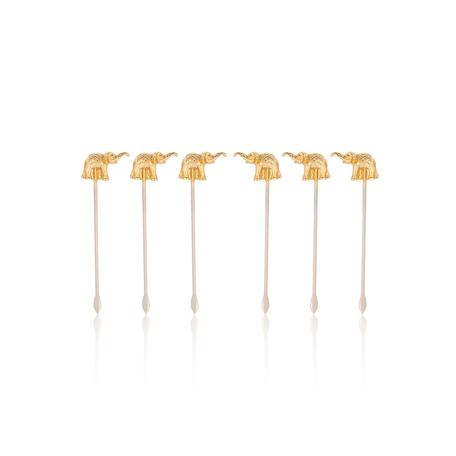 Elevate your entertaining with the Small Gold Coloured Elephant Cocktail Pick Set. Each pick is 24k gold plated, featuring an intricately designed elephant motif. This luxurious set adds a touch of elegance and whimsy to any gathering, making it perfect for serving hors d'oeuvres or garnishing cocktails. The exquisite craftsmanship and detailed design make these picks not only functional but also a beautiful conversation piece.