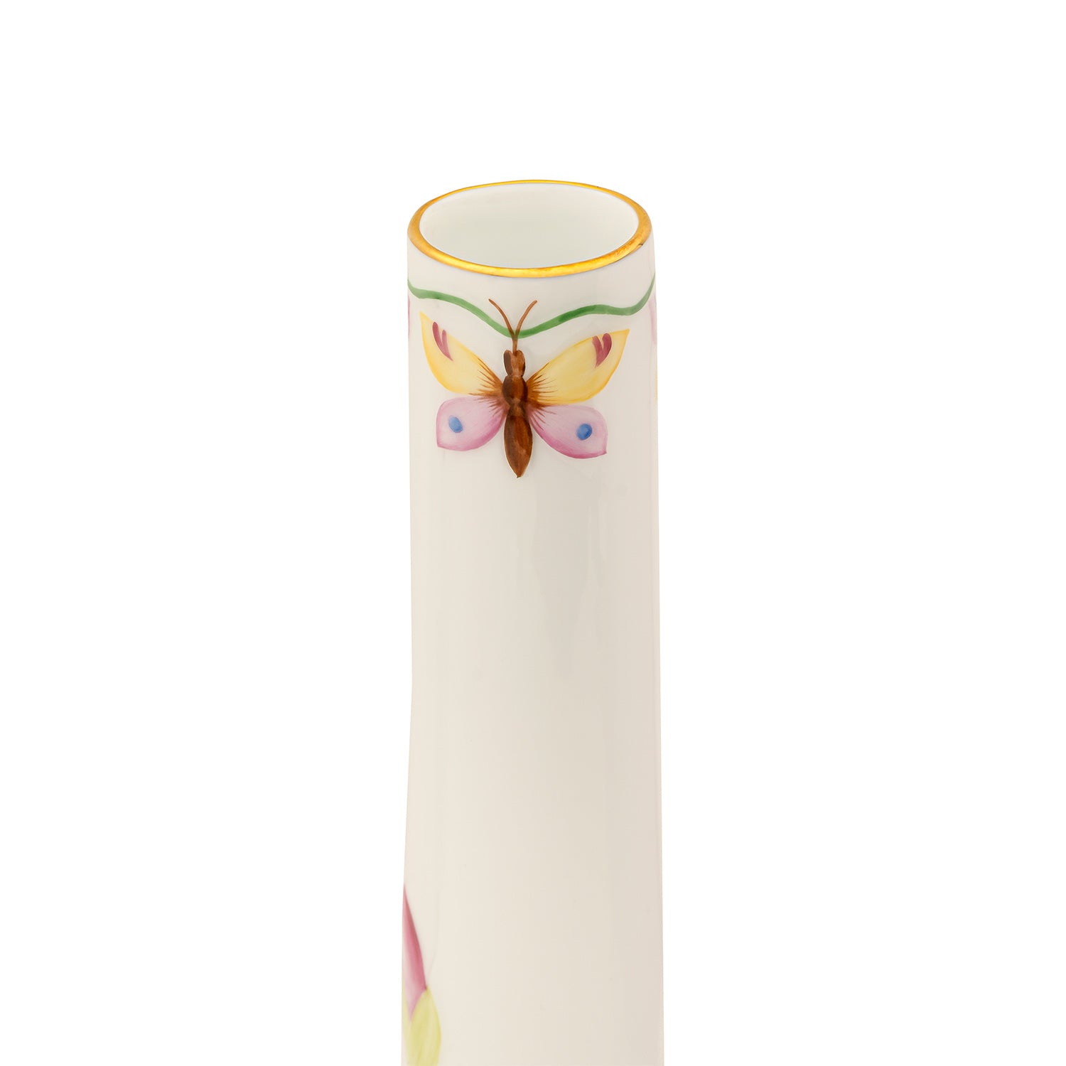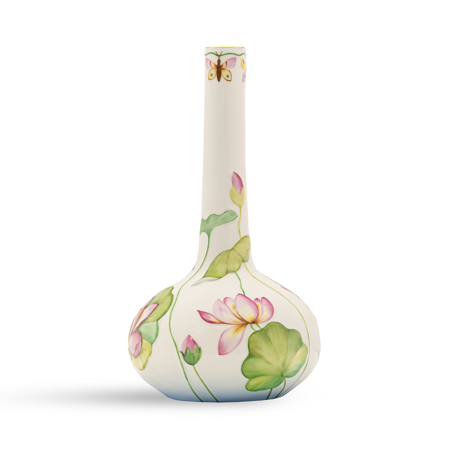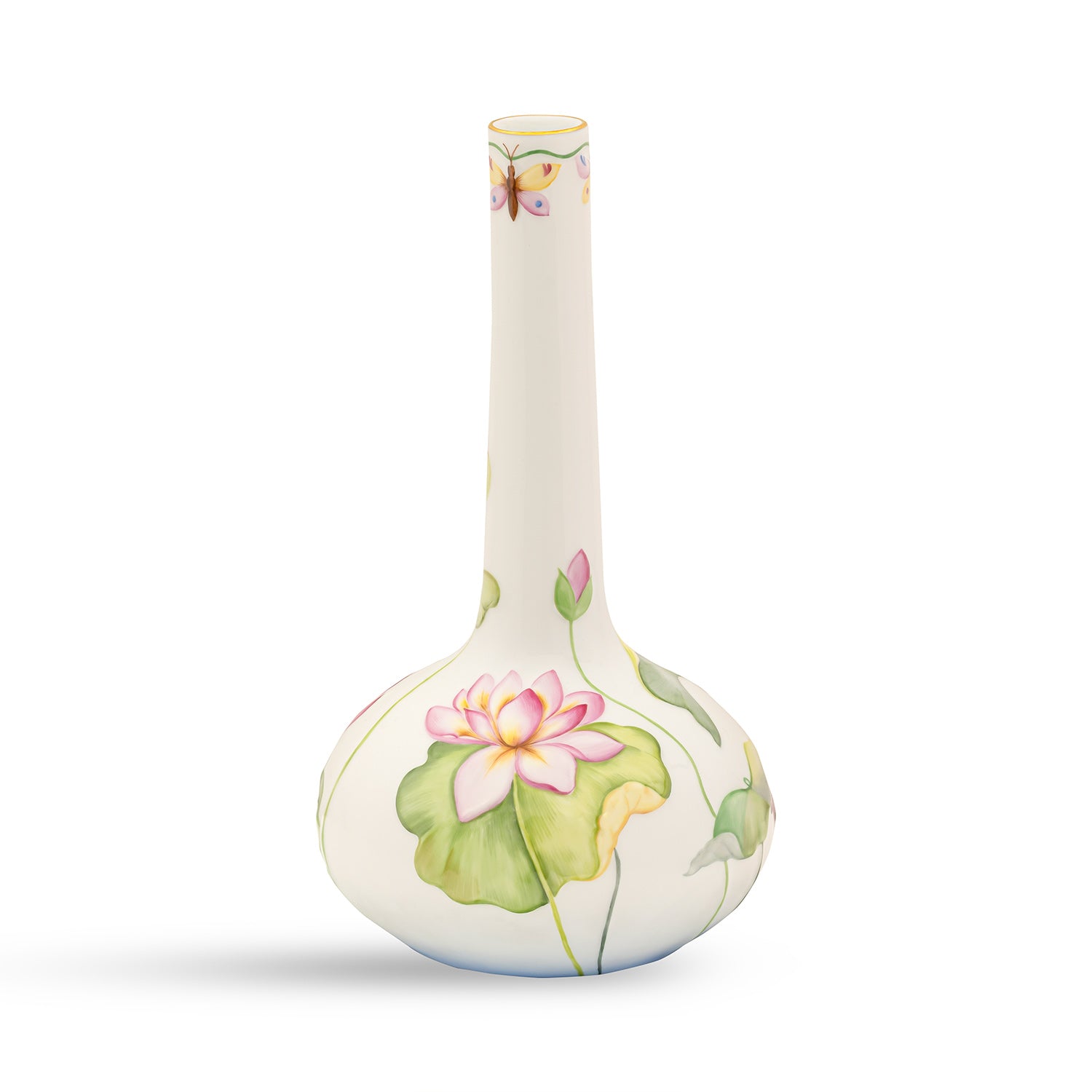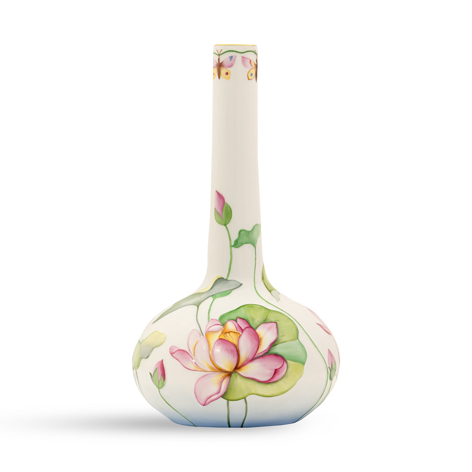 Presenting the Nature Vase, a graceful addition to your decor. Crafted from fine porcelain, it features a wide oval base and a slender, elongated neck that exudes elegance. Adorned with a delicate floral pattern and embellished with shimmering 24k gold paint, this vase radiates timeless beauty. The neck showcases a subtle dragonfly motif, adding a touch of whimsy and nature-inspired charm. Perfect for displaying fresh flowers or as a standalone accent piece, it blends artistic craftsmanship with sophistication to enrich your home decor.