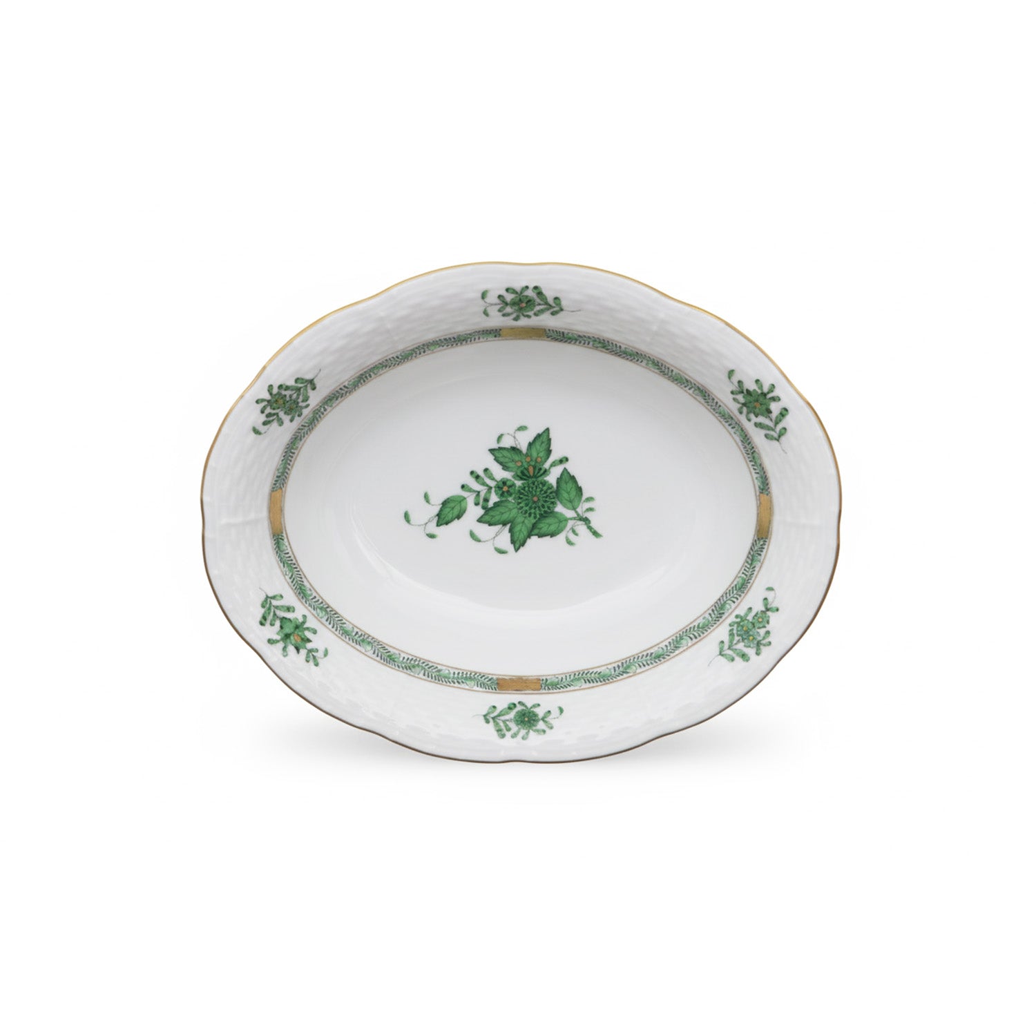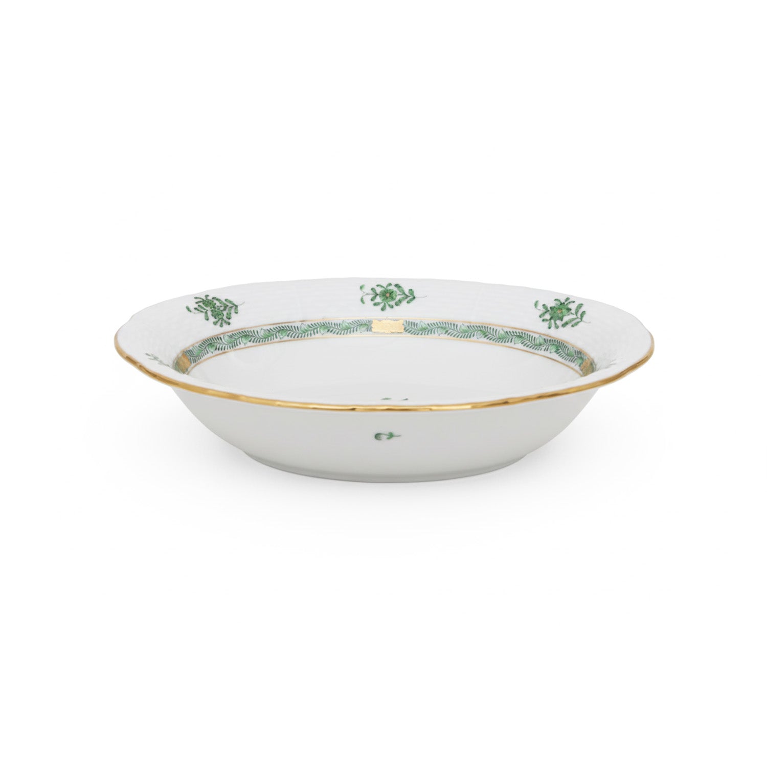 The Apponyi Green Serving Bowl serving bowl is painstakingly decorated by Herend artisans and accented with subtle 24K gold highlights, elevating your presentation for shared courses. It measures 25cm in diameter.