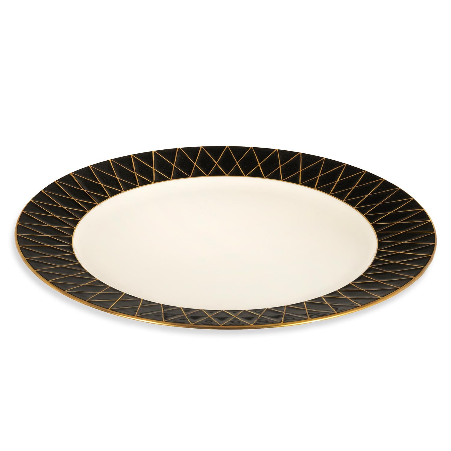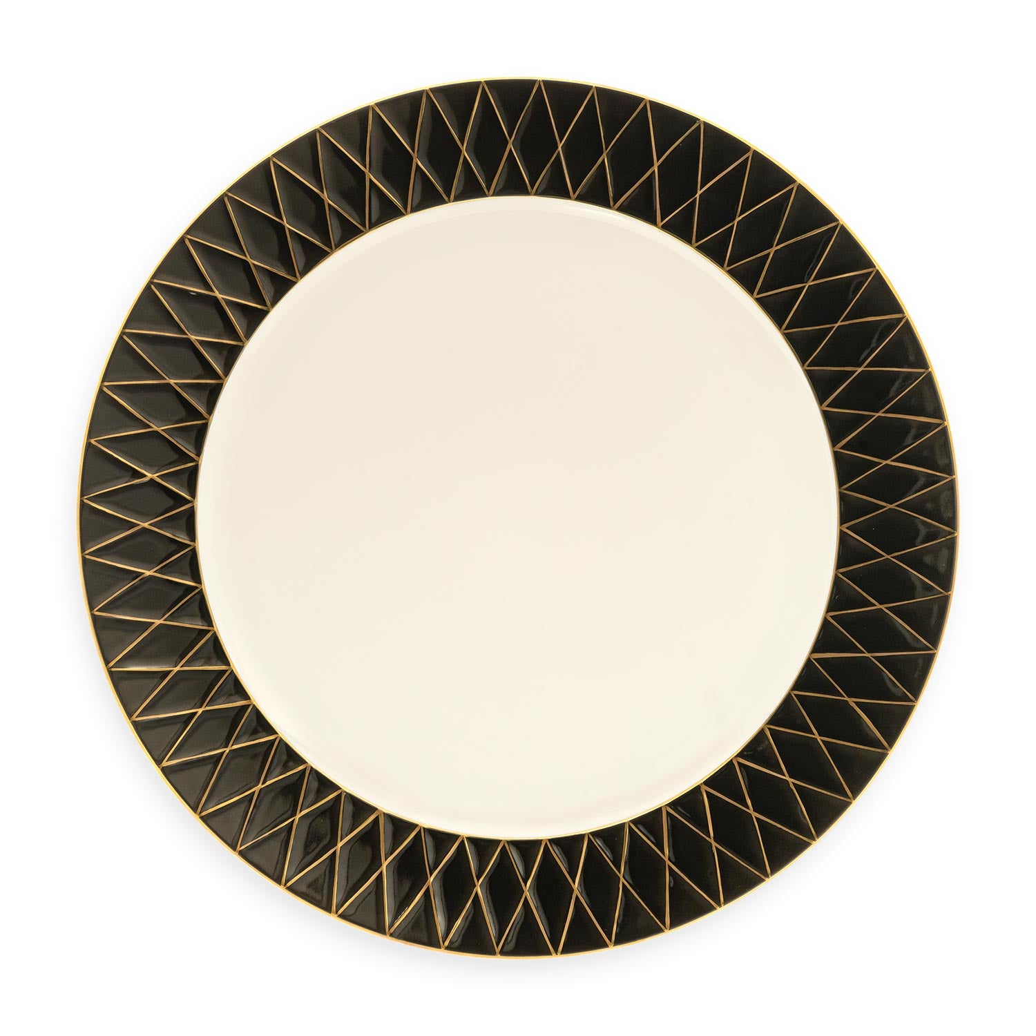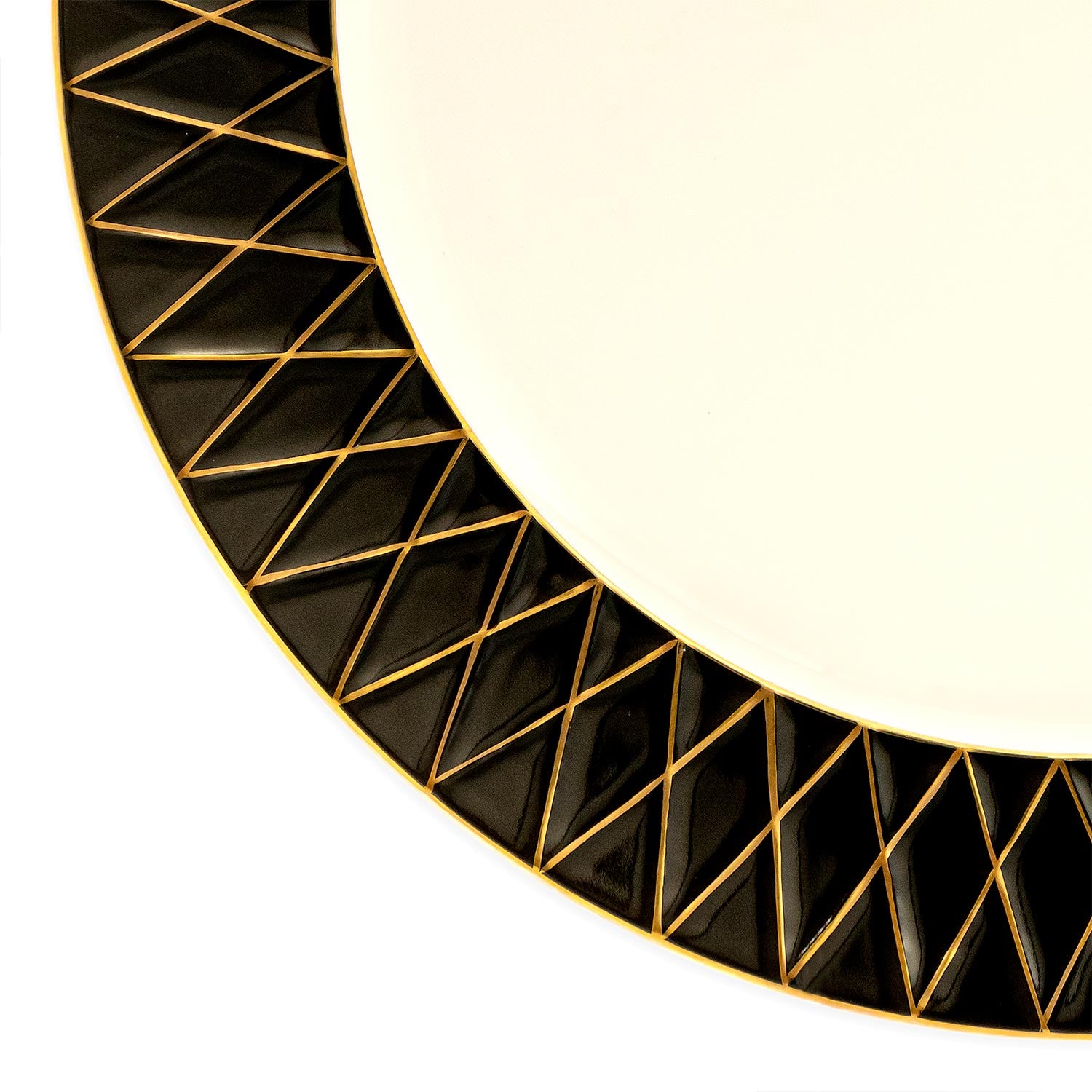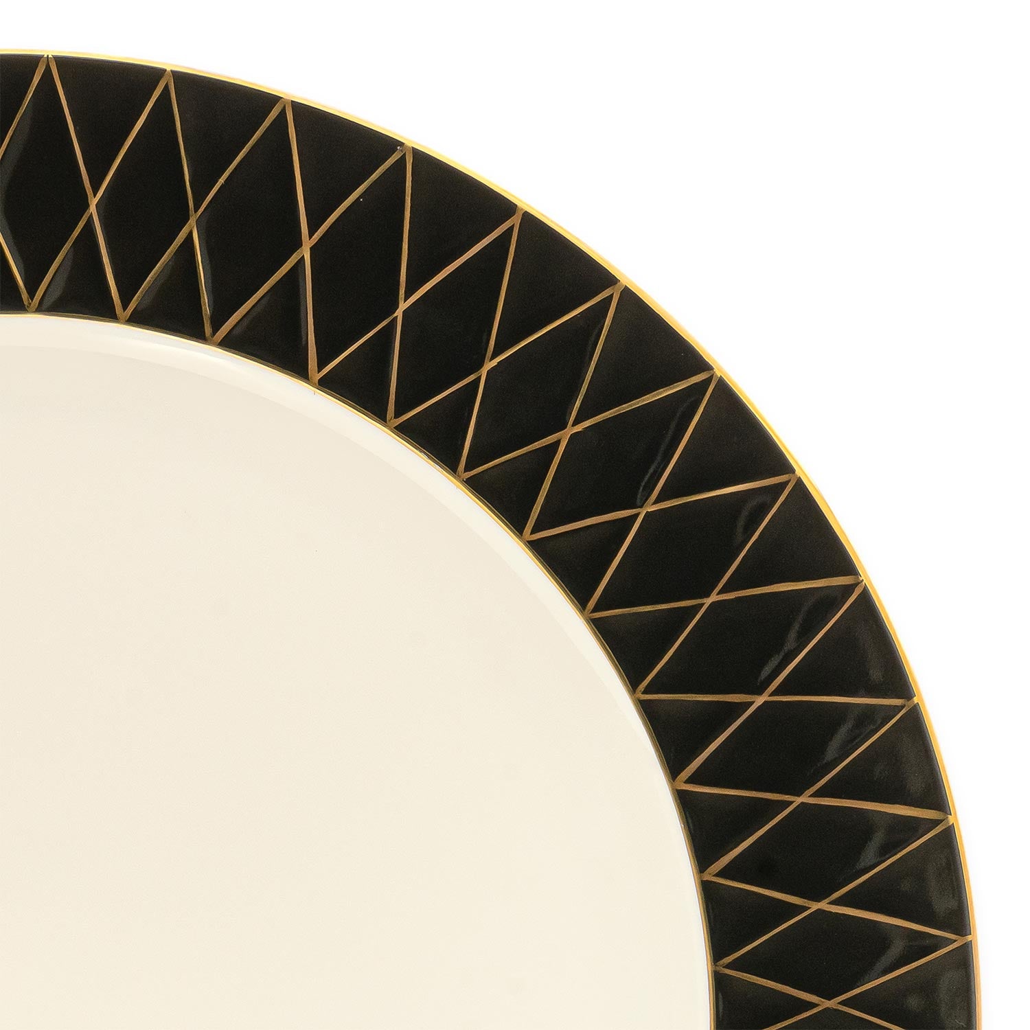 The Babos Black design dish features a modern pattern on a multipurpose plate with a pale finish. A central circle in fine gold paint is surrounded by a rich green border, complemented by a textured wavy outline highlighted with 24k gold paint. Perfect for dining or as a decorative tapestry, it promises to elevate sophistication. Similarly, a pale shaded plate with a thick black border showcases a symmetrical X design in shimmering gold, ideal for stylish dining or display.