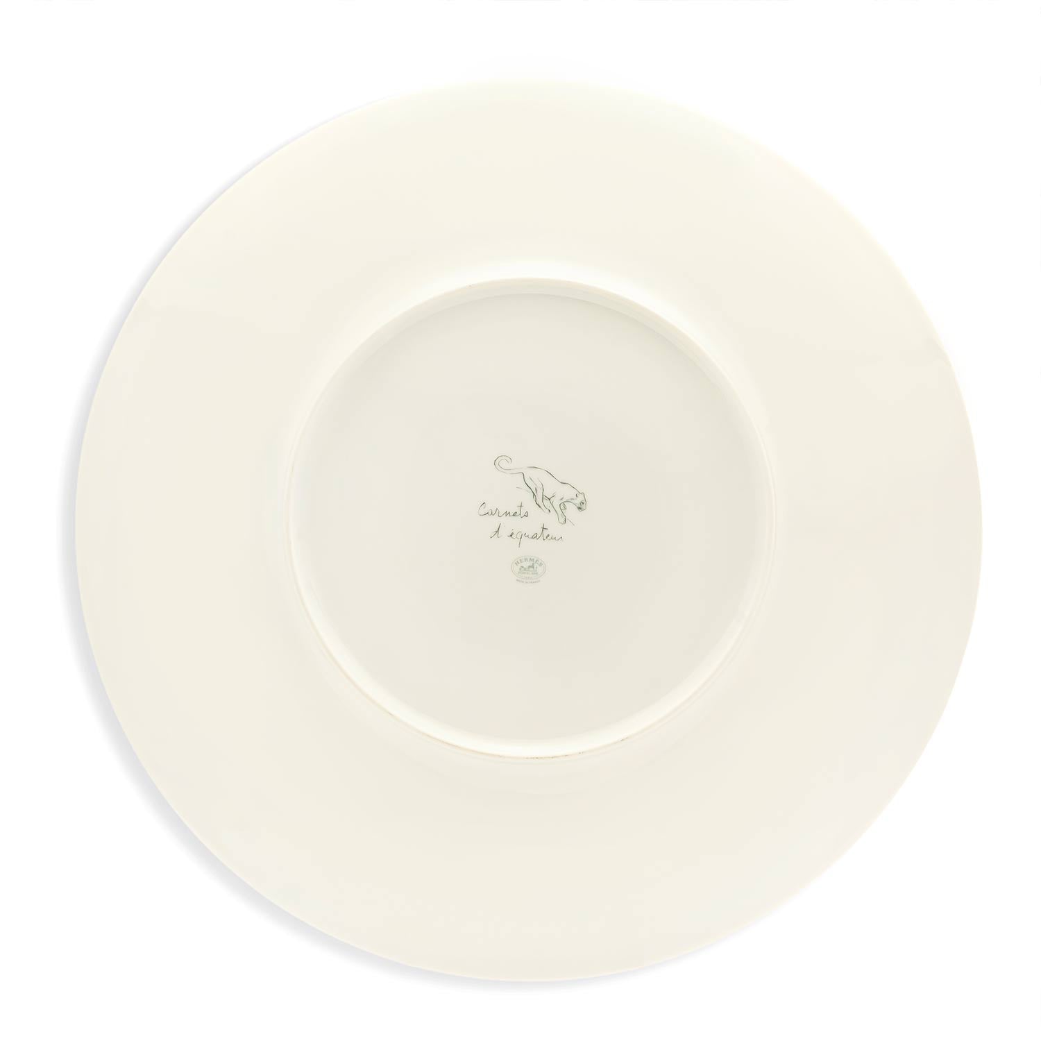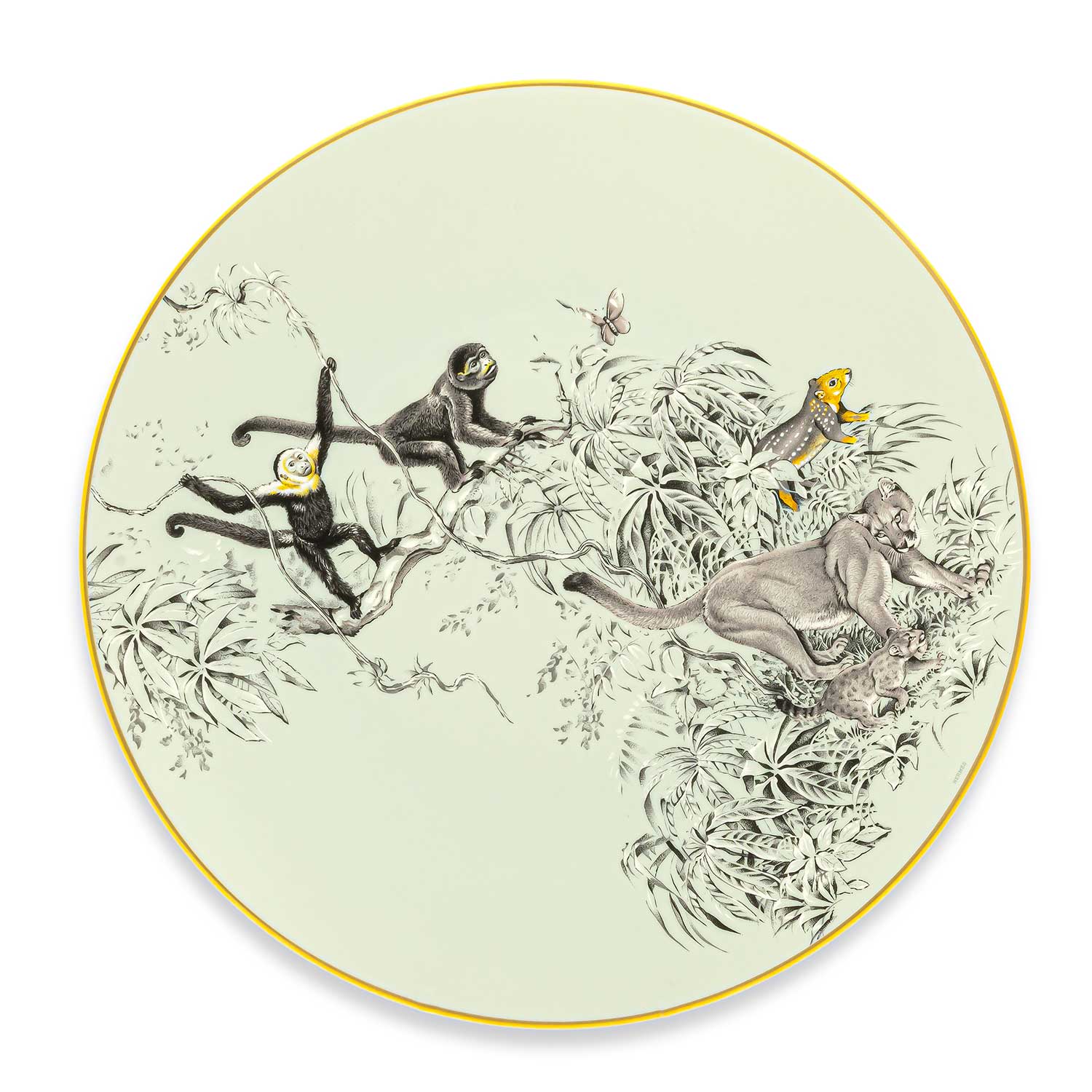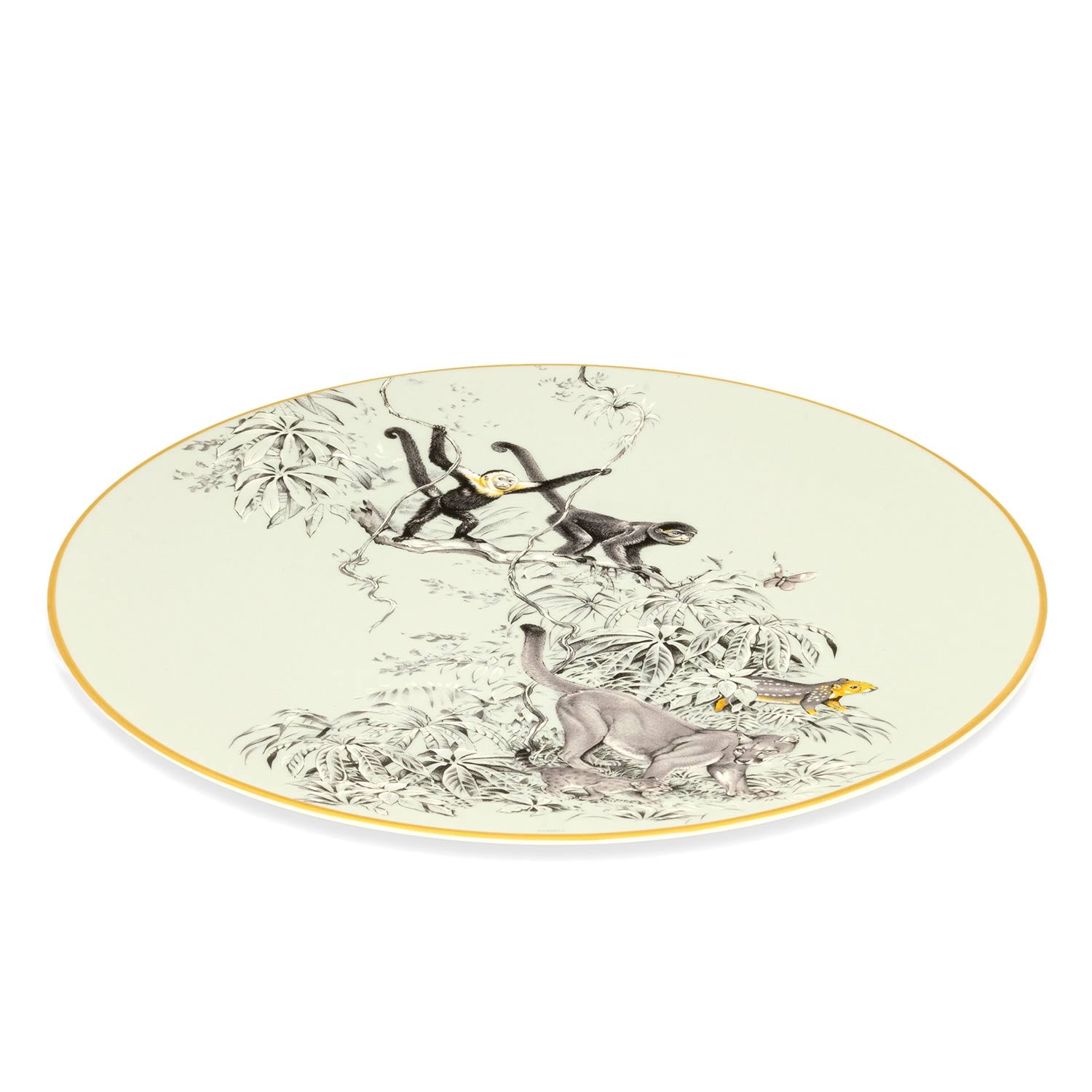 Introducing the Carnets Presentation Plate, a masterpiece of fine white porcelain featuring a captivating design of two monkeys on a tree, spreading horizontally across the plate. This exquisite piece is hand-painted with meticulous detail and adorned with 24k gold accents, adding a touch of luxury and sophistication. Perfect for elegant dinners and special occasions, this plate seamlessly blends art and functionality, making it a standout addition to any crockery collection.