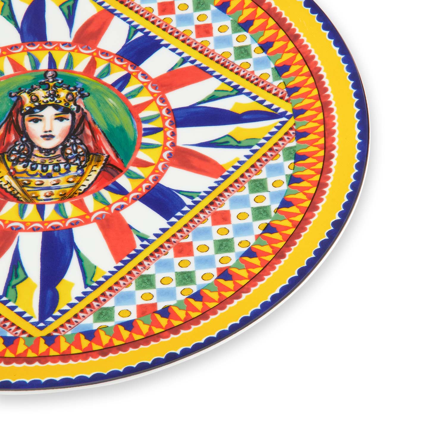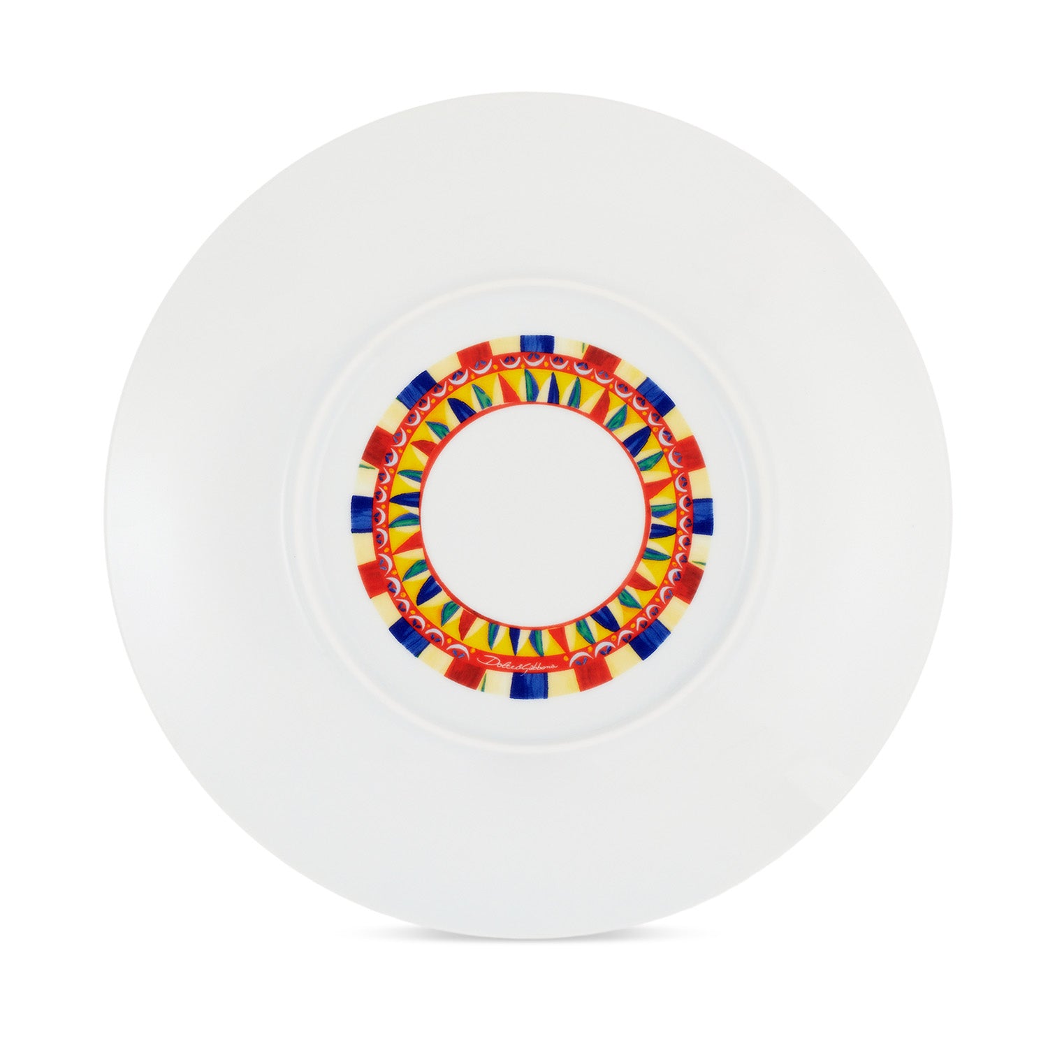 This beautiful charger plate, adorned with a stunning motif inspired by an archival foulard print, pays homage to the iconic Carretto Sicilano. This element from a place rich in tradition, artistry, and vibrant colors is deeply ingrained in the essence of Dolce&Gabbana's brand. Perfect for those who desire to express their individuality through an eye-catching table setting, this decorative plate is adorned with raised details created by expertly applying a clear glaze with a brush. Crafted with skilled Italian workmanship, this underplate is incredibly durable and resistant to scratches and wear. Featuring a sophisticated coup design on both sides, this dish adds elegance to any dining experience.
