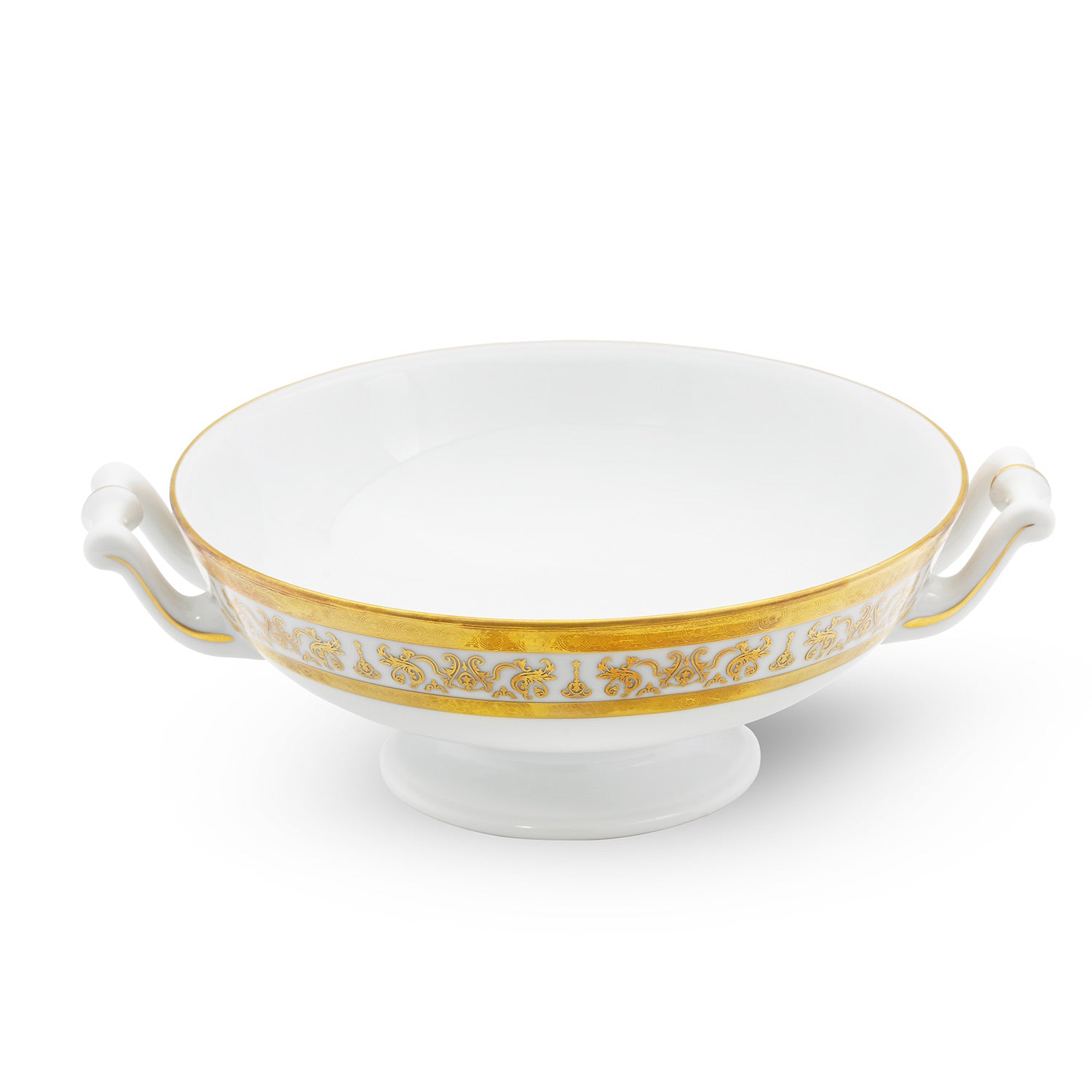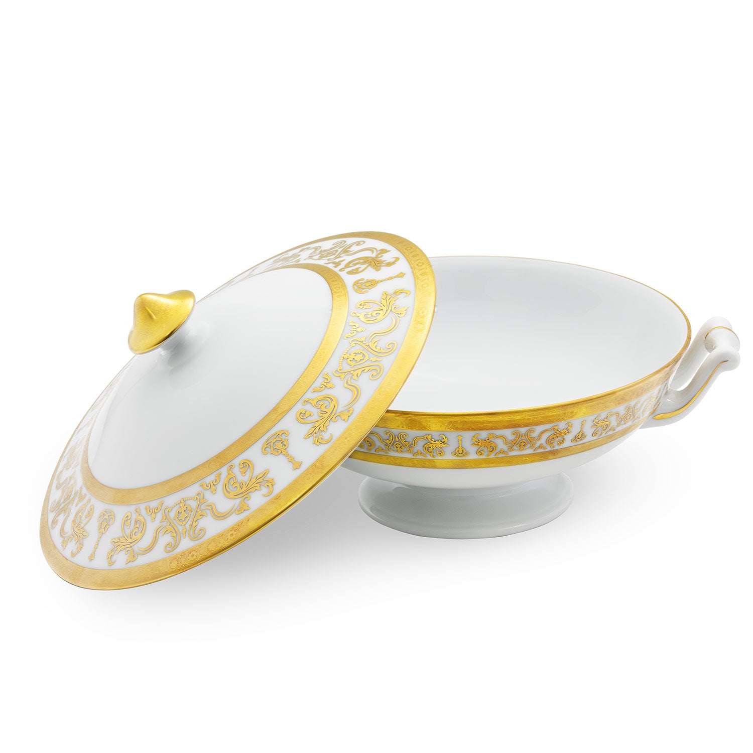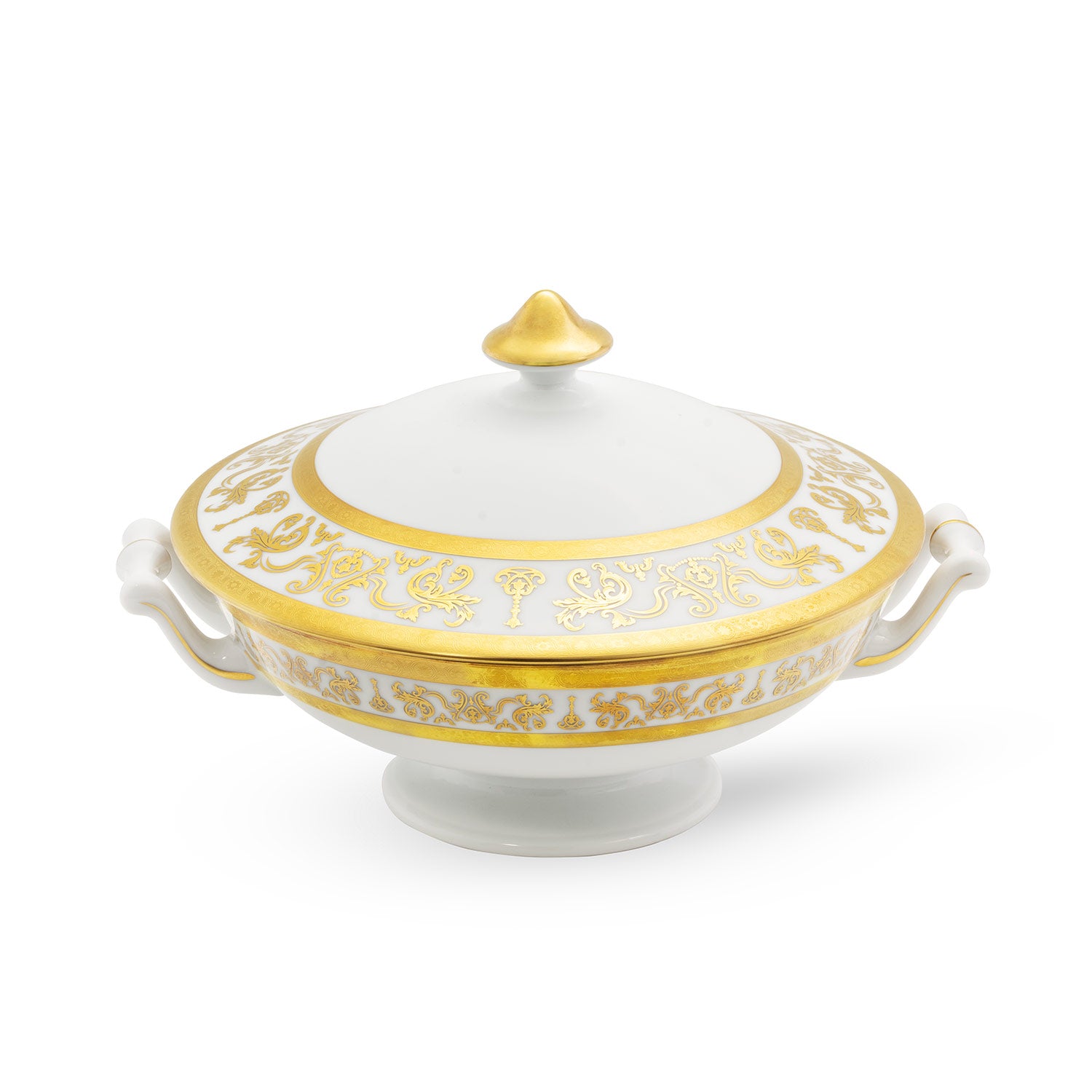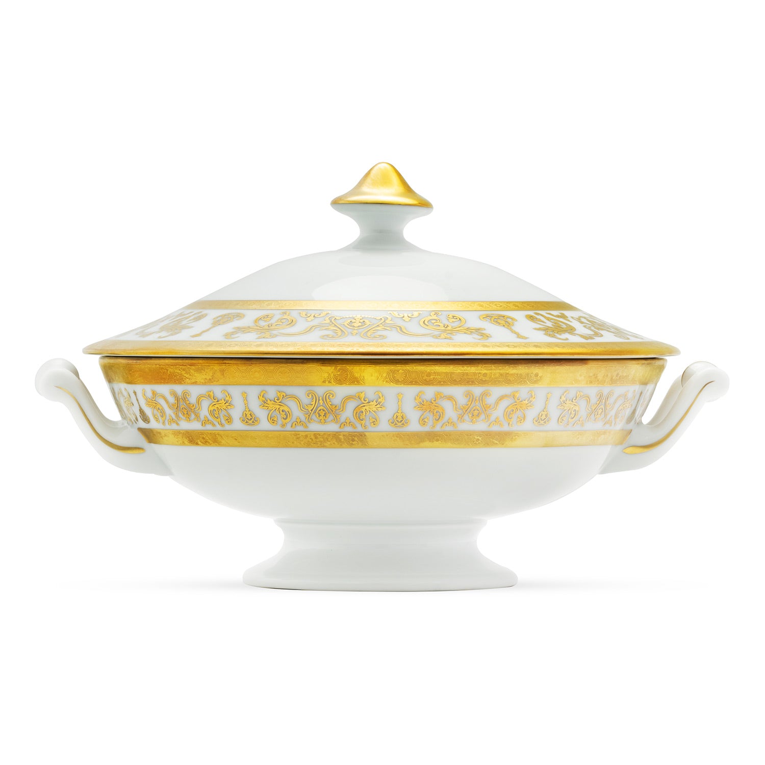 Inspired by the opulent decor of The Shangri-La Hotel in Paris, this exquisite vegetable dish combines sophistication with functionality. Crafted from porcelain and adorned with a 24k gold hand-painted design, both the lid and bowl feature soft blue celadon, ivory, and pure white tones harmonising with genuine matte gold. This elegant piece will elevate your crockery cabinet, adding a touch of luxury. It also makes a beautiful decorative accent, whether displayed on a stand or used for serving.