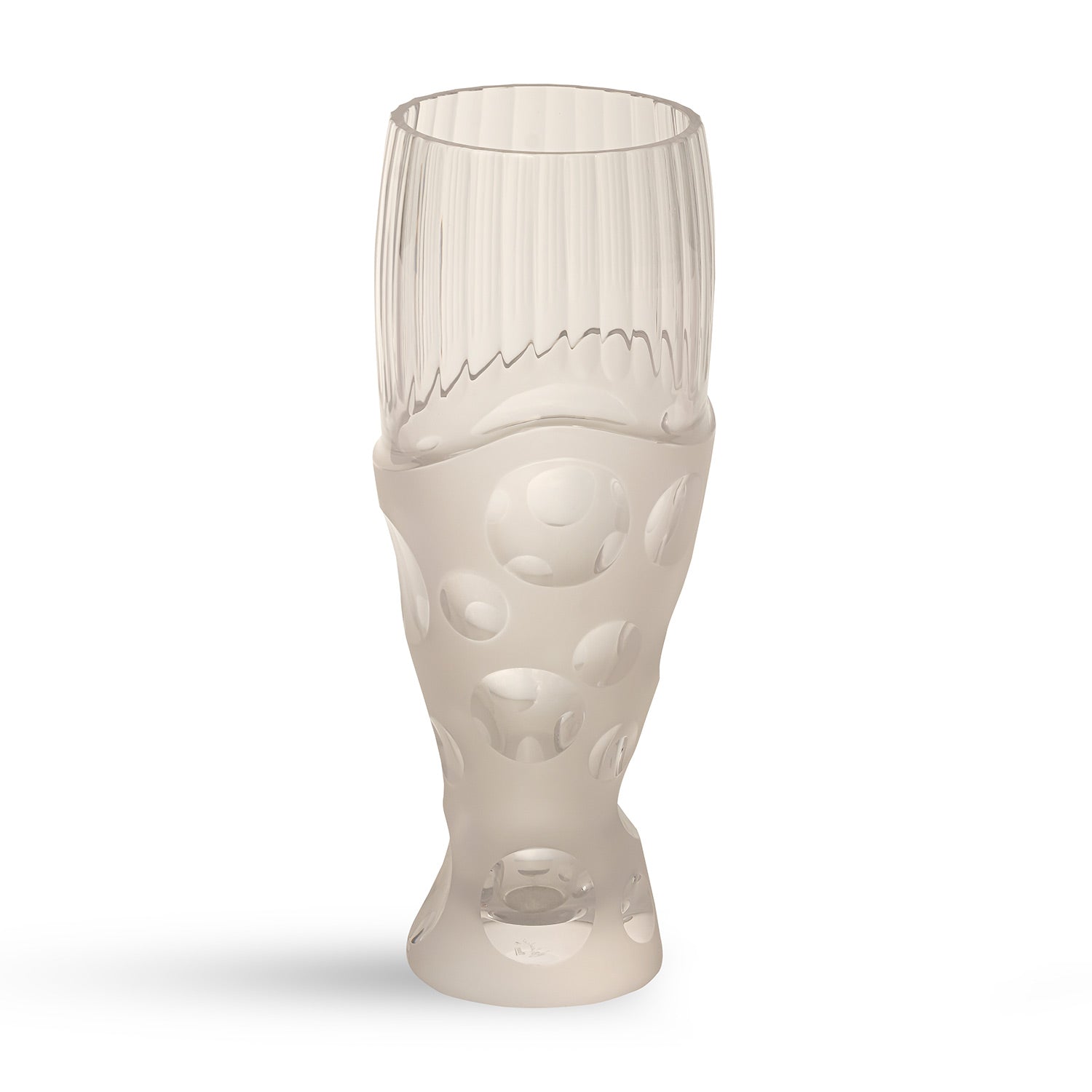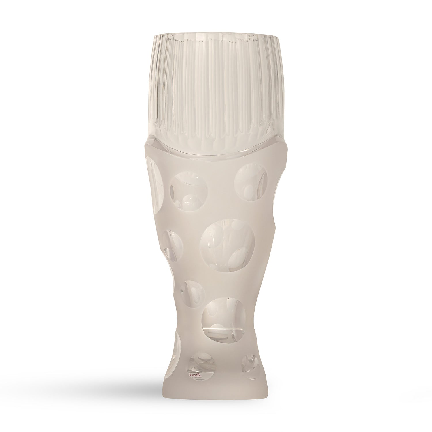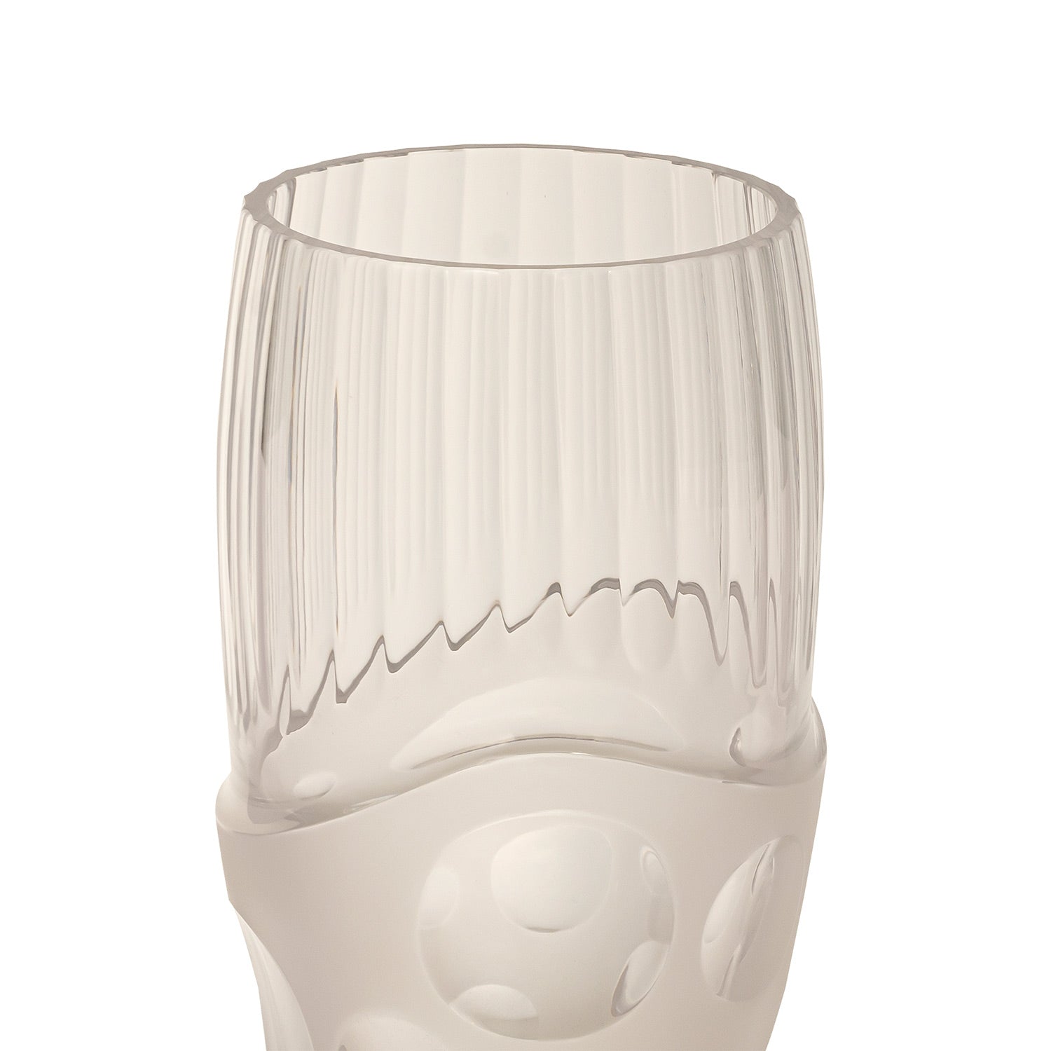 The Moser Grooves Vase features a two-part design with intricate engravings. The lower section has a heavy pattern, while the upper part boasts a striped design. Made from fine crystal, this vase exemplifies Moser's masterful craftsmanship and attention to detail. Its unique design and elegant appearance make it a perfect decorative piece for any home.