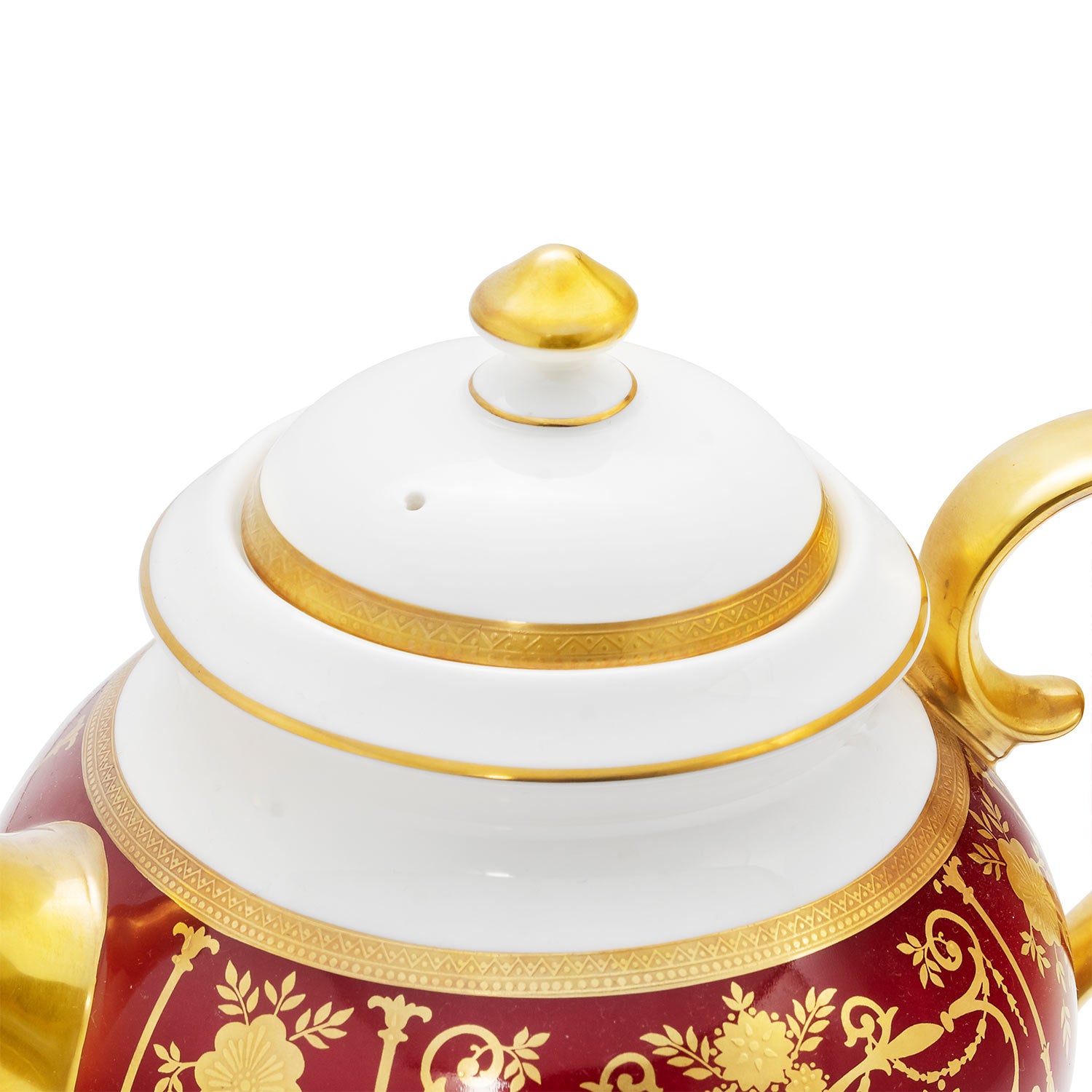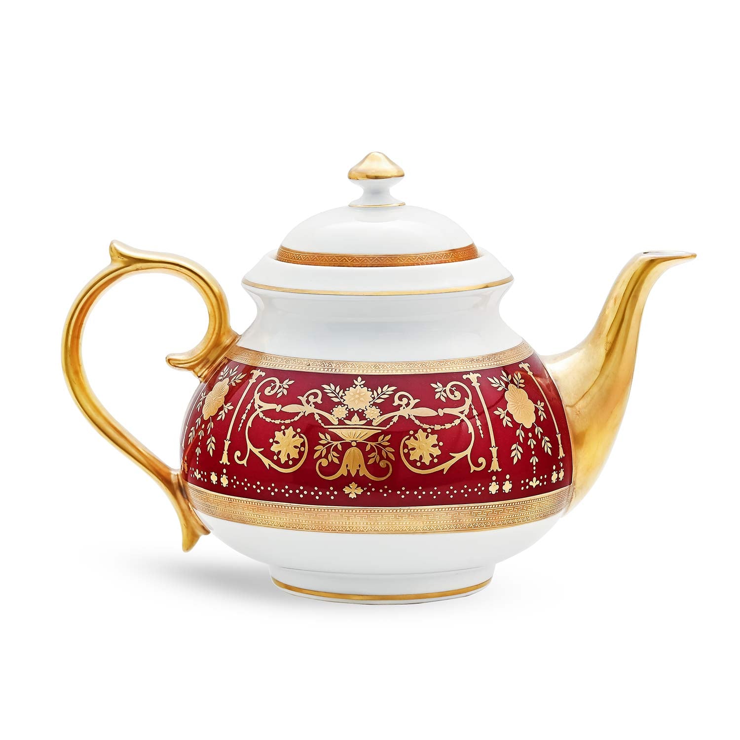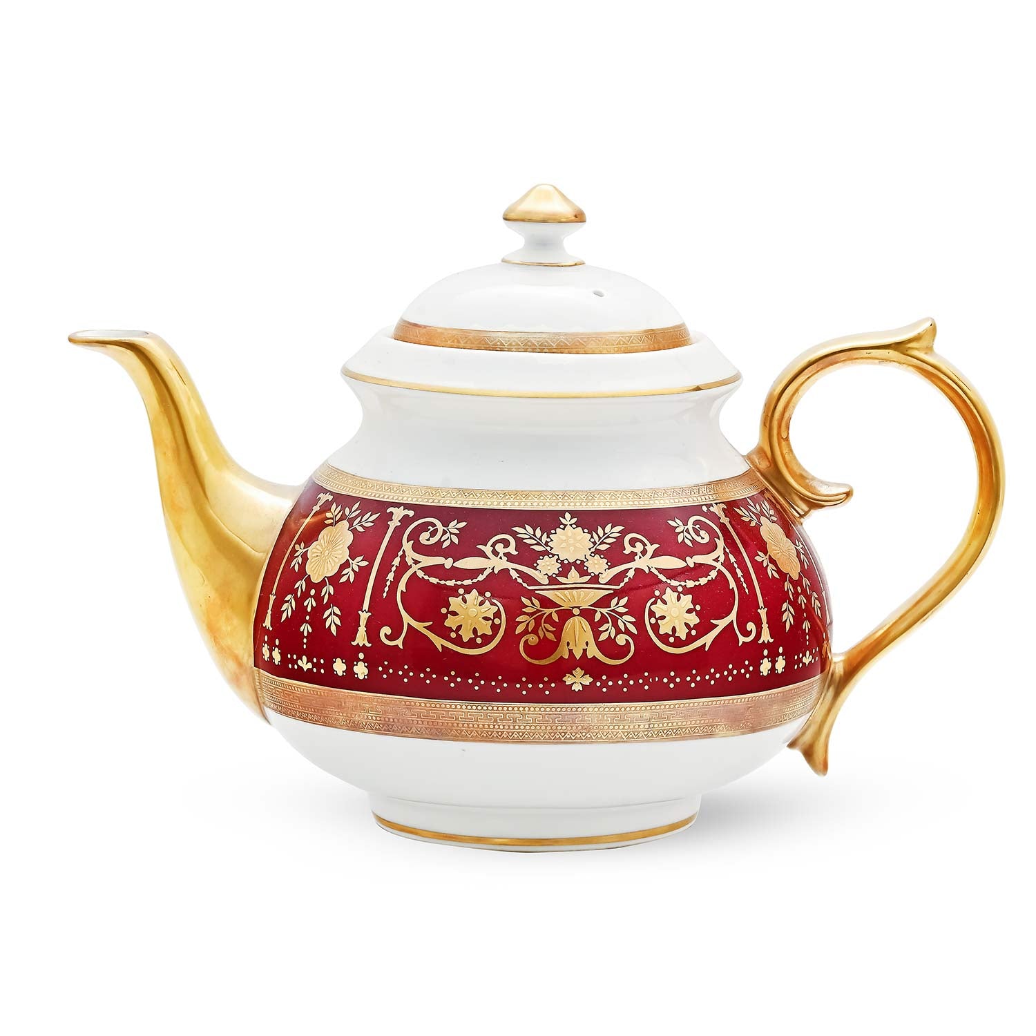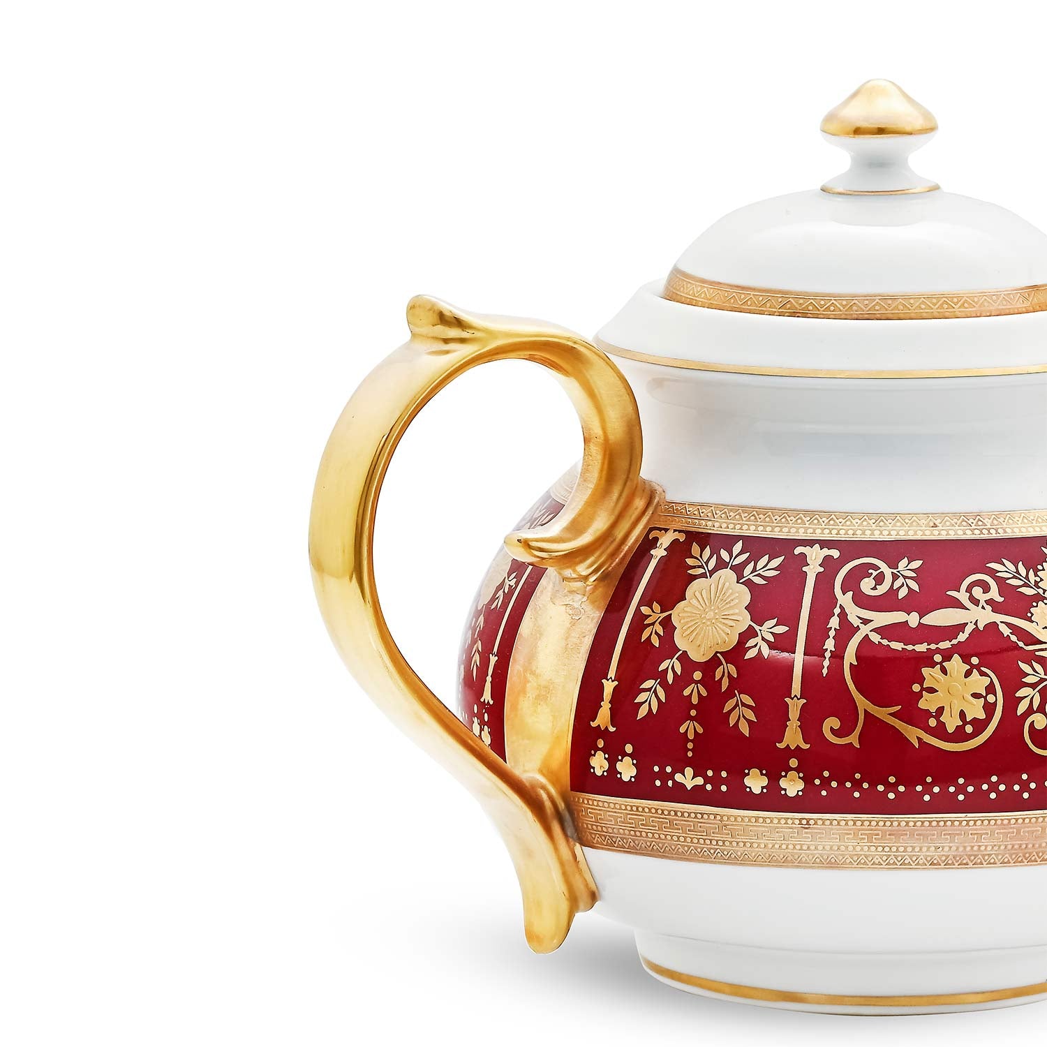 Handmade in Stoke-on-Trent, the Large Tea Pot Florette Ruby is a fine bone china piece adorned with 24K gold. The lid and bowl feature intricate designs, while the handle and pourer are gold-painted. The rich ruby color provides a graceful complement to the gold paint, creating a stunning visual impact. This ornate Regency-style teapot can be used as both a decorative accent and a functional crockery article, making it a perfect choice for enhancing elegant and sophisticated dining experiences.