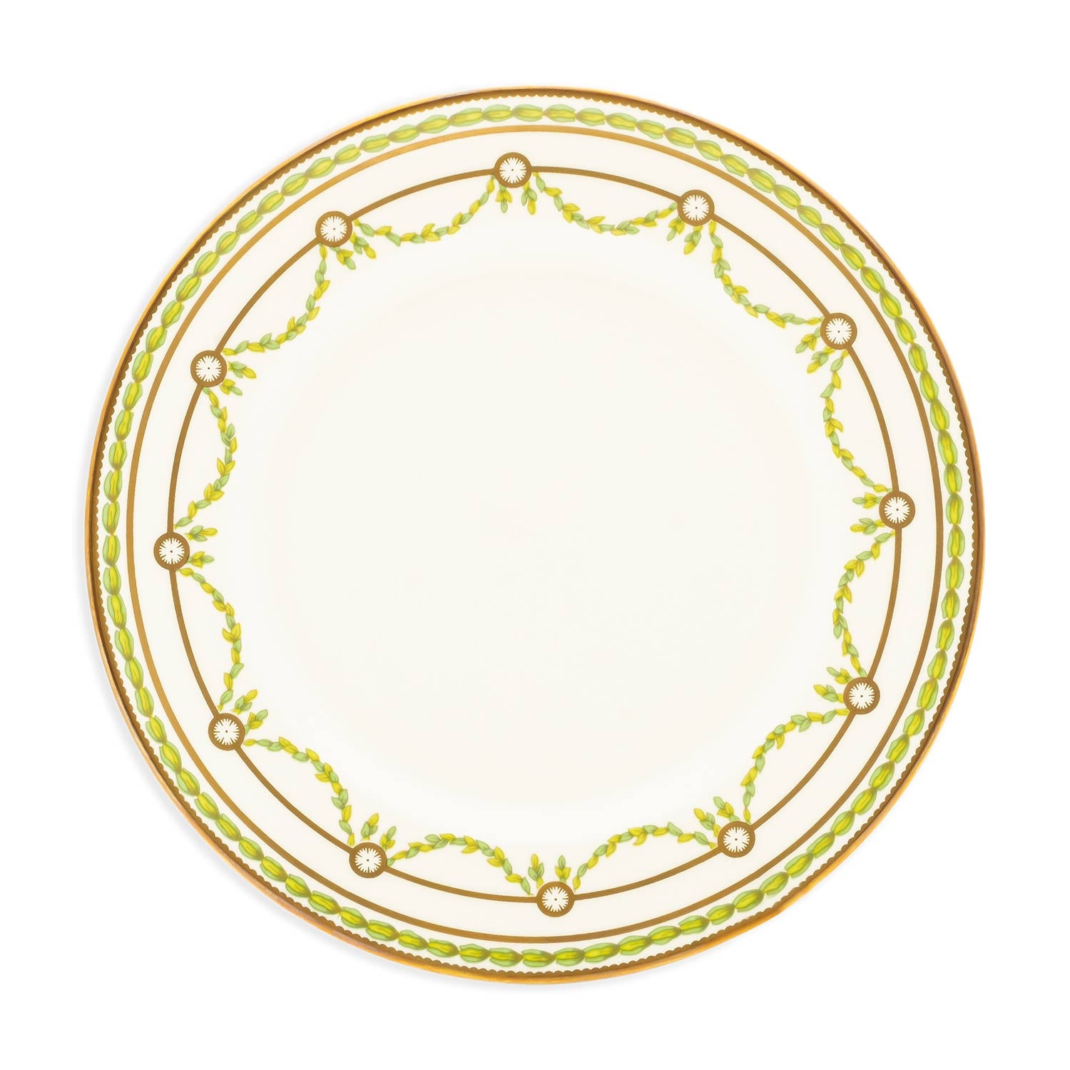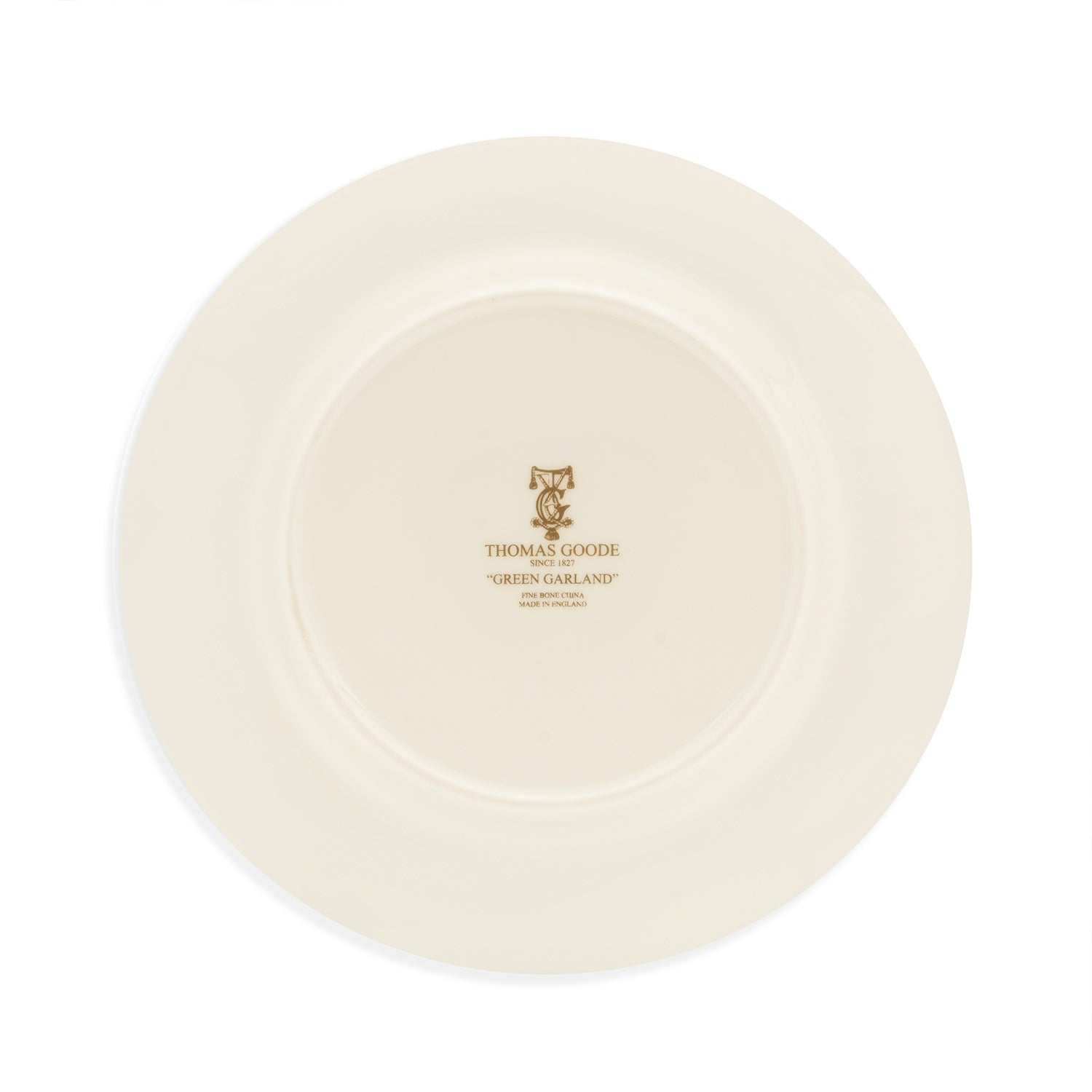 Handcrafted in Stoke-on-Trent, the Side Plate Green Garland is a historic design originally created for Russian aristocracy. Made from fine bone china, this plate is adorned with a green symmetrical garland around the rim. The classic white china is enhanced by gilded, laced detailing, creating a simple yet elegant look. This small plate is perfect for adding a touch of historic charm to any traditional table setting.