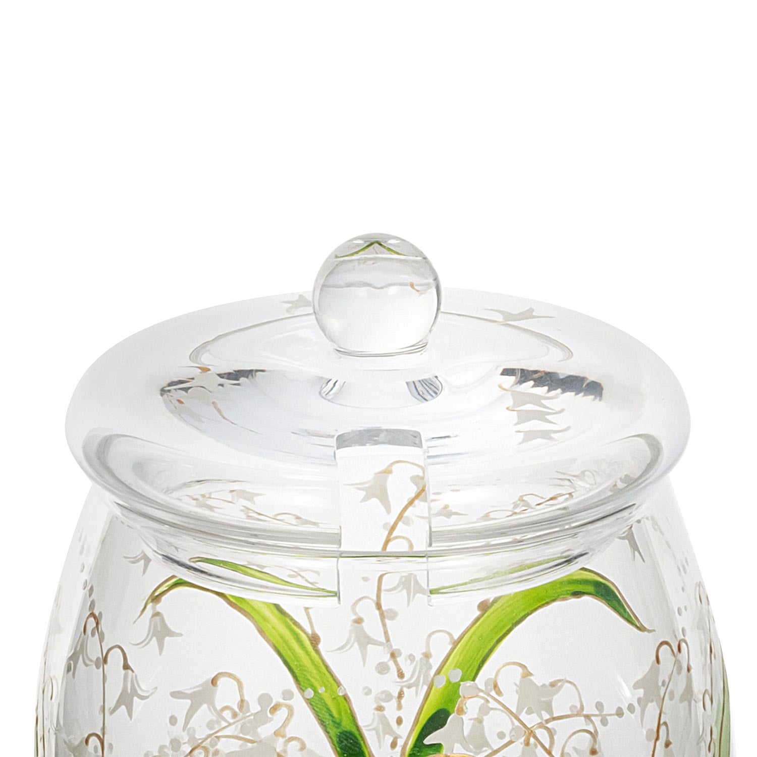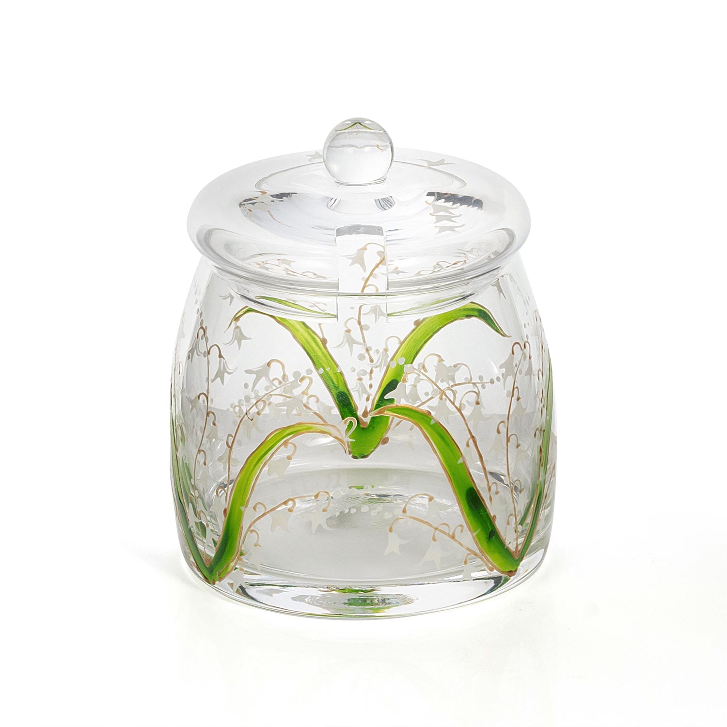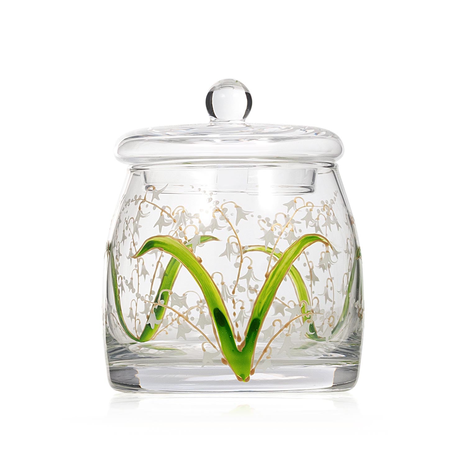 The Lilly Jam Pot is a beautiful fine crystal piece, hand-painted with delicate lily patterns in white and green. The lid features a crystal ball handle, adding a touch of elegance and practicality. This hand-painted jam pot combines functionality with artistic charm, making it a lovely addition to your breakfast table. The intricate floral design enhances its visual appeal, adding a touch of sophistication to your dining experience.
