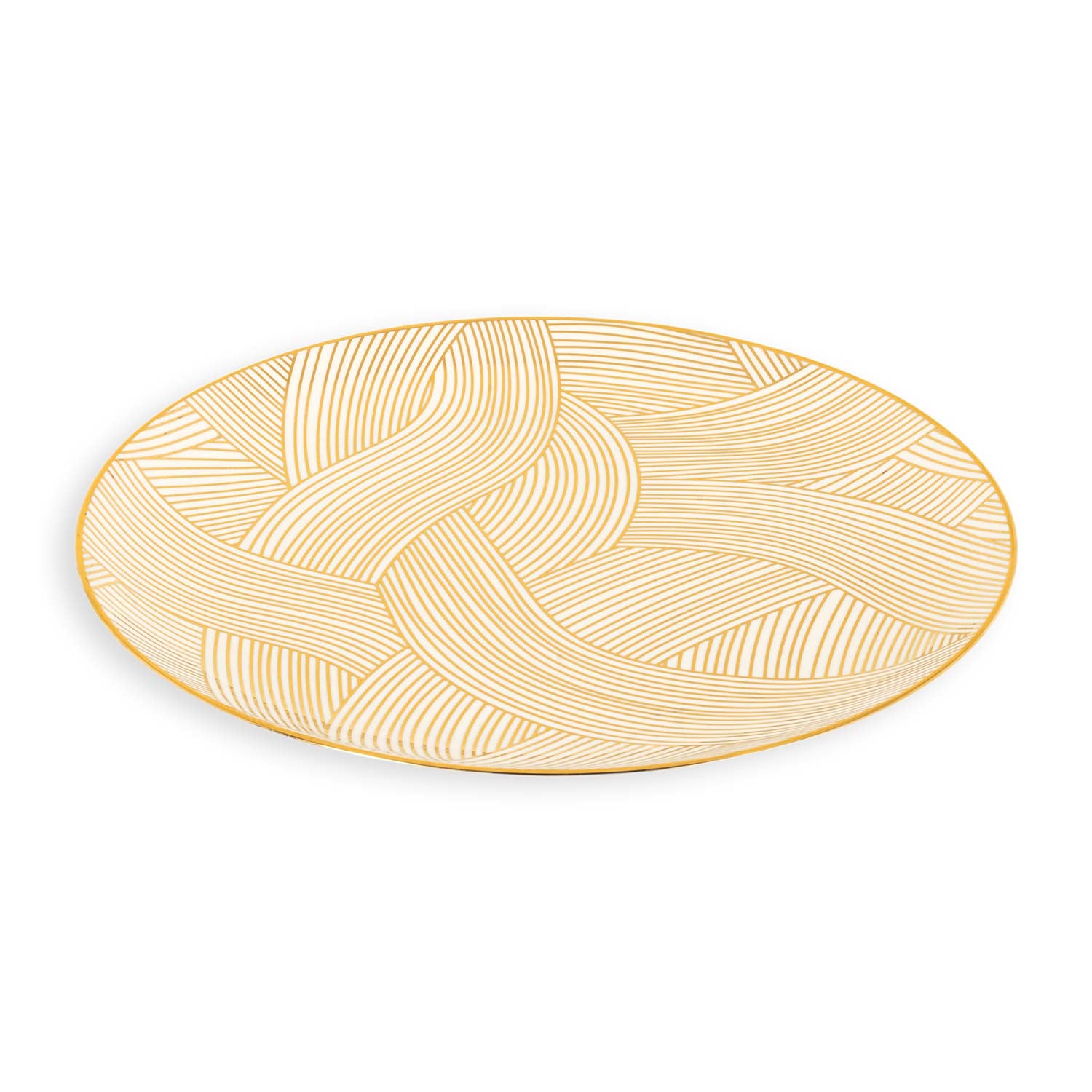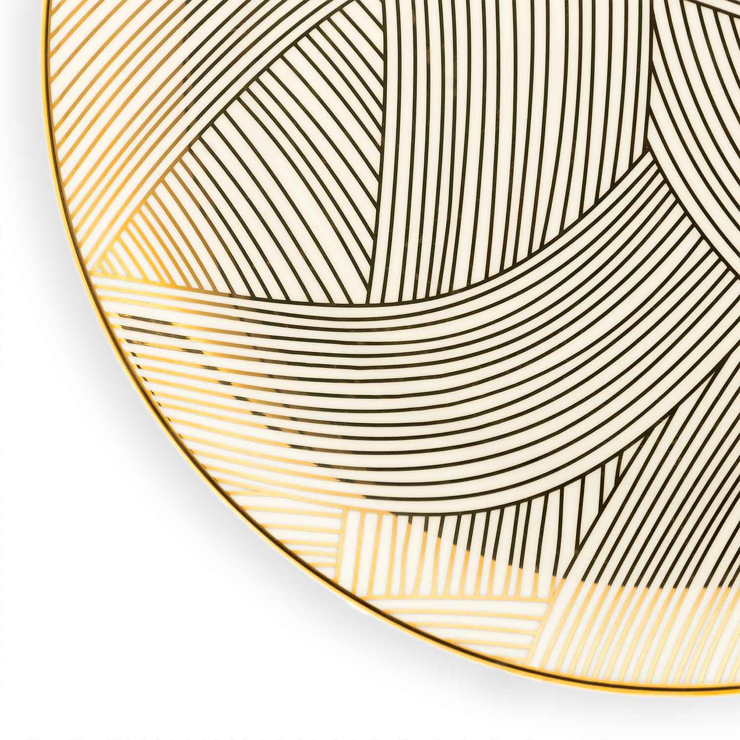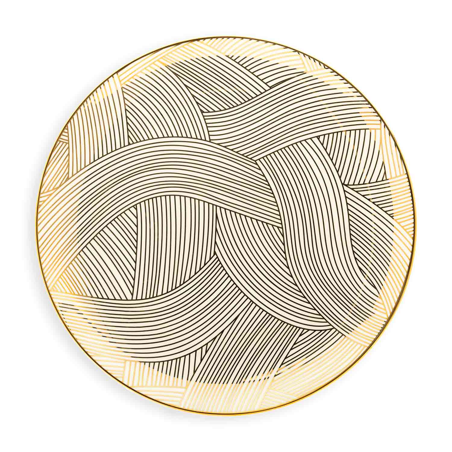 Allow us to introduce the Lustre Dinner Plate by 1882 Ltd from their Lustre collection, an award-winning series of bone china crockery paired with 22-karat gold. Featuring an overlapping black Dhow pattern and hand-gilded 22-carat gold details, this plate has been crafted from fine bone china. A design work by Bethan Gray, the accent draws inspiration from the billowing sails of Omans distinctive sailing boats. Reflecting the Johnson Brothers legacy of craftsmanship since 1882, this luxurious plate is a perfect blend of elegance and sophistication. Add this exquisite piece to your collection and let your dining table exude refined luxury.