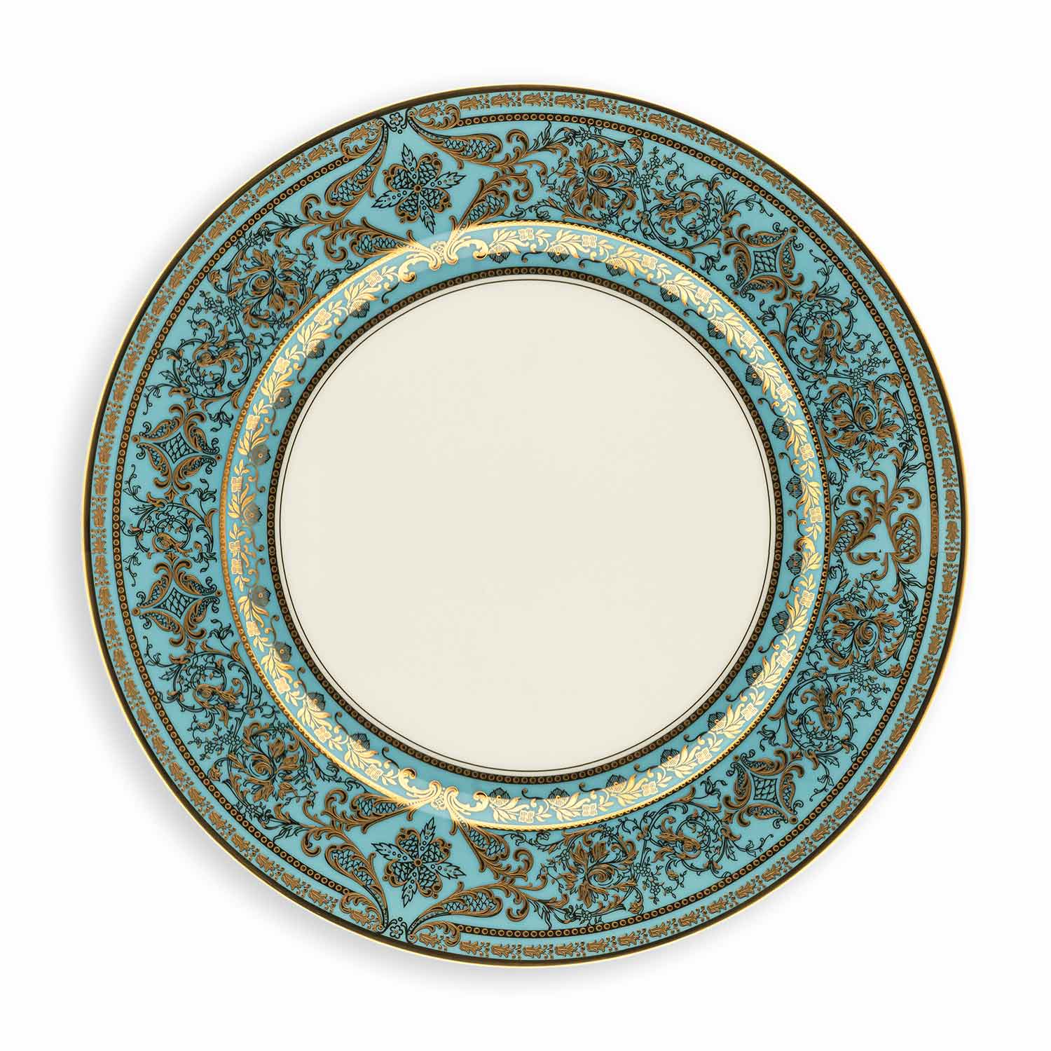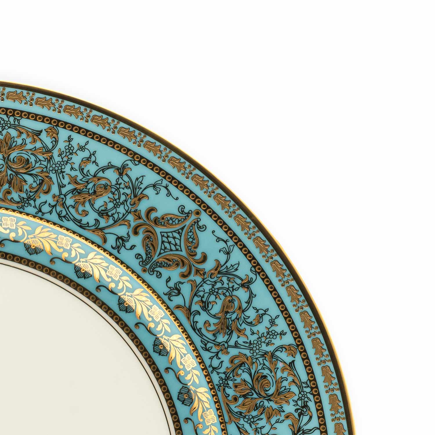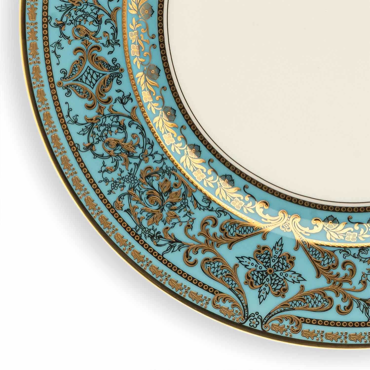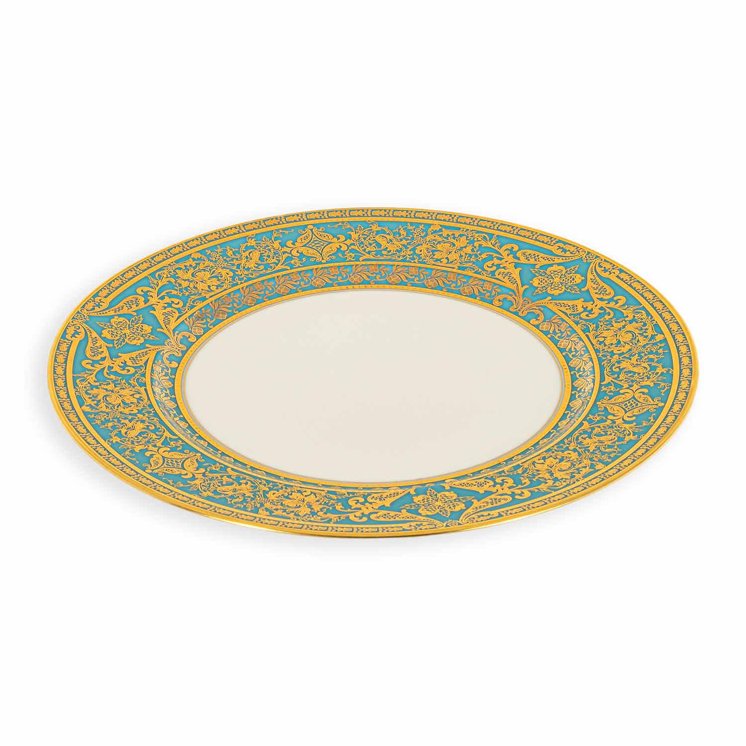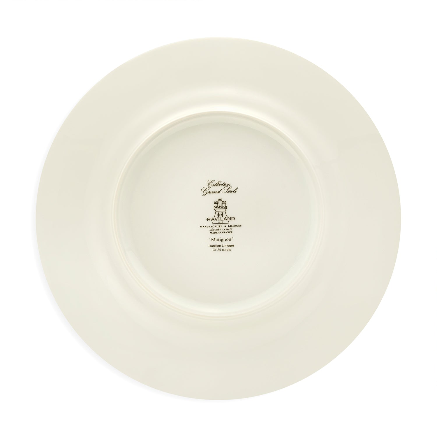 The Haviland Matignon Side Plate boasts a sophisticated design in shades of blue, beautifully surrounding the serving area. The delicate craftsmanship is evident in the intricate patterns created with both dark and light hues. Essential for an exquisite dining experience, this dessert plate is crafted from Porcelain and adorned with 24k gold detailing.