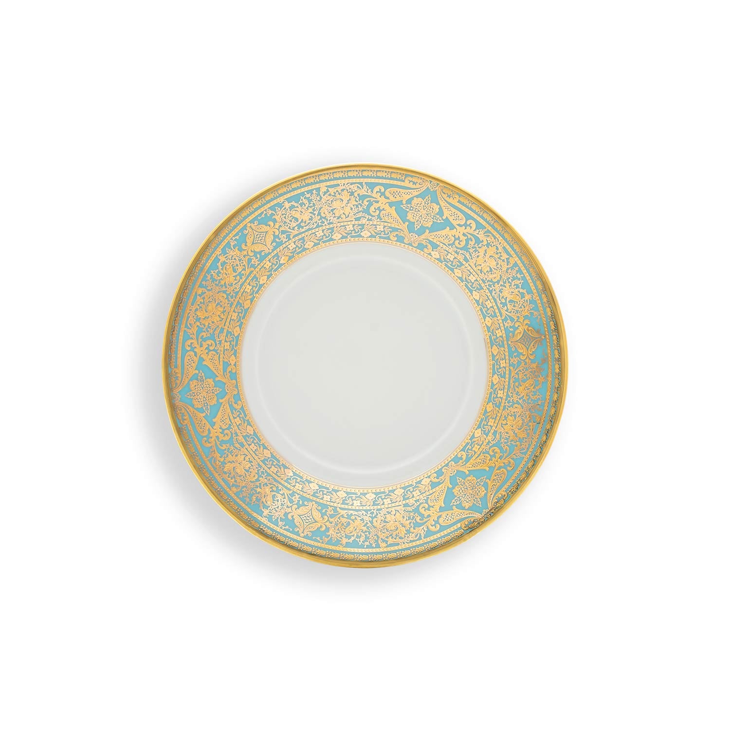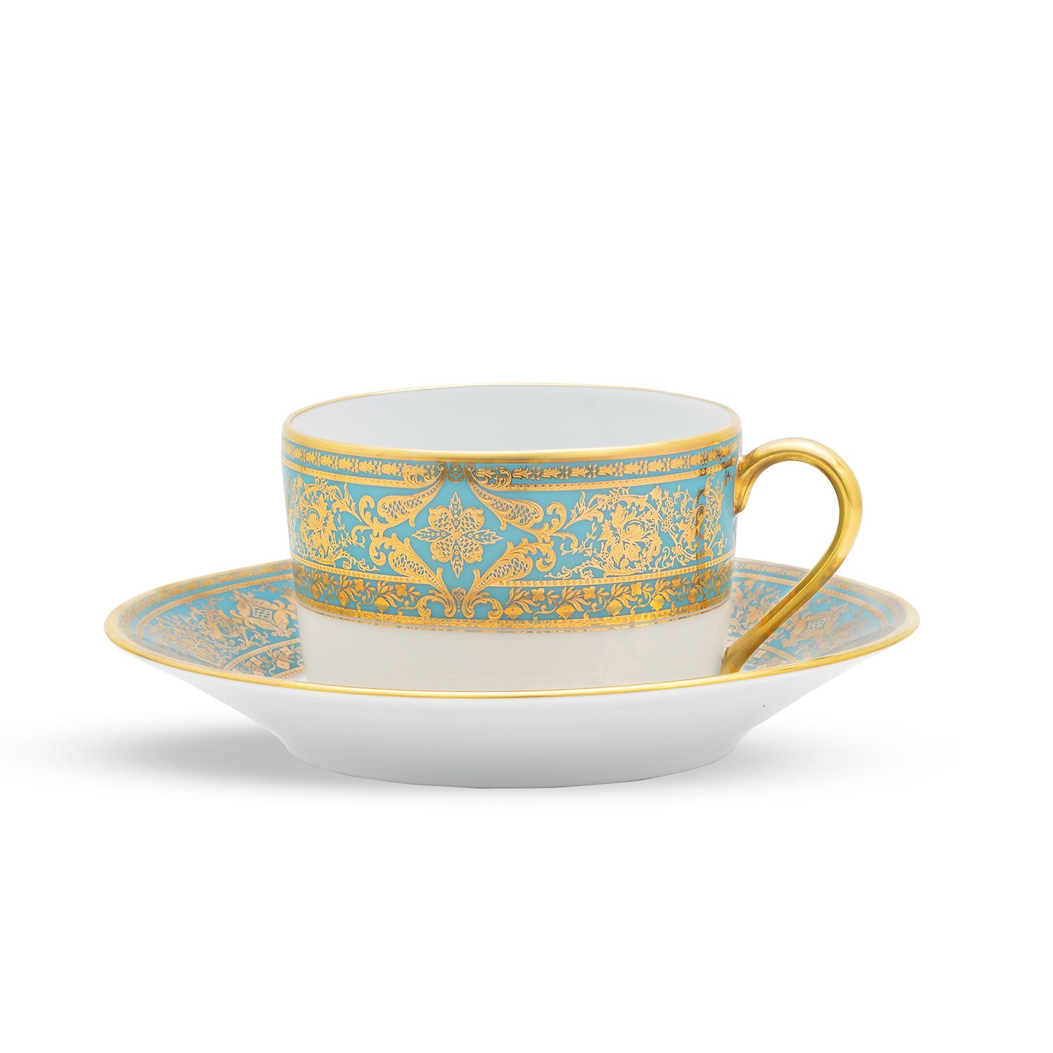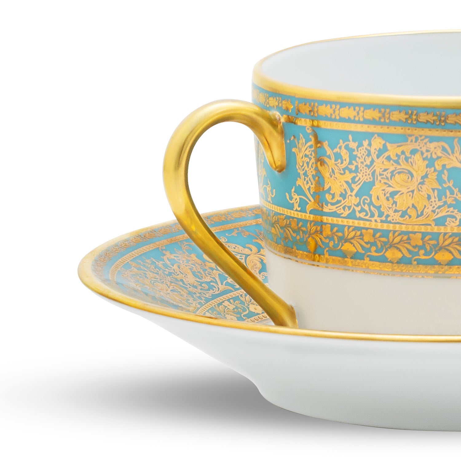 The Haviland Matignon Tea Cup and Saucer Set exudes elegance with its stunning design in shades of blue, beautifully enhancing both the cup and the saucer. The intricate artistry, featuring delicate patterns in a blend of dark and light hues, is a testament to its refined craftsmanship. Perfect for an exquisite tea time experience, this set is crafted from luxurious porcelain and adorned with 24k gold accents