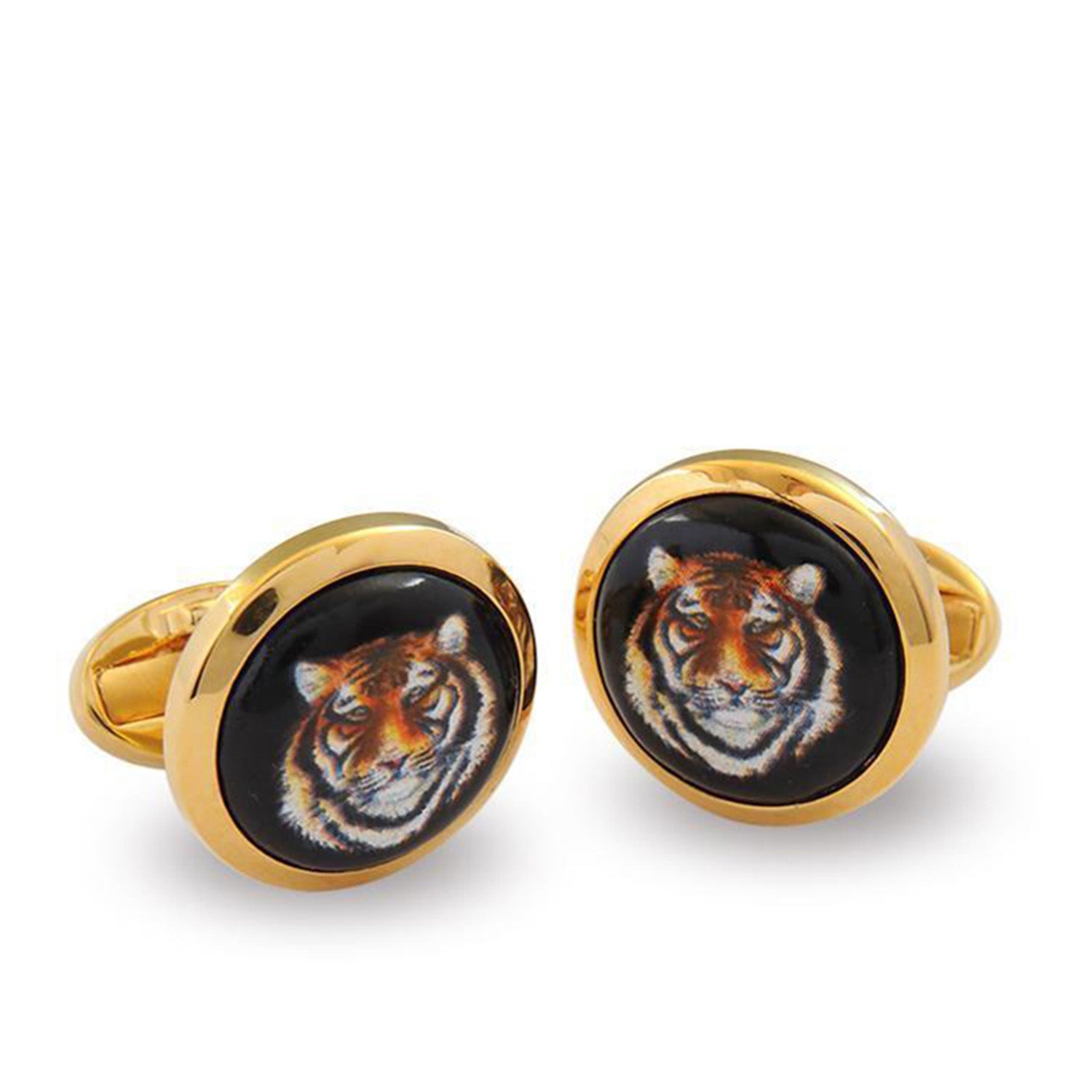 Our tiger head cufflinks are handmade in the heart of England from gold-plated brass and enamel.They make a roaringly stylish addition to shirtsleeves.