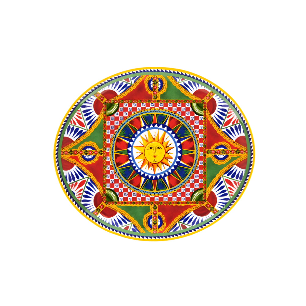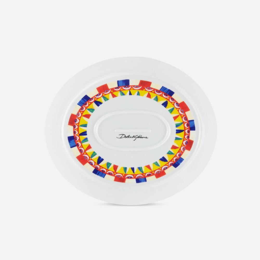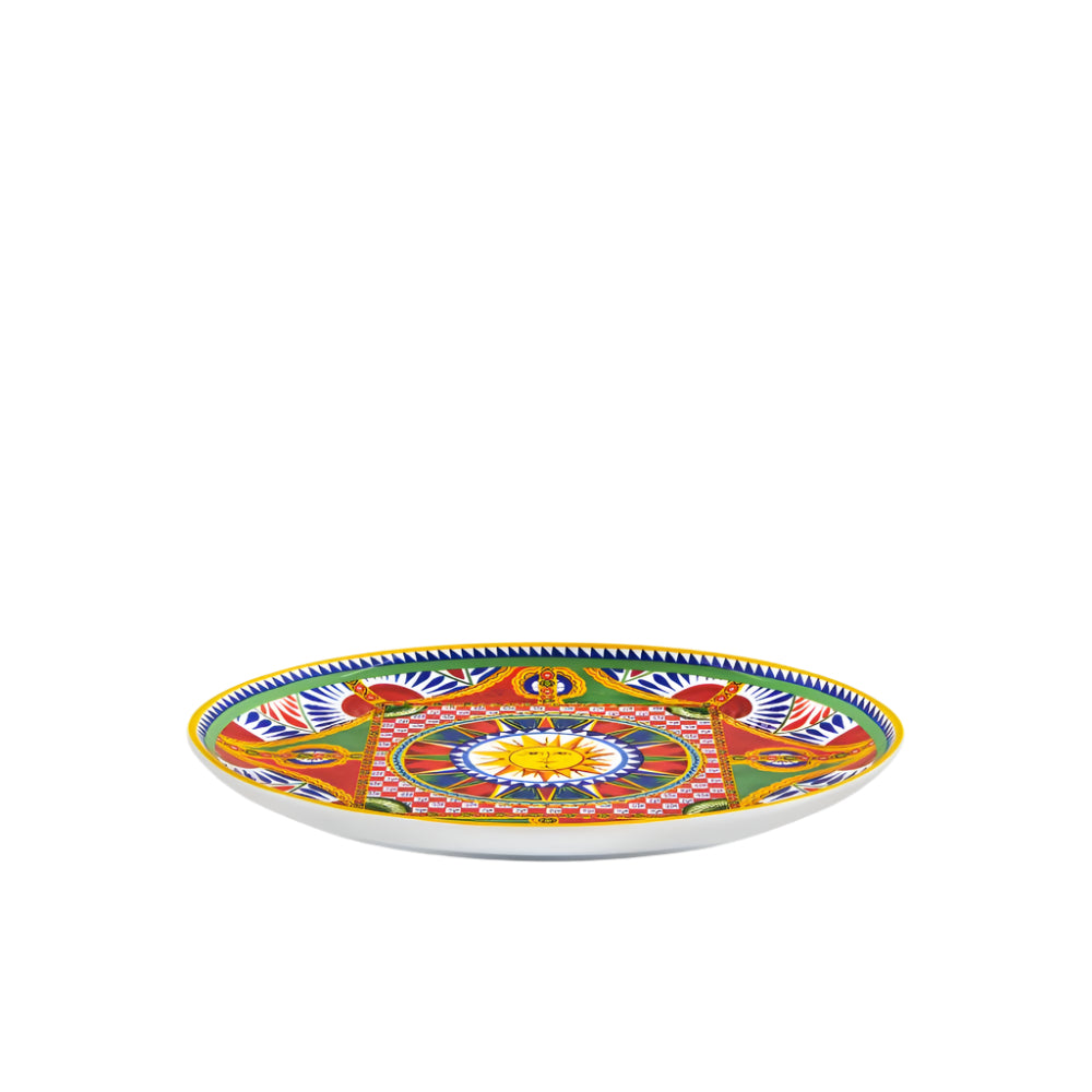This porcelain platter features a design inspired by an archival foulard print, paying homage to the Carretto Siciliano. This folkloric element is deeply rooted in a heritage of traditions, artistic craftsmanship, and vibrant colors that encompass the essence of Dolce & Gabbana's aesthetic. Crafted for those who seek to showcase their unique personality through a striking presentation, this serving platter is adorned with raised details achieved through the application of clear glaze with a brush, exemplifying exquisite Italian artisanship. With a production technique specially chosen for its durability against scratches and abrasions, this platter is equally decorated on both sides and boasts an elegant coup design.