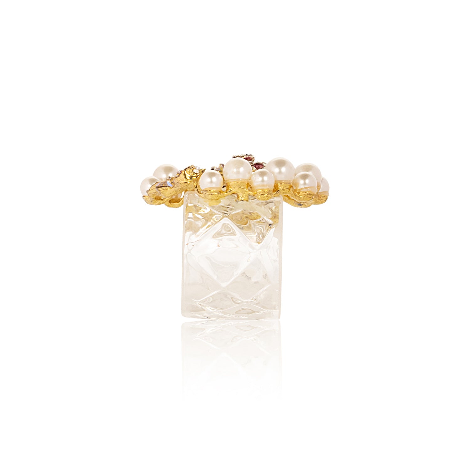 The Pearl Napkin Ring exudes elegance with its golden hue, adorned with crystals and a striking red ruby stone at the center. Handcrafted with meticulous care, this napkin ring adds a touch of luxury to your dining table, perfect for formal dinners or special occasions. Its intricate design and shimmering accents make it a captivating addition to any table setting, enhancing the overall ambiance with its refined beauty.