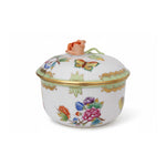 The Queen Victoria Sugar Pot is expertly crafted by Herend artisans and enhanced with delicate 24K gold accents, making it a delightful and practical addition to Herend’s teaware collection. Featuring the iconic Victoria pattern—one of Herend Porcelain Manufactory’s oldest and most celebrated designs—this piece displays nearly a hundred vividly colored butterflies and flowering twigs inspired by Far Eastern motifs. The gleaming white porcelain surface is richly adorned with this vibrant decoration, bordered by a gilded frame reminiscent of lush meadow greens. This distinguished design earned Herend international acclaim by winning first prize at the 1851 London World Exhibition and was proudly commissioned by Queen Victoria herself for her royal tableware.