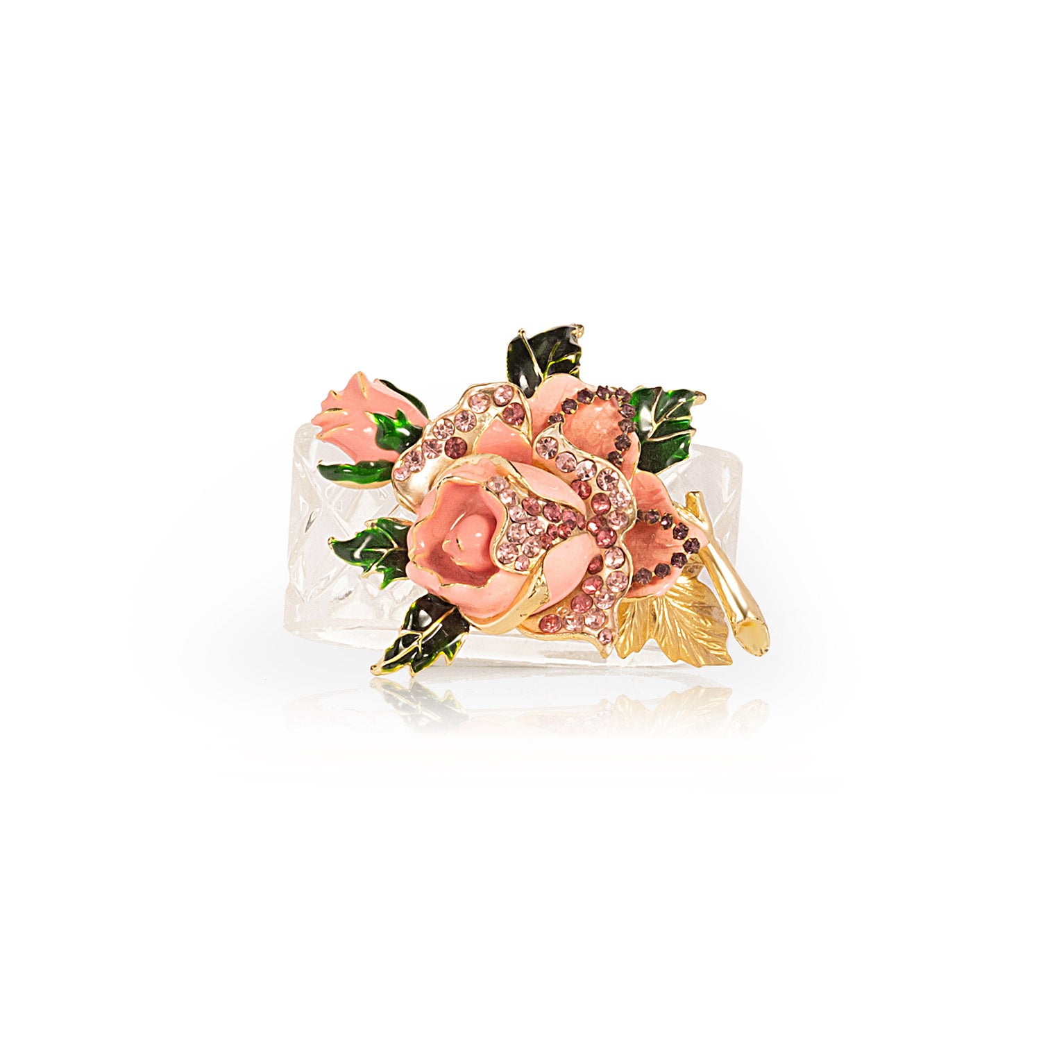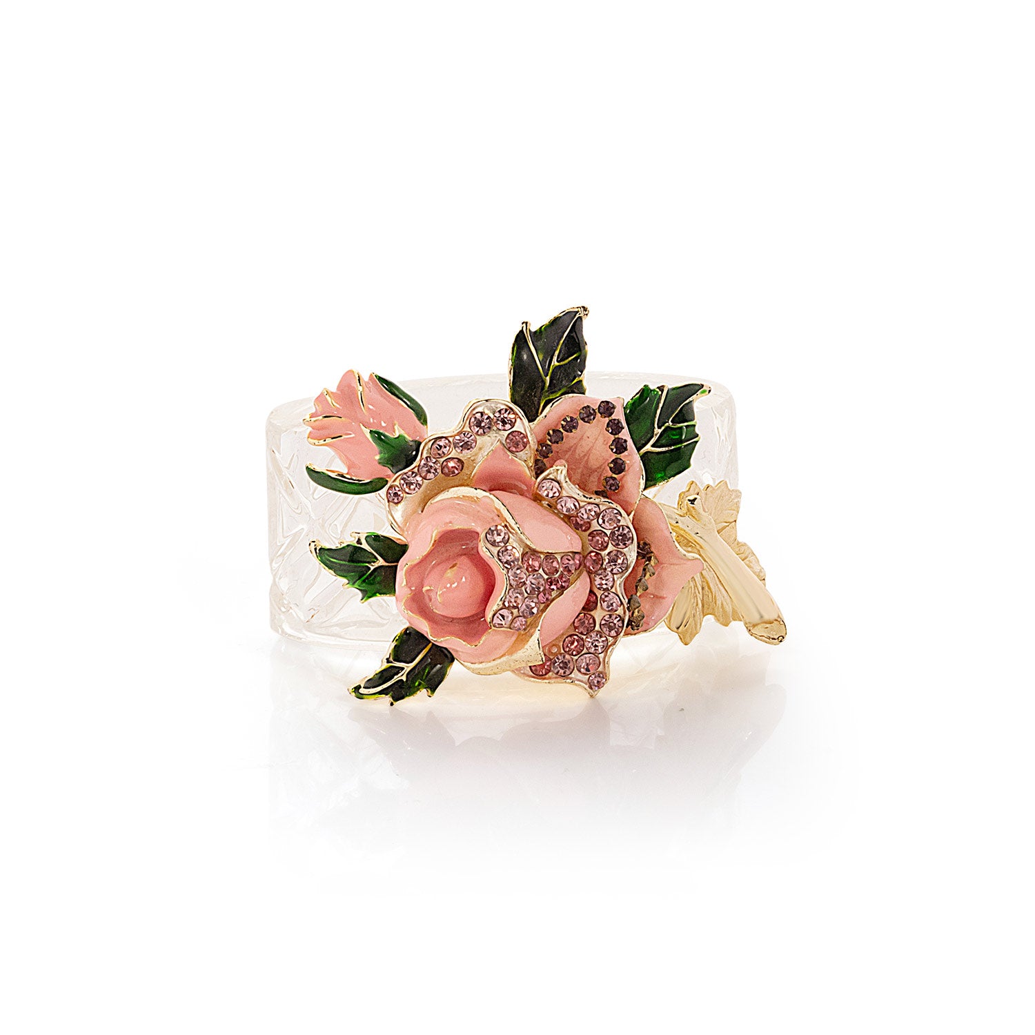 Infuse your table setting with the beauty of nature with the Rose Napkin Ring, showcasing a pink rose with silver lining and green leaves. Handcrafted to perfection, this napkin ring adds a touch of romance and elegance to any meal. Whether for intimate dinners or celebratory gatherings, its delicate design and natural colors create a charming ambiance that complements a variety of table settings.