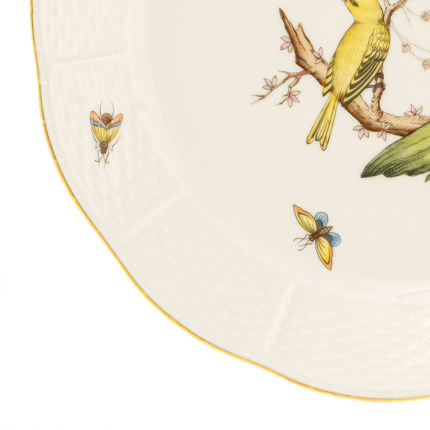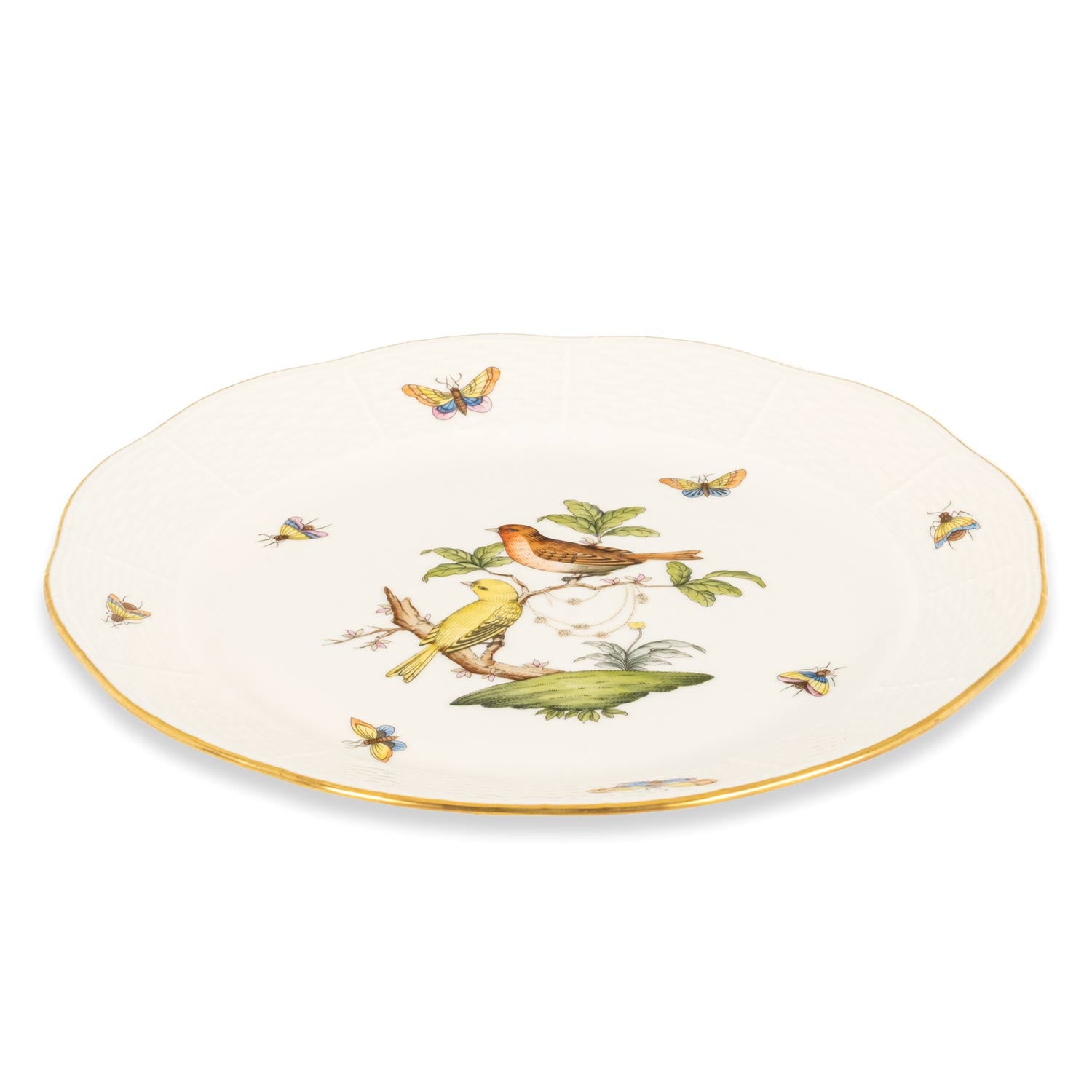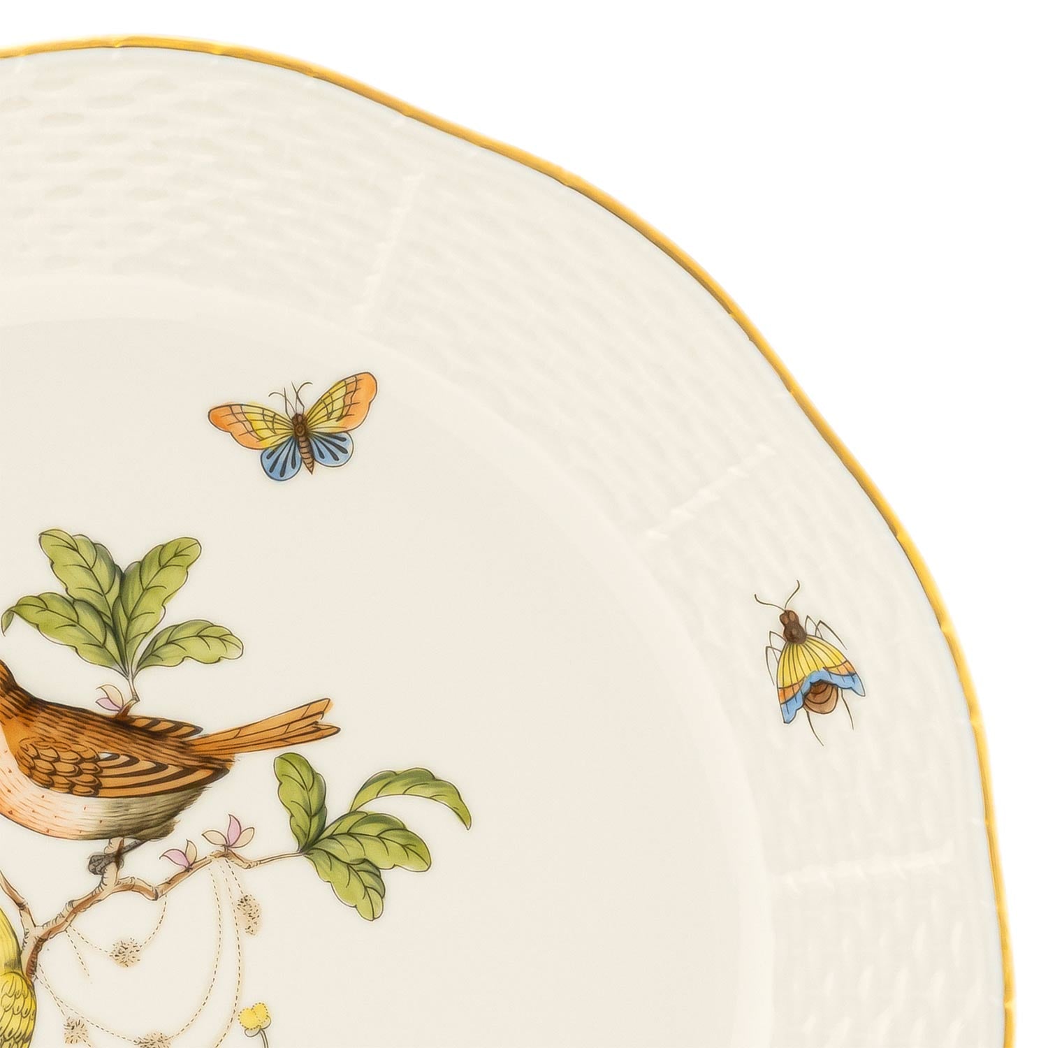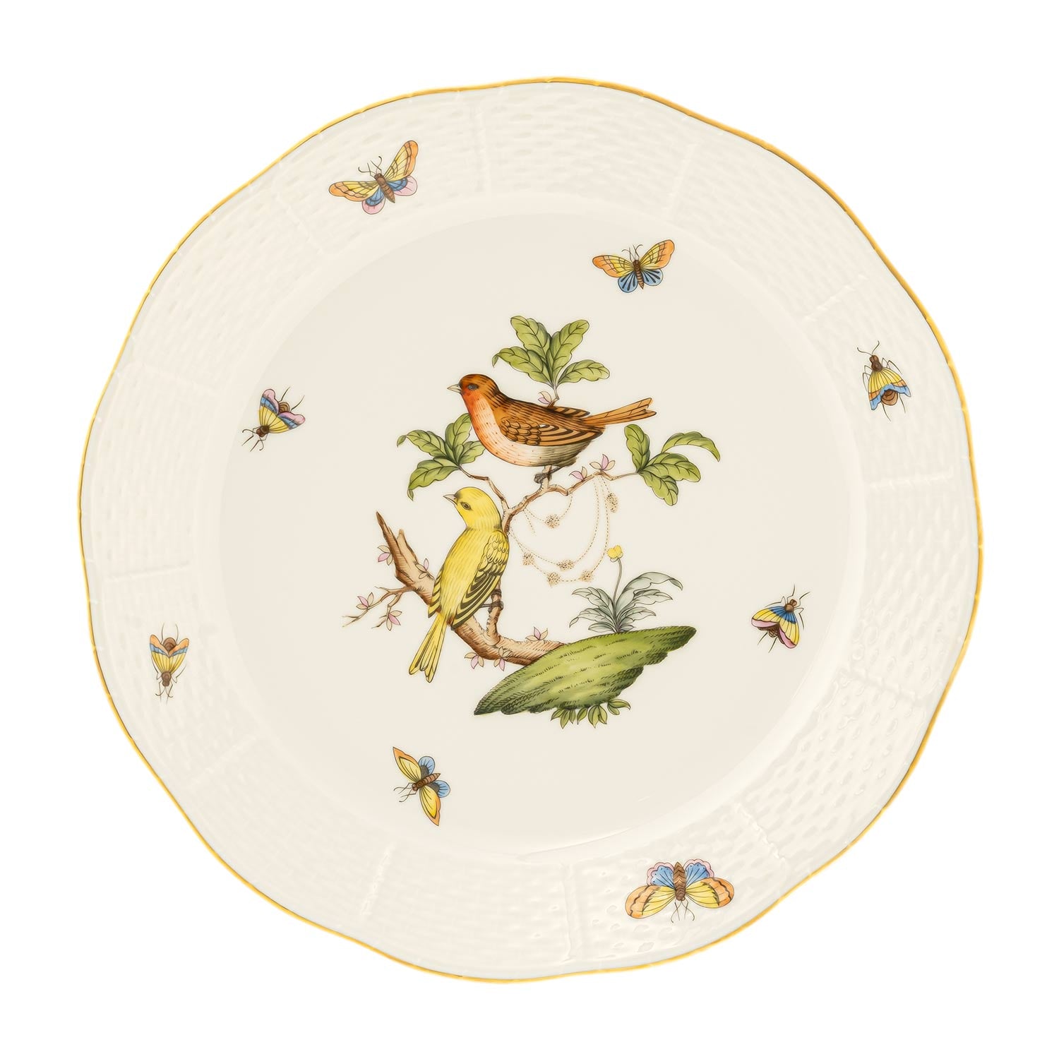 Indulge in a piece of art with every meal. Elevate your dining experience with the Rothschild Bird Dinner Plate, crafted from premium bone china. The centerpiece features a stunning, intricate bird design surrounded by delicate butterflies, adding a whimsical touch. The wavy border, finished with luxurious 24k gold paint, enhances the plate's elegance. Perfect for both special occasions and everyday use, this plate combines timeless beauty and functionality, making it a captivating addition to your tableware collection.