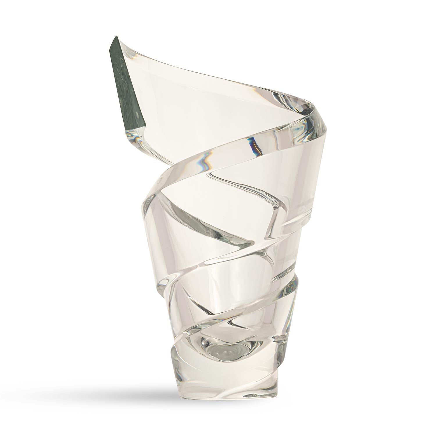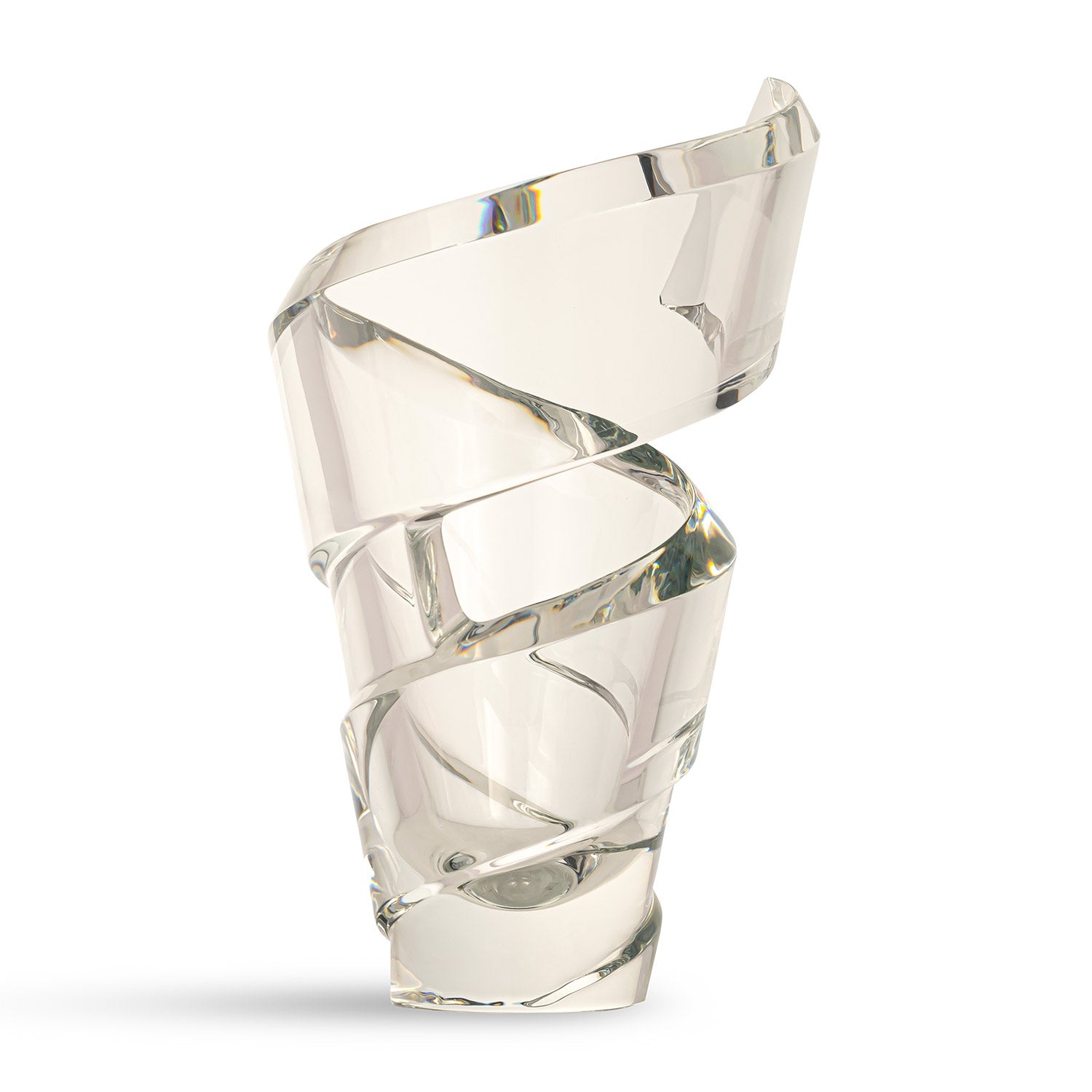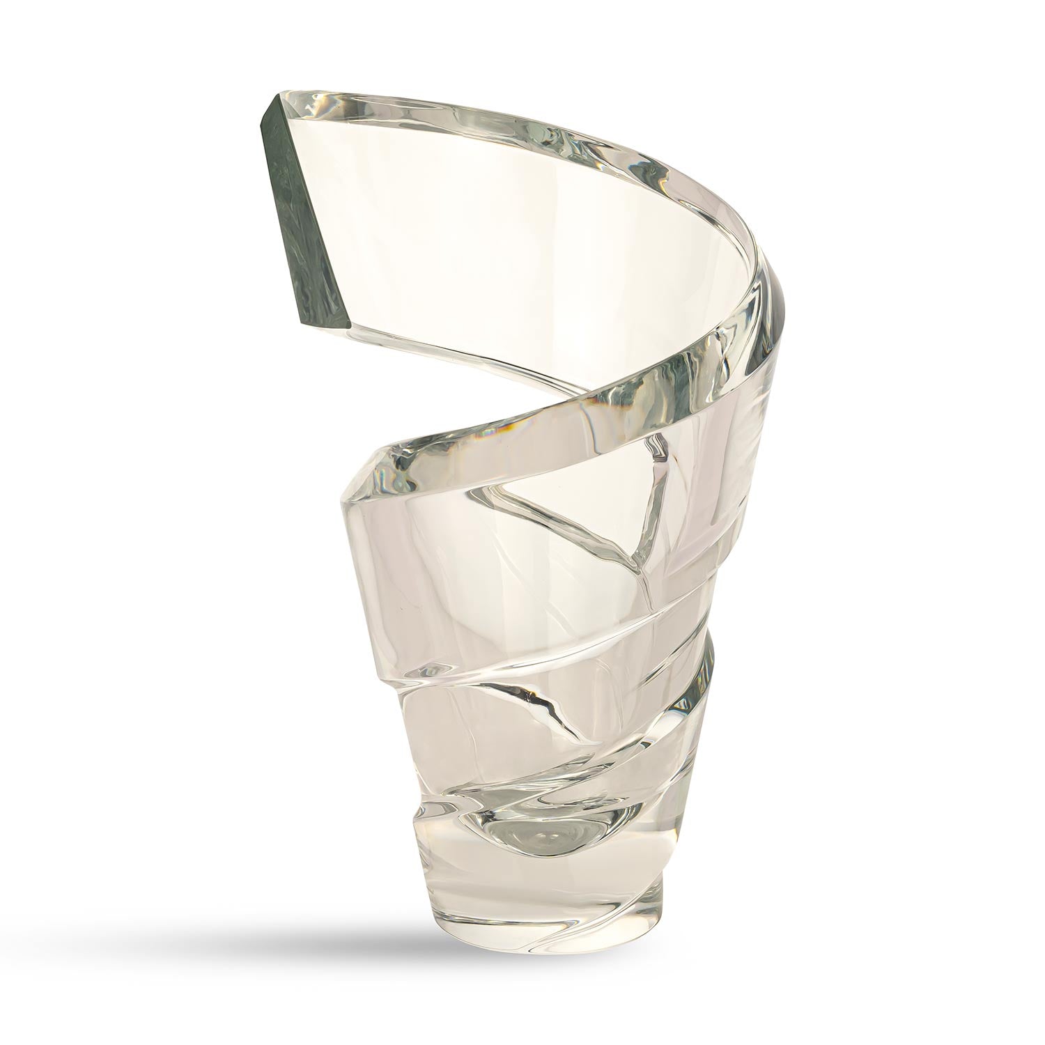 Nothing less than an artisanal poetry, the unique design of the Spiral Crystal vase is enough for its introduction. Reminiscent of a fluttering ribbon in the wind, the superimposed waving diagonals of the vase make it a center of attraction in any space. Though the vase is designed to hold flowers, the vase looks like a graceful bouquet itself.
