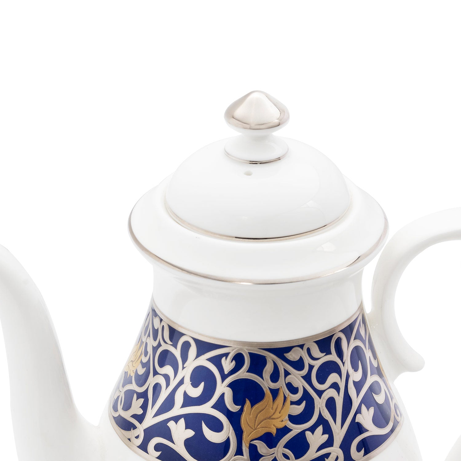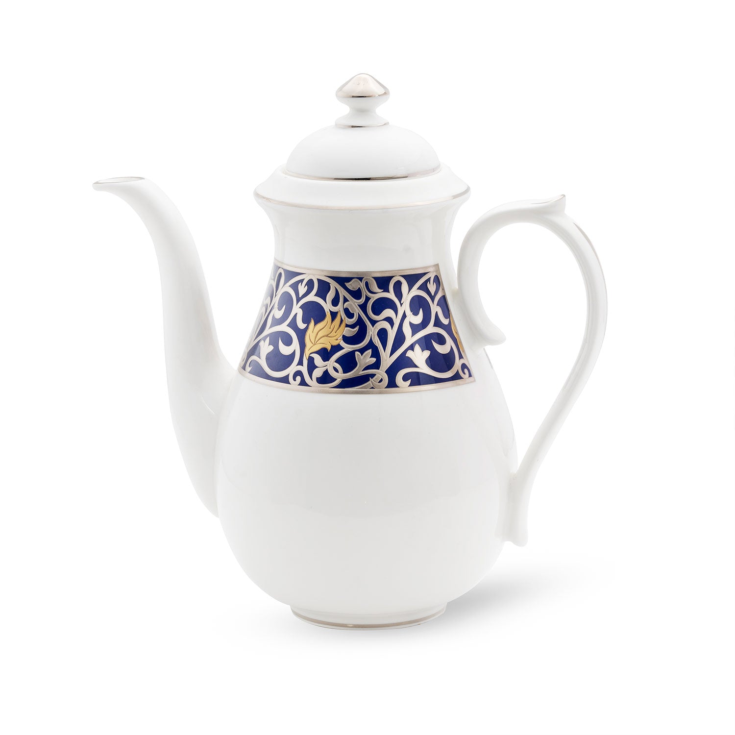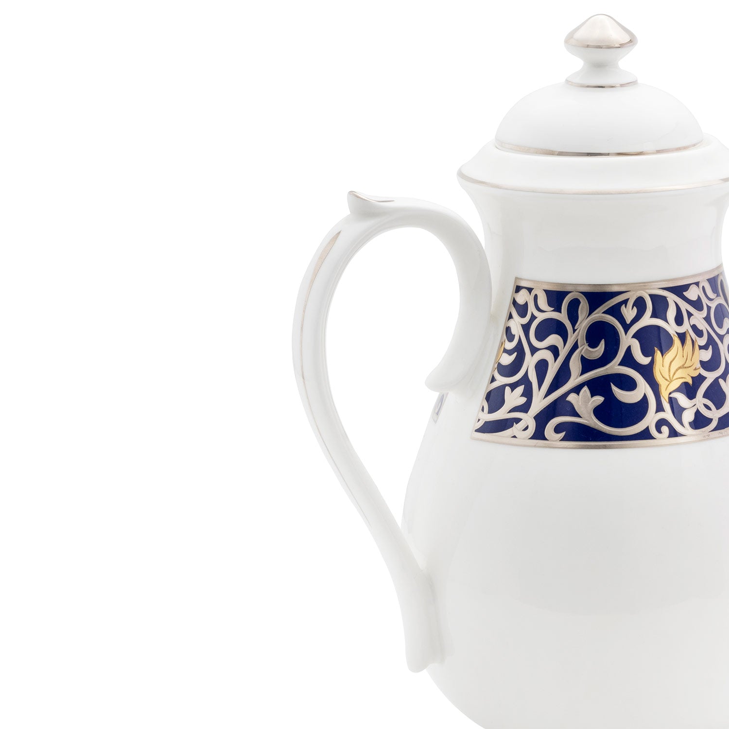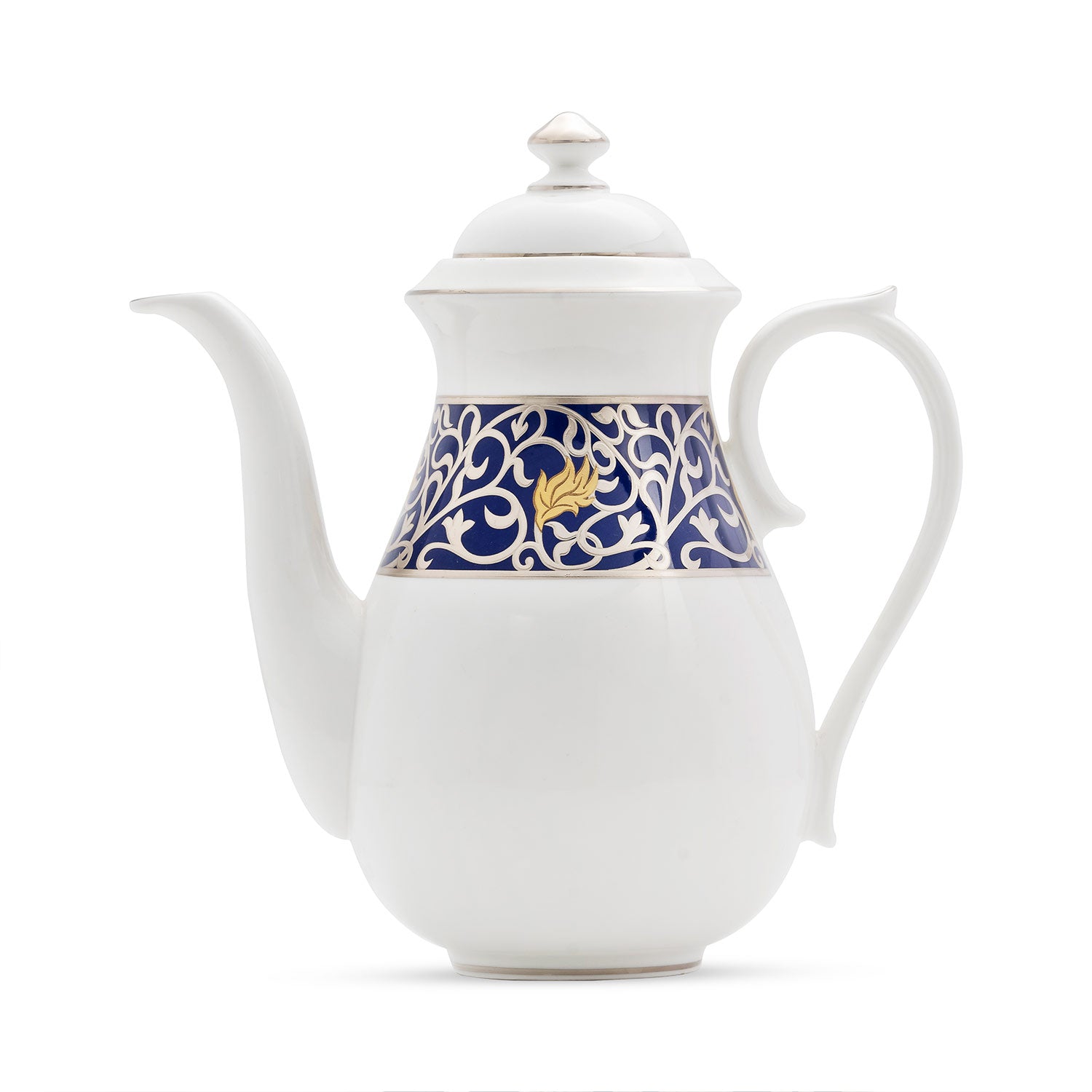 Serve coffee with elegance using the Stewart Coffee Pot. Made from Bone China, it showcases a tree branch design in white over a blue stripe, accented with intricate 24K gold hand-painted details. Perfect for formal occasions or everyday use, this pot combines beauty with functionality.