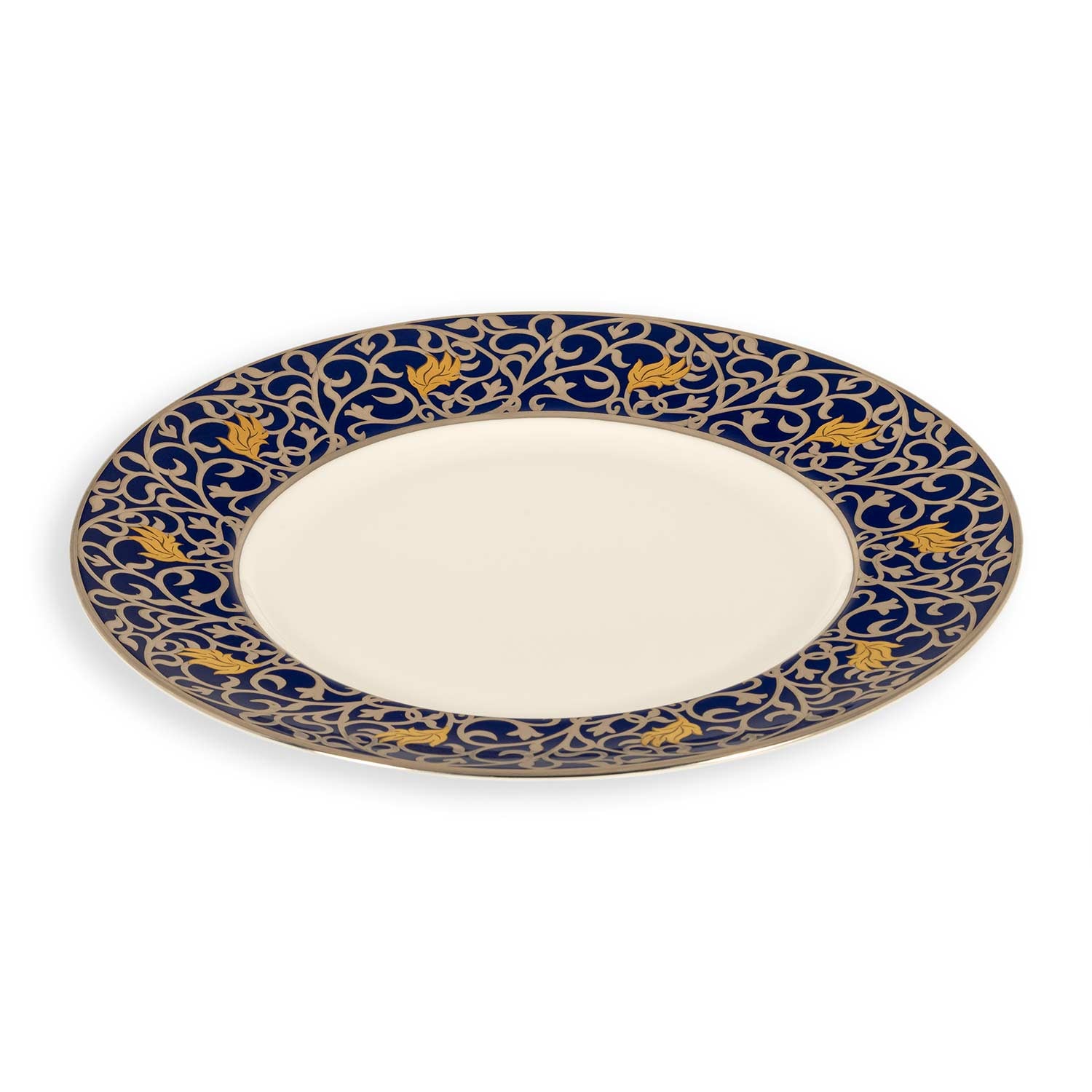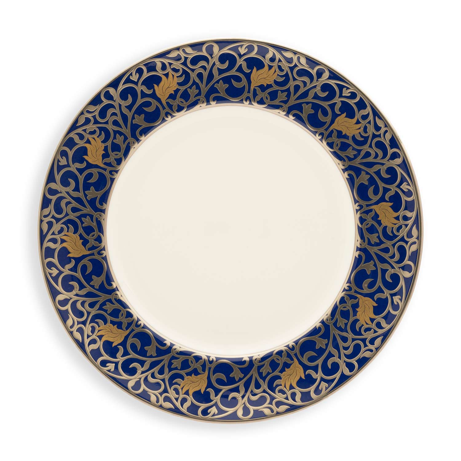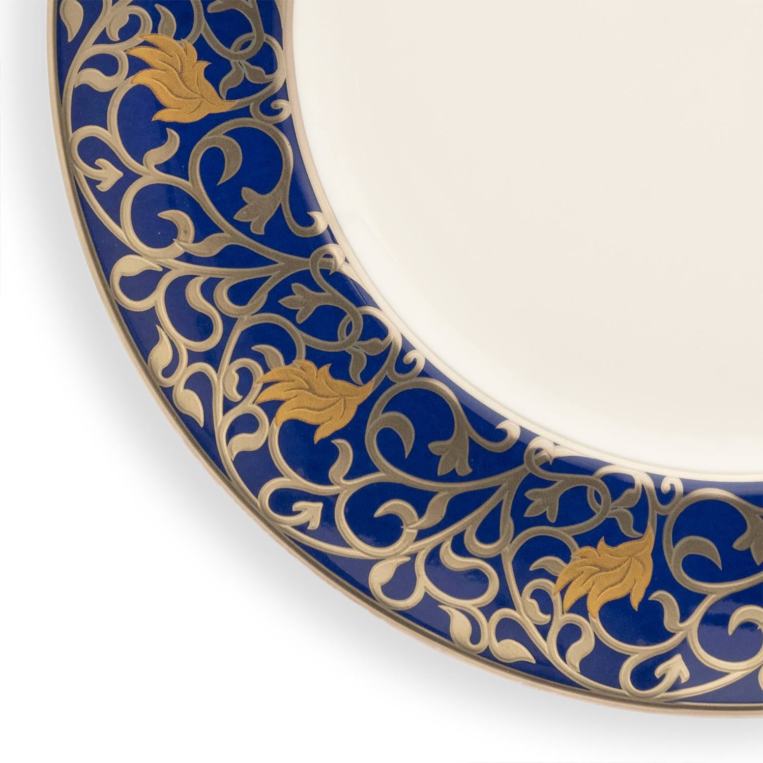 Indulge in elegance with the Stewart Side Plate. Crafted from Bone China, it features an intricate tree branch motif in white against a blue stripe, highlighted by exquisite 24K gold hand-painted accents. Perfect for formal dining affairs, this plate exudes luxury and sophistication.