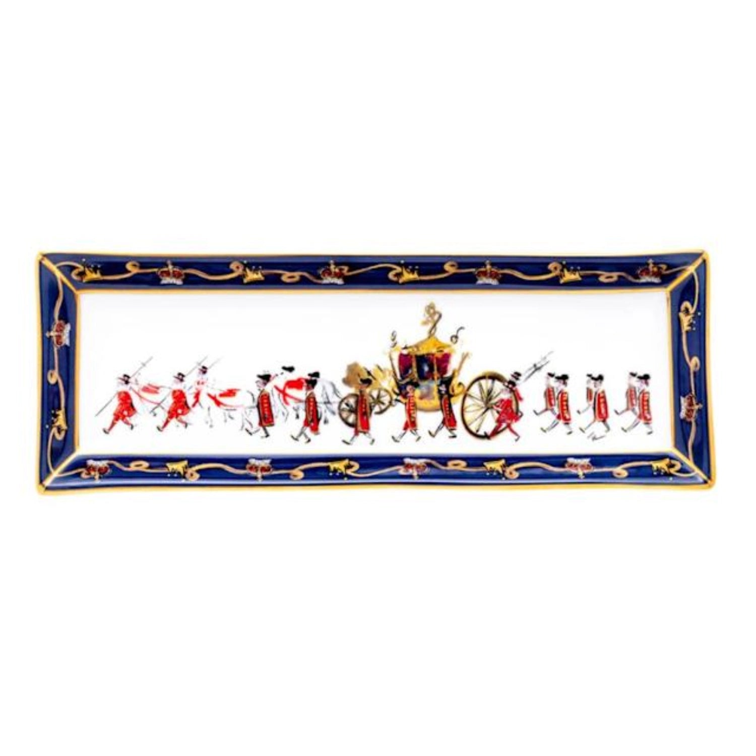 This glorious commemorative pen tray features a vibrant interpretation of The Coronation at Westminster Abbey. Tug Rice's light-hearted design of the pomp and pageantry of the Coronation shows the Gold State Coach arriving at Westminster Abbey: the divine ceremonial home of England’s Kings and Queens for the past thousand years. Our artisans use traditional English pottery skills to craft and decorate this spectacular piece.