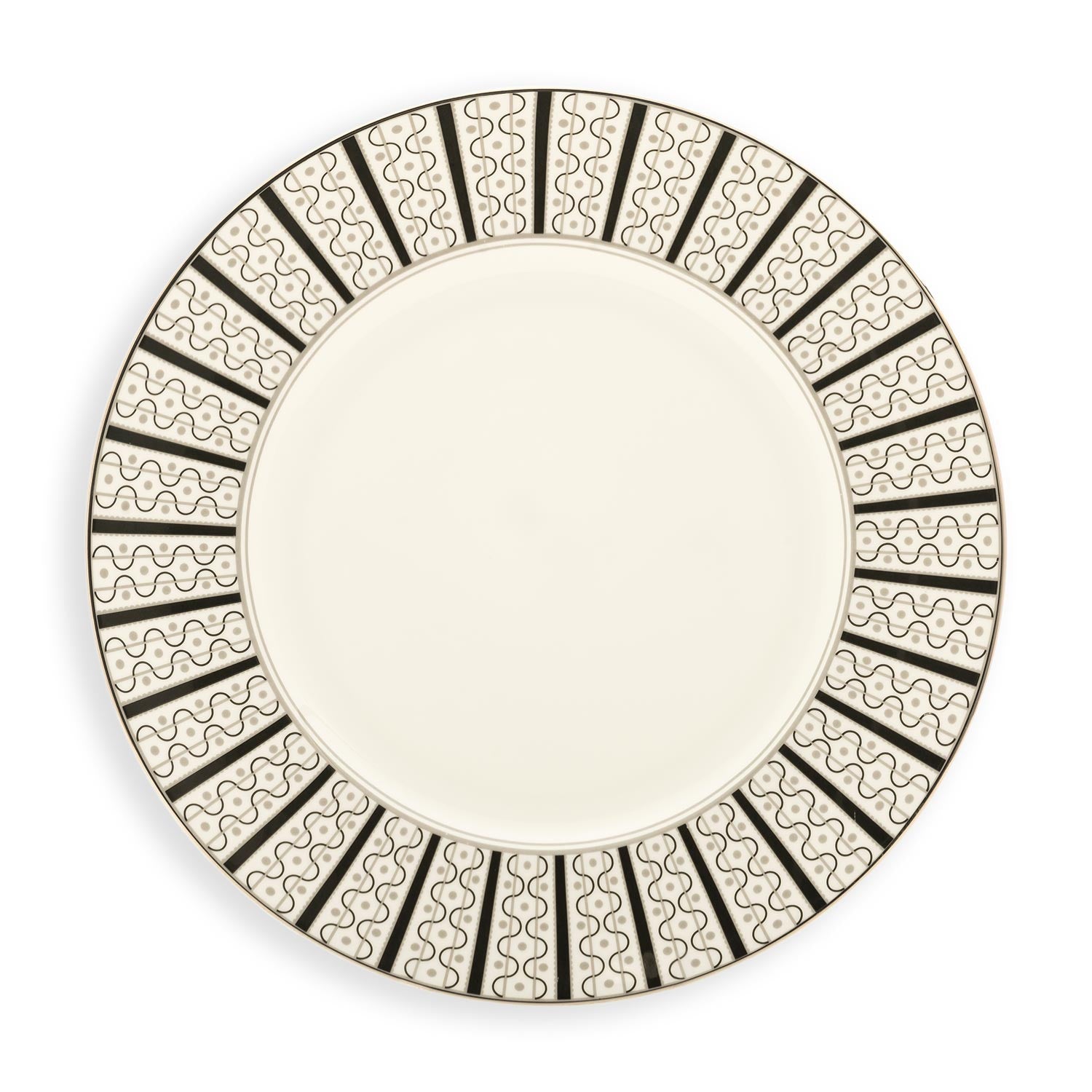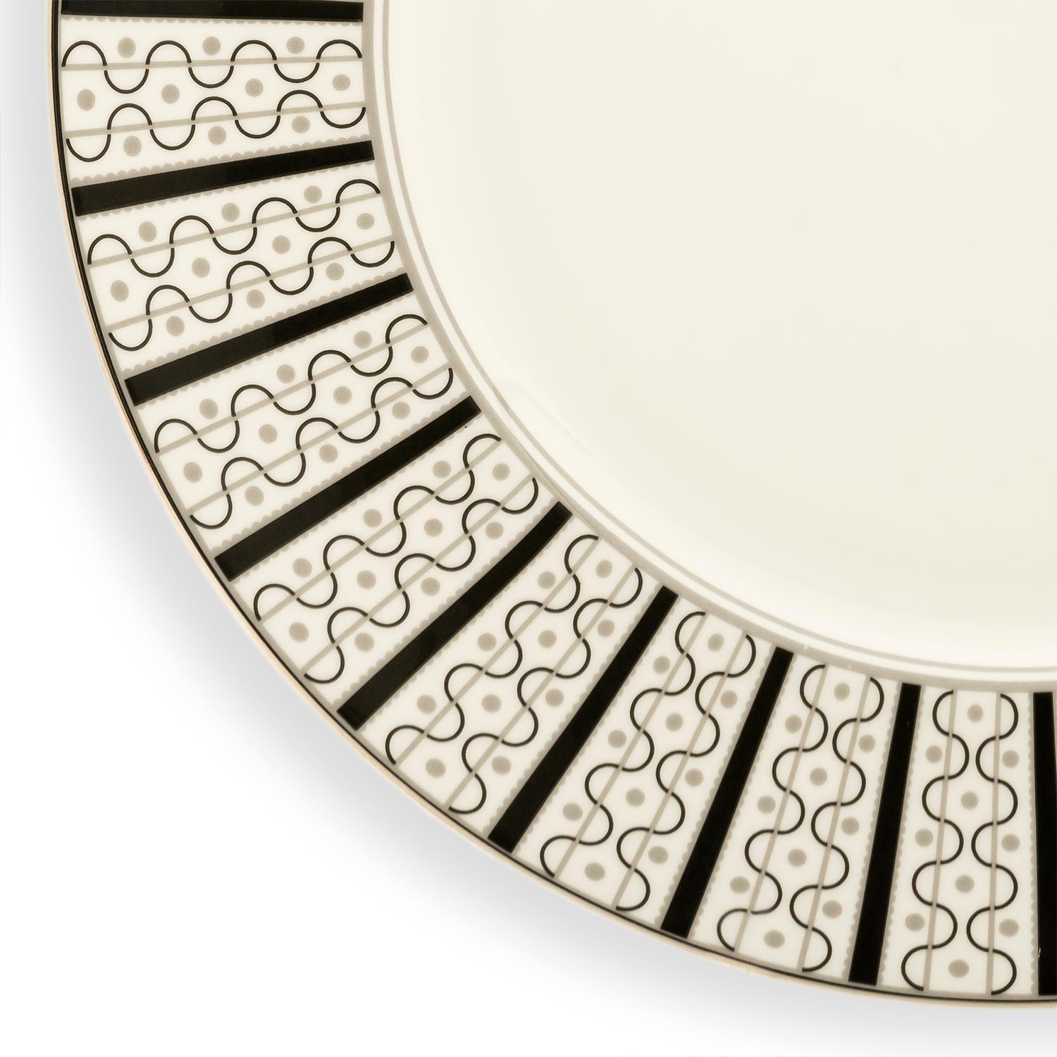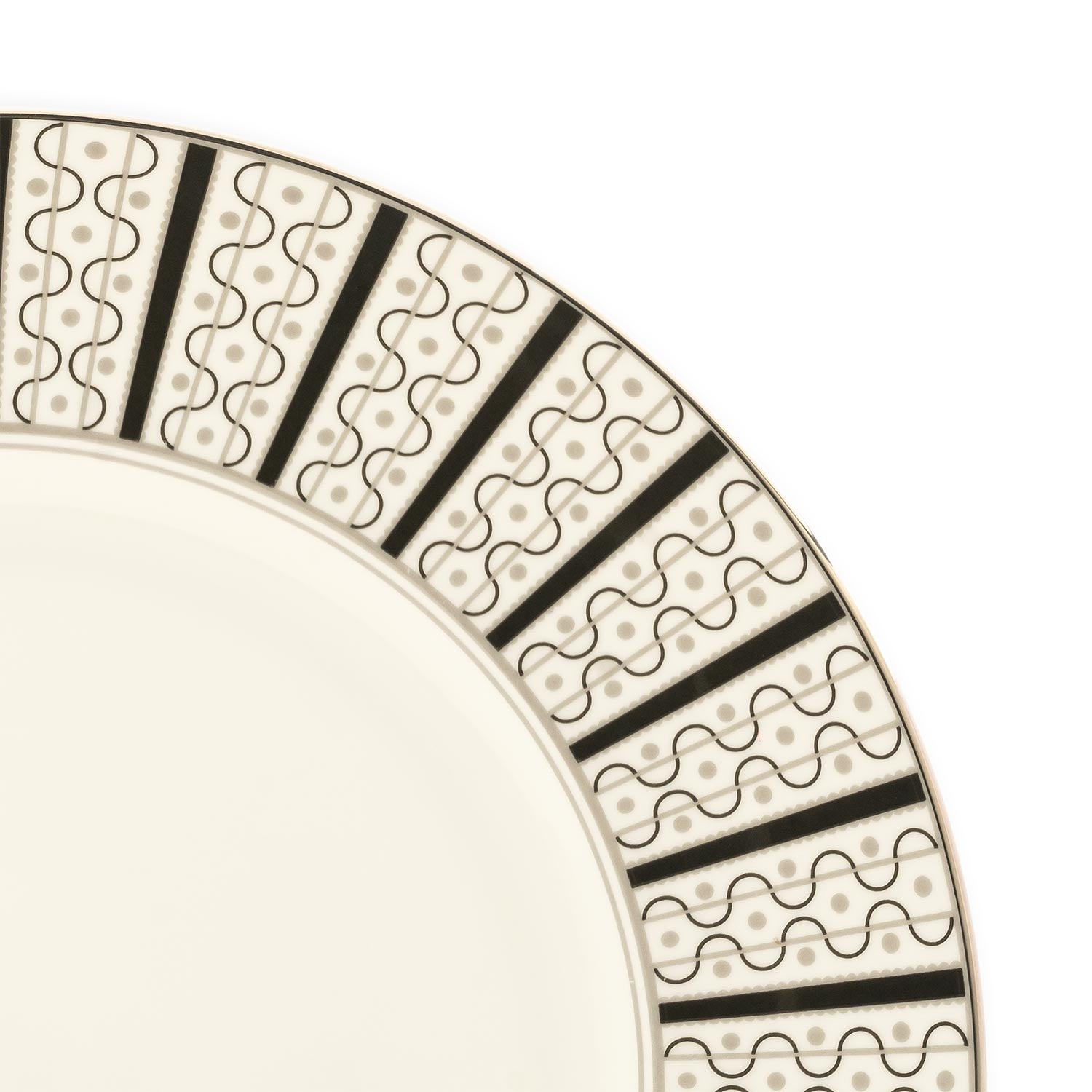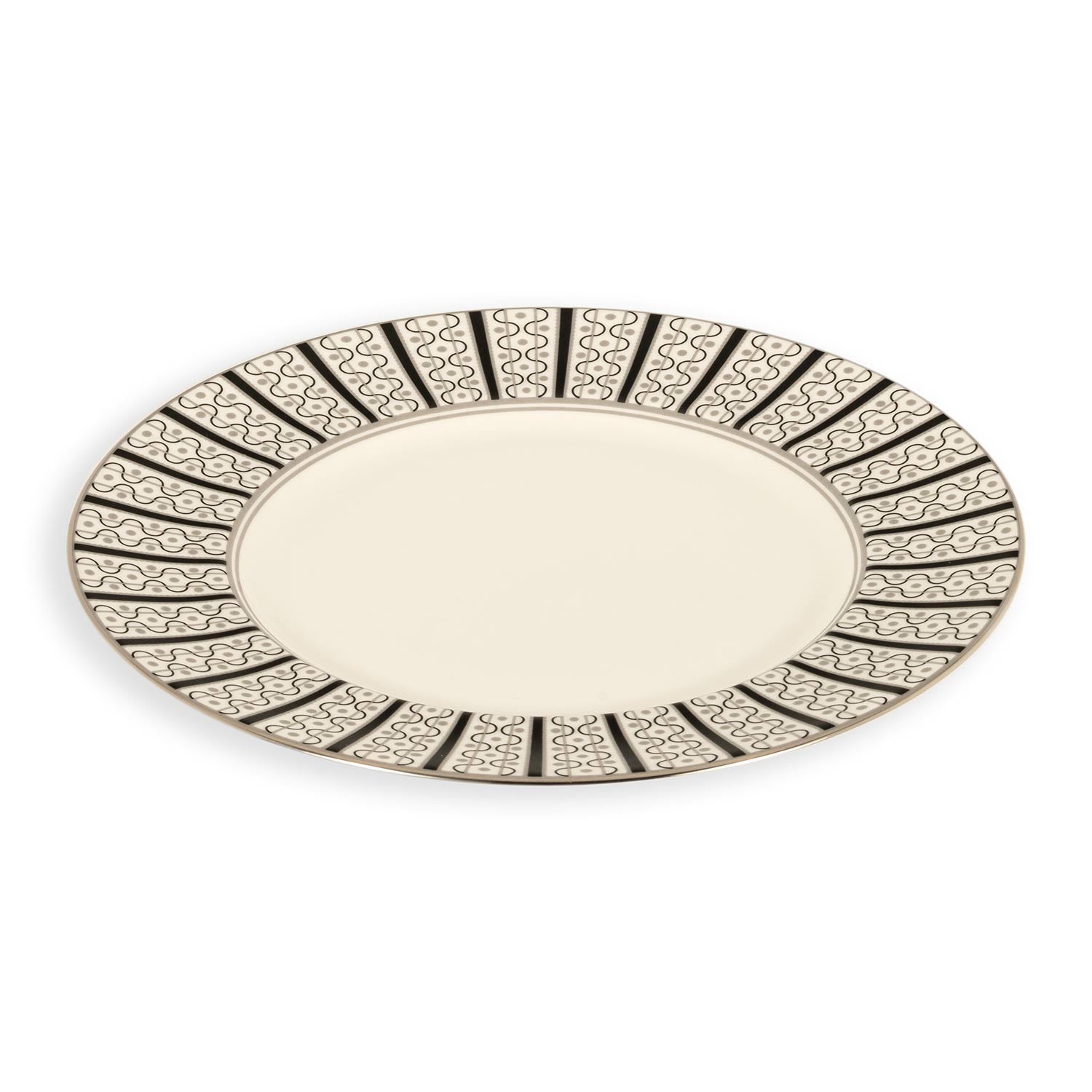 The Velocity Dessert Plate, designed for the Prince of Wales, exudes regal elegance with its hallmark and intricate border featuring symmetrical blue stripes and DNA-inspired designs. Crafted from fine bone china and hand-painted with platinum accents, this plate is a masterpiece fit for royal tables and sophisticated dining settings. Elevate your culinary presentations with this luxurious piece, showcasing impeccable craftsmanship and a design that blends tradition with modern sophistication.