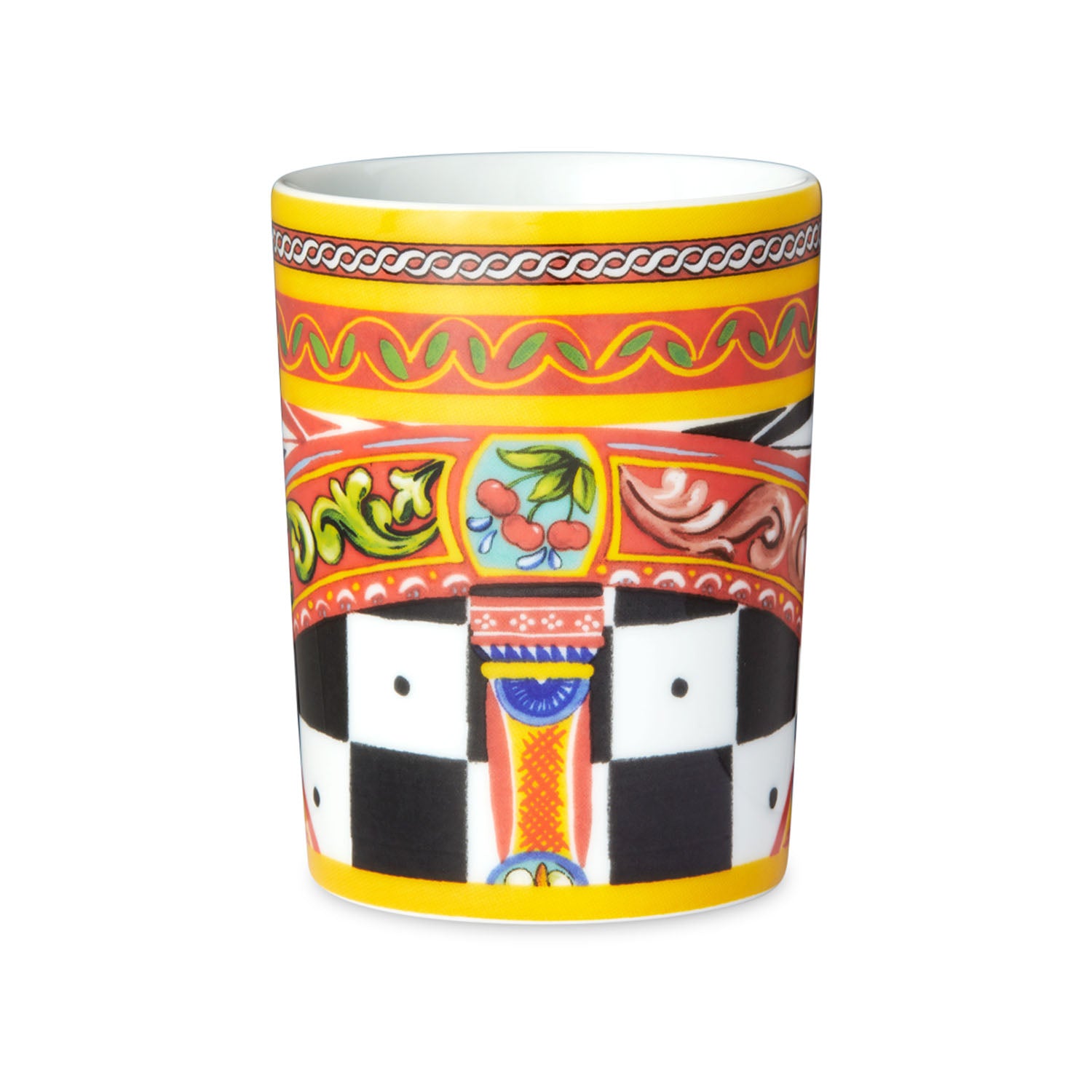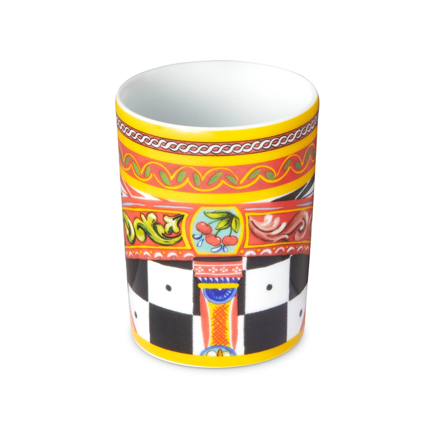 This exquisite porcelain water glass features a stunning design inspired by a traditional foulard print. It captures the essence of Sicilian culture, with its rich heritage, fine craftsmanship, picturesque landscapes, and vibrant colors, all of which epitomize Dolce&Gabbana's renowned aesthetic. Perfect for those who want to showcase their unique style and indulge in a touch of everyday luxury. The glass is adorned with the brand's logo on the base and intricate details, achieved through skilled Italian craftsmanship using a brush and clear glaze. The chosen production technique ensures exceptional durability against scratches and abrasions.